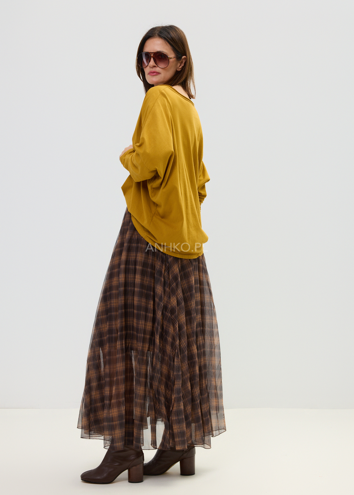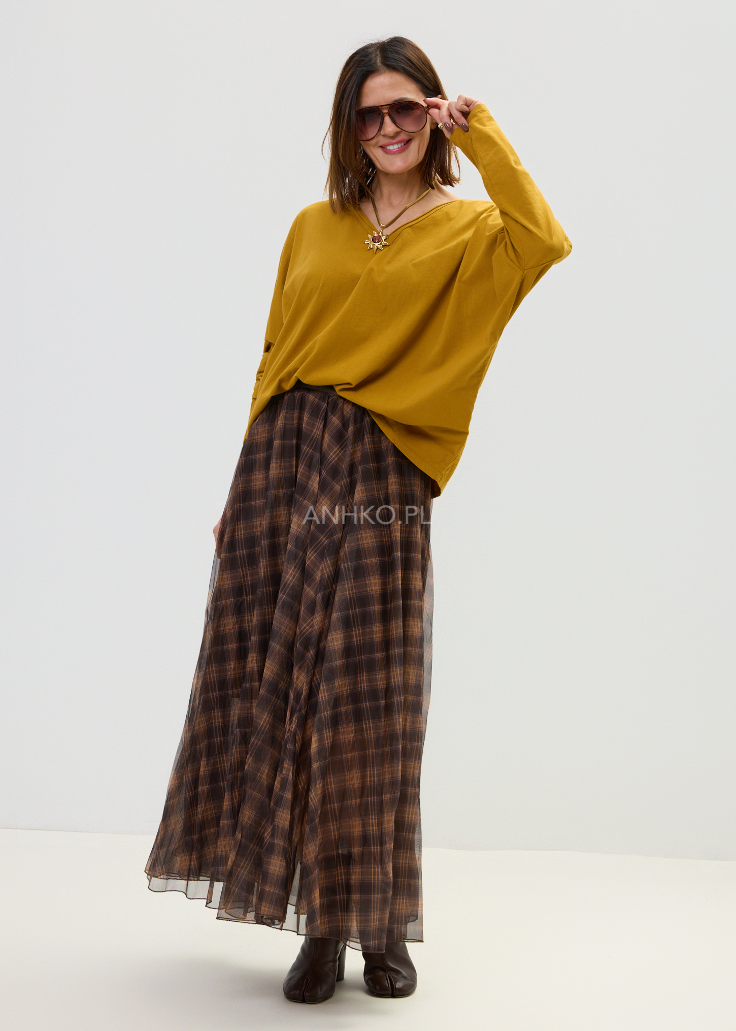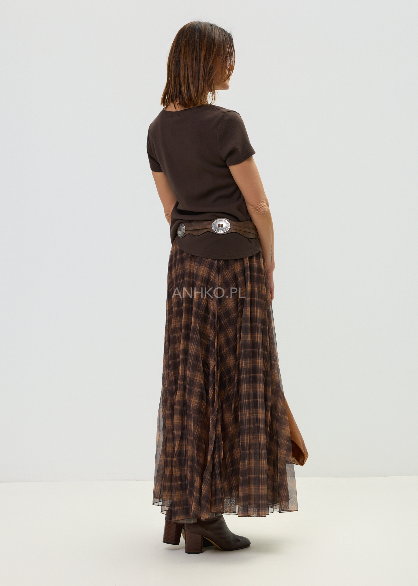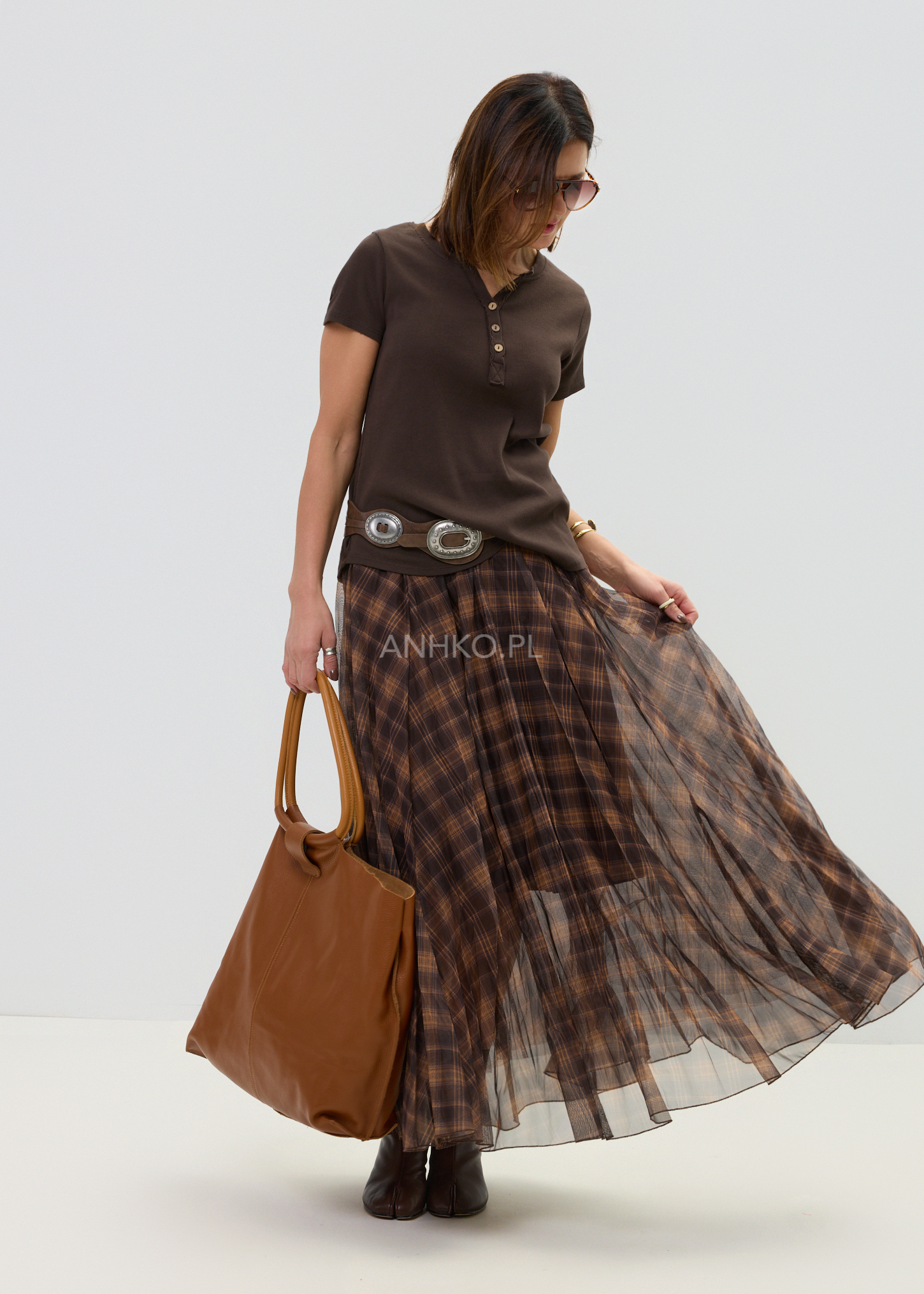 Ta spódnica maxi o rozkloszowanym kroju pięknie układa się na sylwetce i subtelnie pracuje w ruchu. Lekka, półtransparentna warstwa zewnętrzna w ponadczasową kratę w odcieniach brązu i karmelu tworzy elegancki, a jednocześnie swobodny efekt. Dzięki szerokiej, elastycznej talii model komfortowo dopasowuje się do figury, podkreślając jej proporcje bez uczucia ucisku.