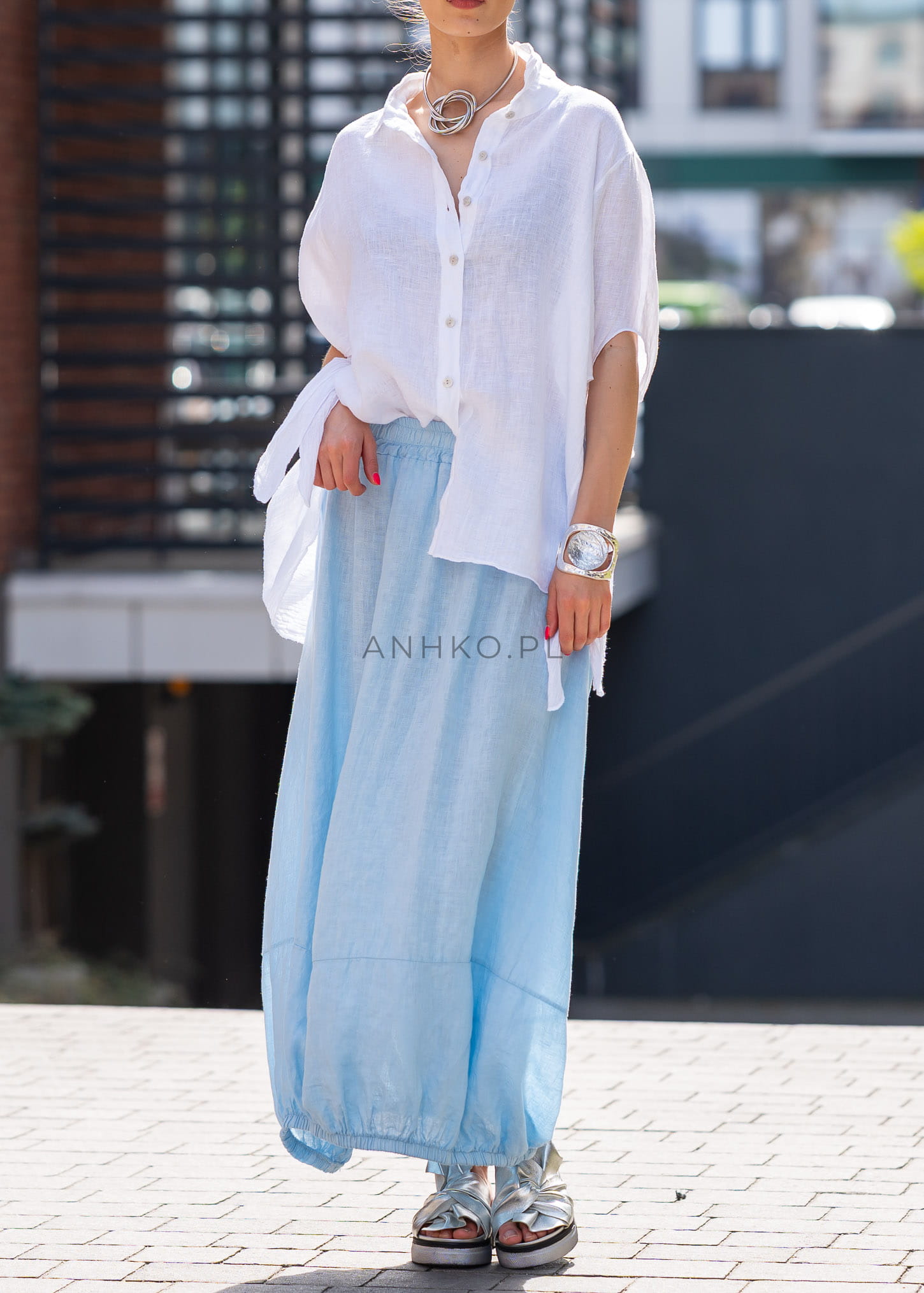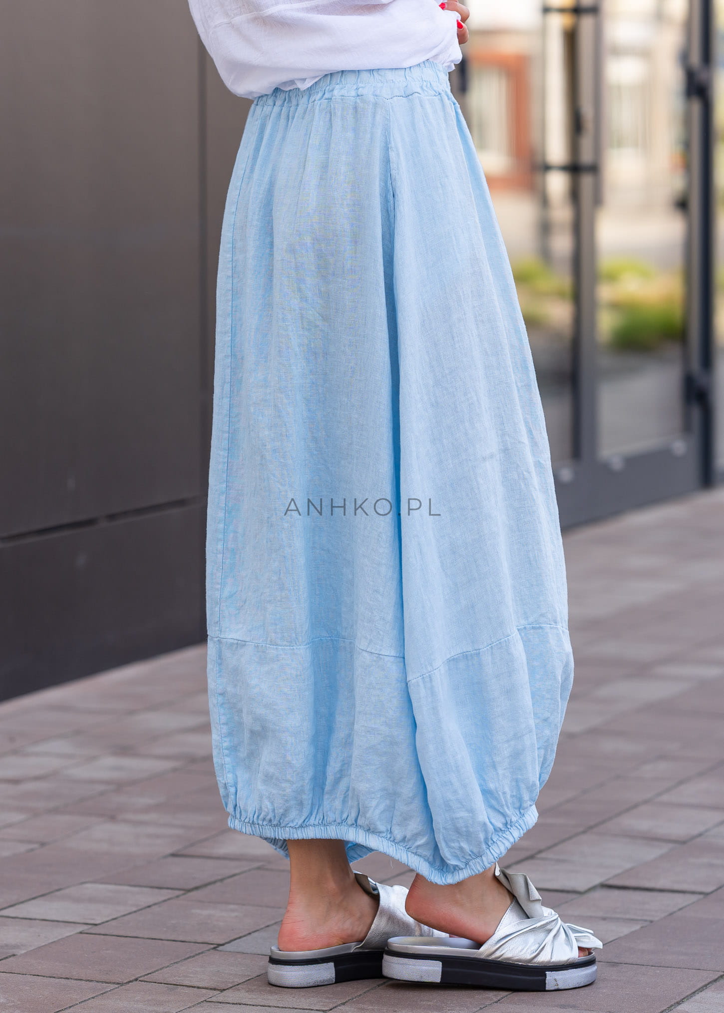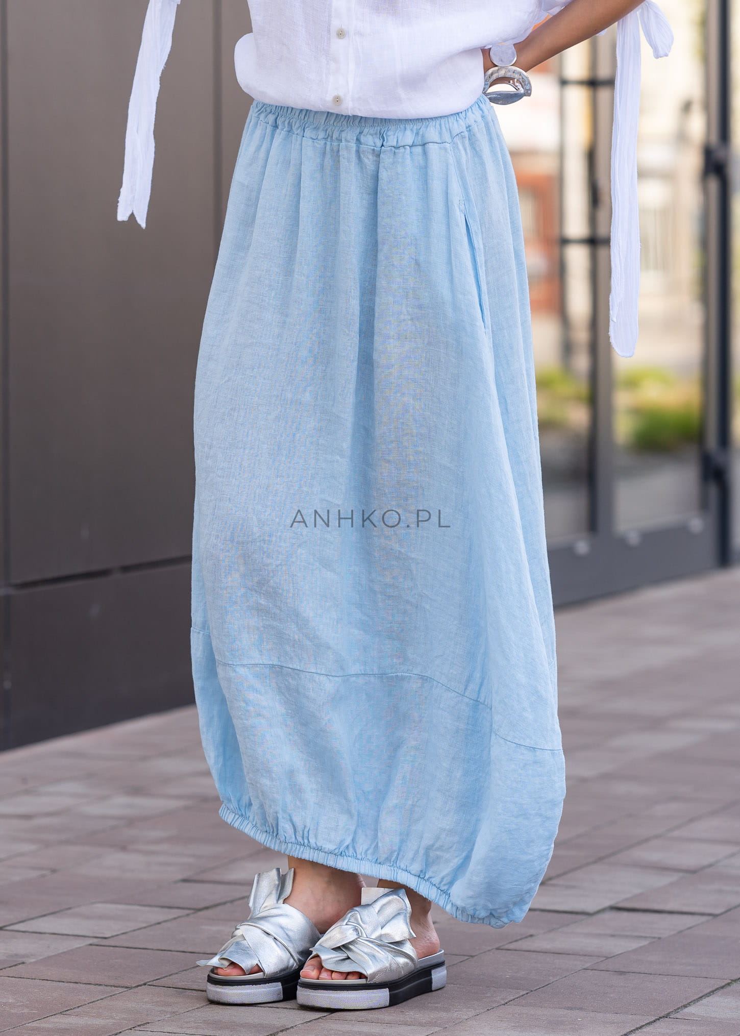 Ta spódnica lniana maxi pięknie układa się na sylwetce, tworząc miękką, lekko balonową linię, która nadaje stylizacji charakteru i luzu. Elastyczna talia dopasowuje się do figury, a luźny fason zapewnia pełną swobodę ruchów. Naturalny len w subtelnym odcieniu błękitu podkreśla świeżość stylizacji, a gumka w pasie i marszczony dół dodają całości nowoczesnej objętości.