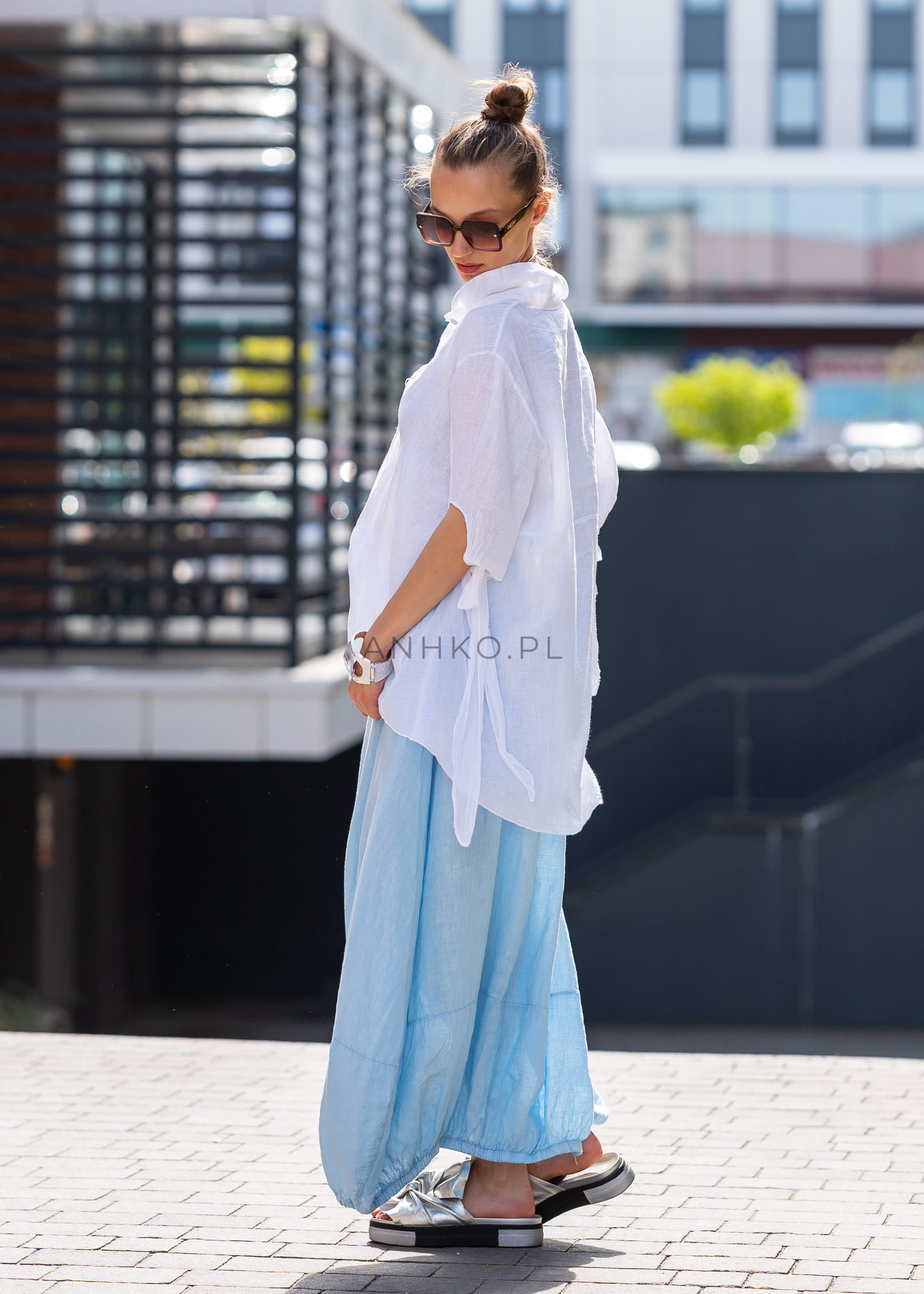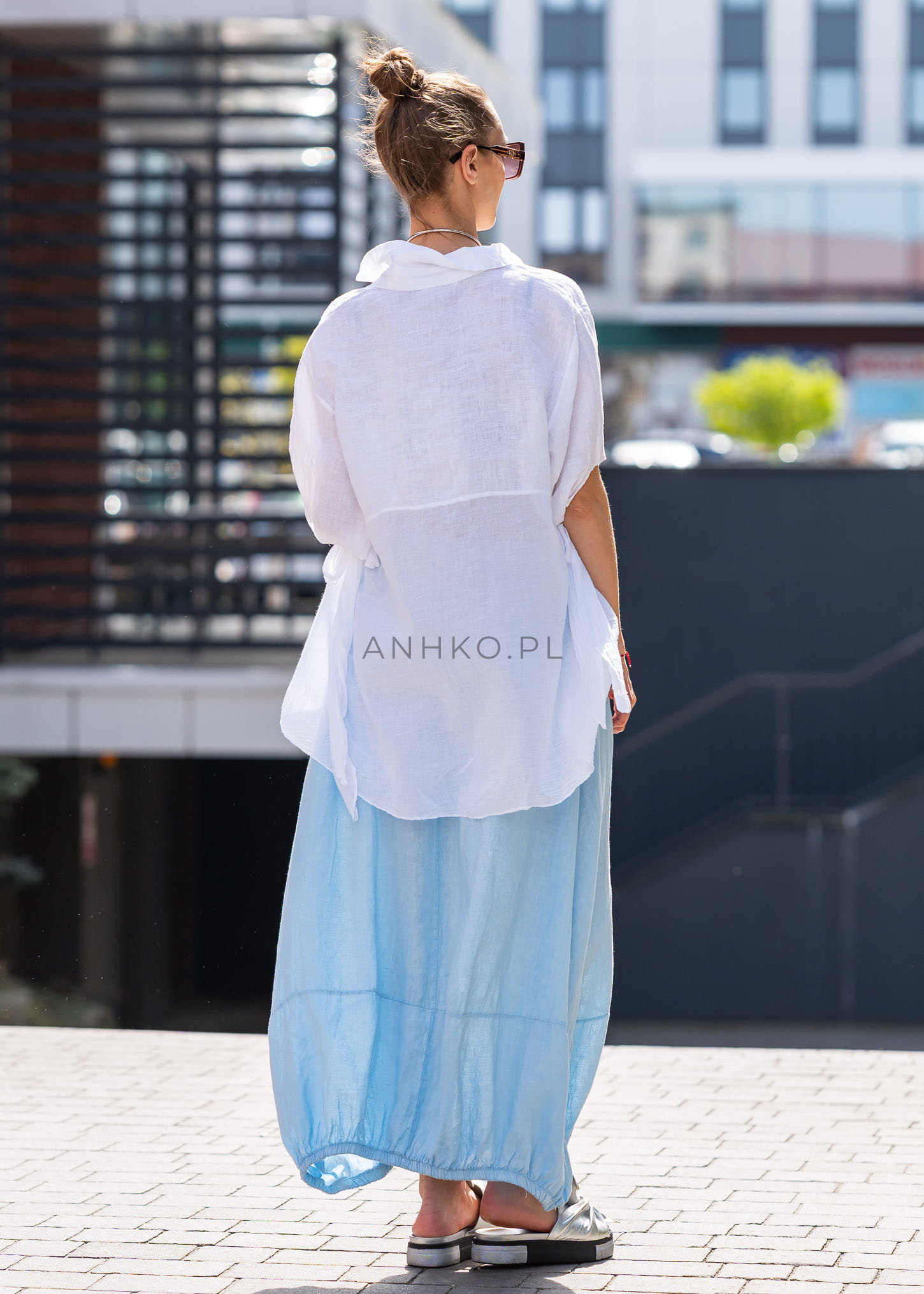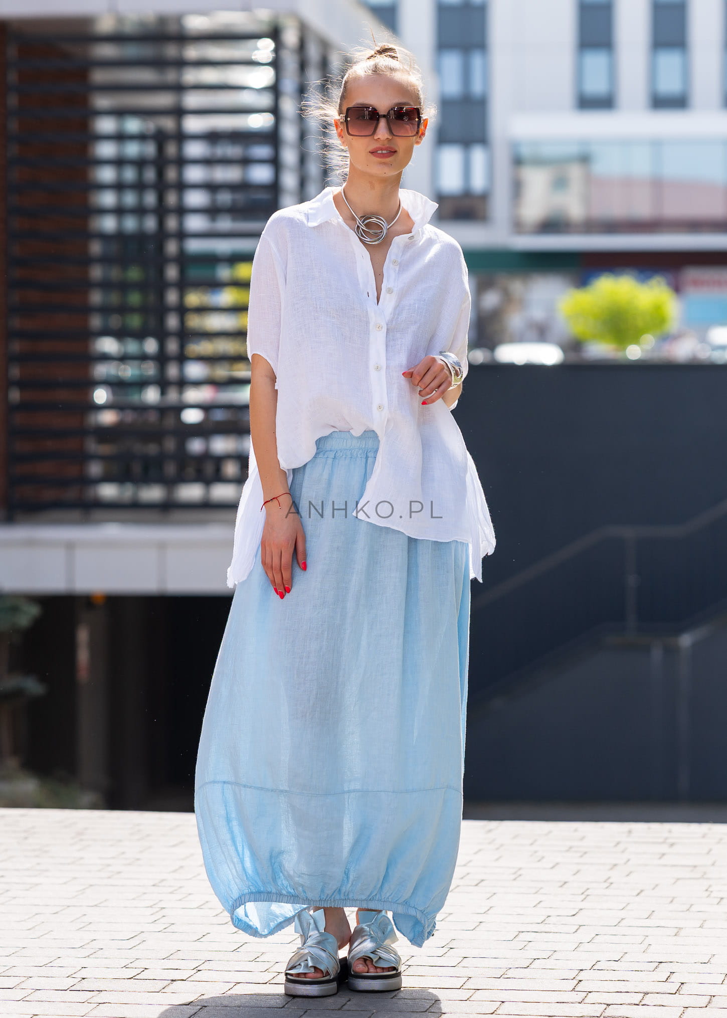 Ta spódnica lniana maxi pięknie układa się na sylwetce, tworząc miękką, lekko balonową linię, która nadaje stylizacji charakteru i luzu. Elastyczna talia dopasowuje się do figury, a luźny fason zapewnia pełną swobodę ruchów. Naturalny len w subtelnym odcieniu błękitu podkreśla świeżość stylizacji, a gumka w pasie i marszczony dół dodają całości nowoczesnej objętości.
