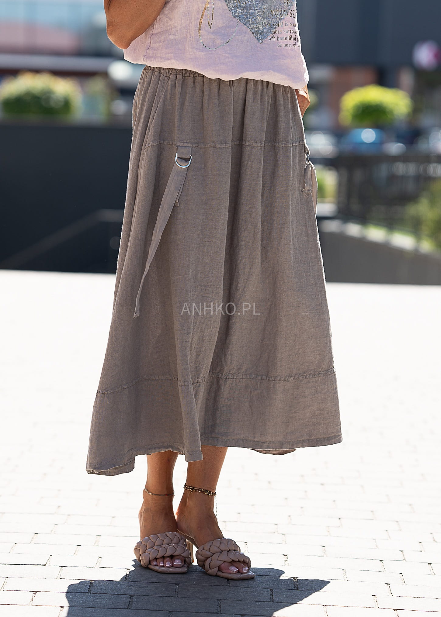 To luźna spódnica o długości midi wykonana w 100% z naturalnego lnu. Delikatnie rozkloszowany krój i elastyczna talia zapewniają wygodę i swobodę ruchów, a ozdobne taśmy i metalowe kółka dodają jej oryginalnego charakteru. Dzięki wszytym kieszeniom i lekkiej strukturze tkaniny idealnie sprawdzi się w codziennych stylizacjach — od miejskich spacerów po weekendowe wypady na łono natury. Świetnie komponuje się z lekkimi topami, lnianymi koszulami i sandałami. Stylowa propozycja na lato, która podkreśla naturalność i swobodę.