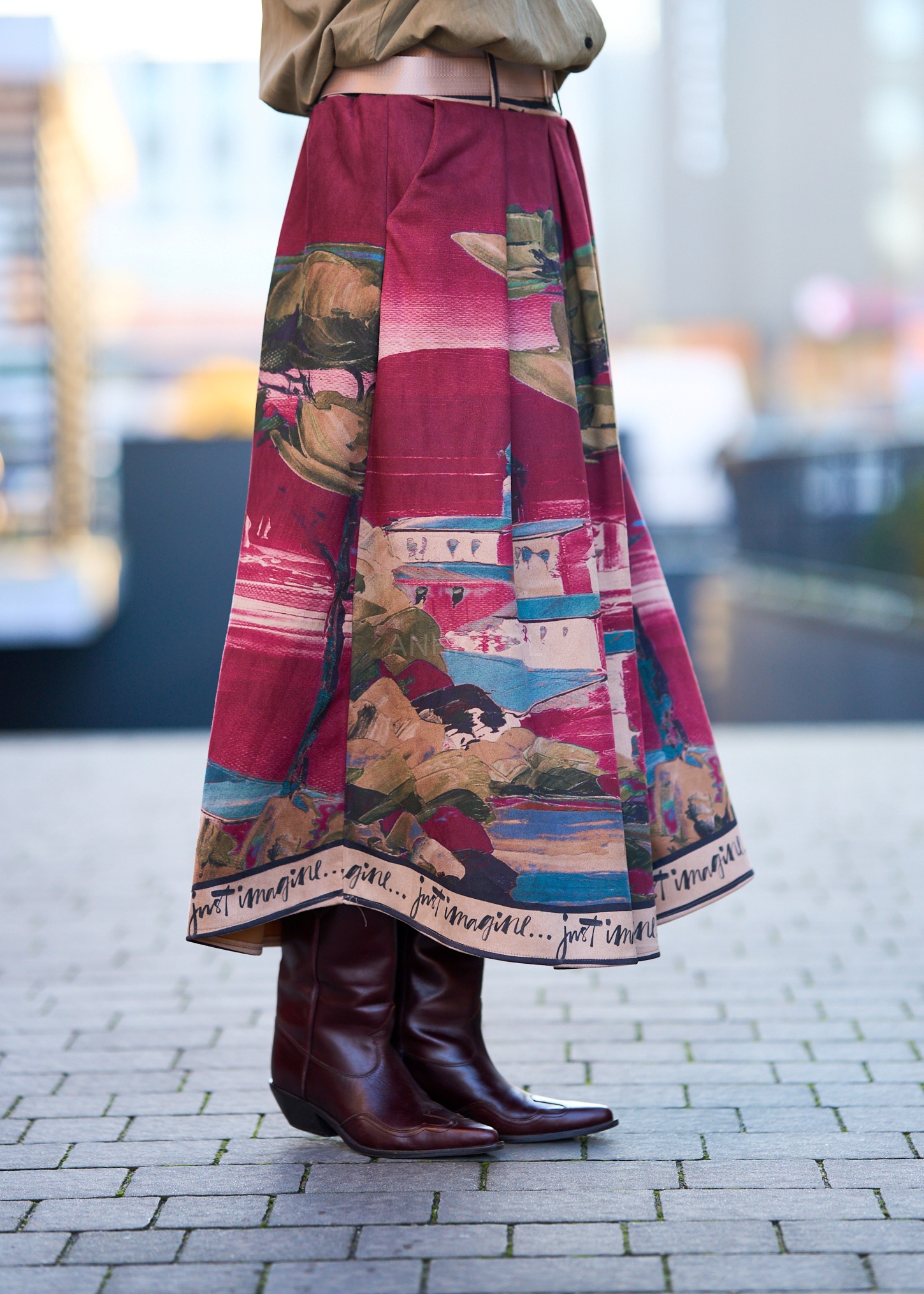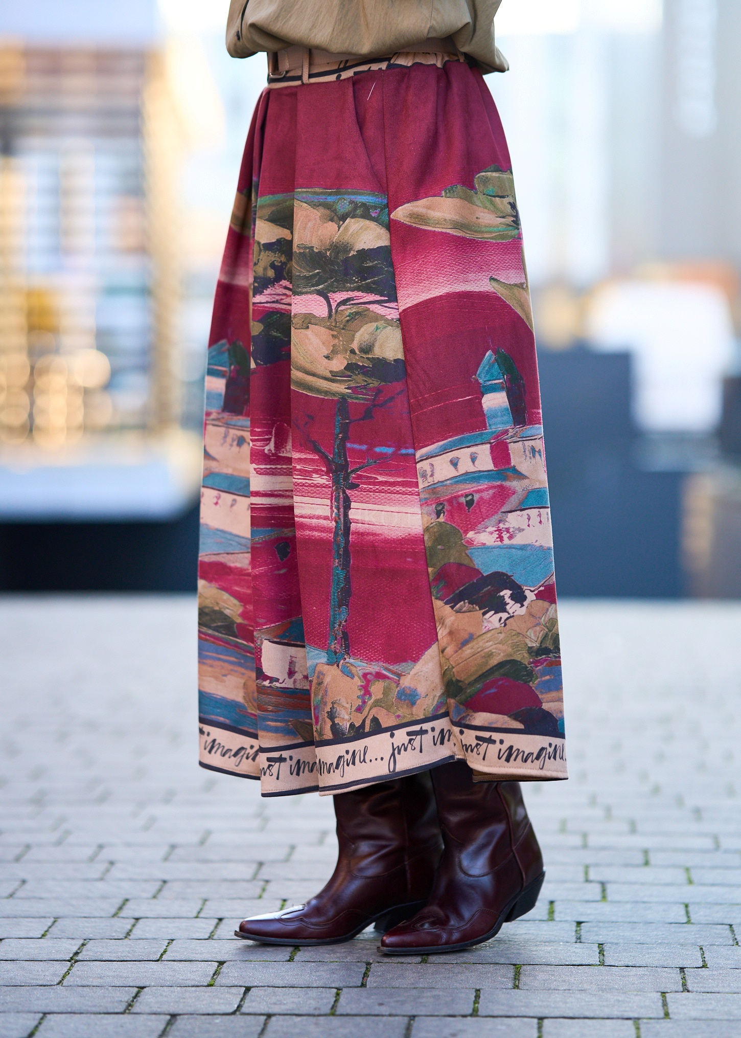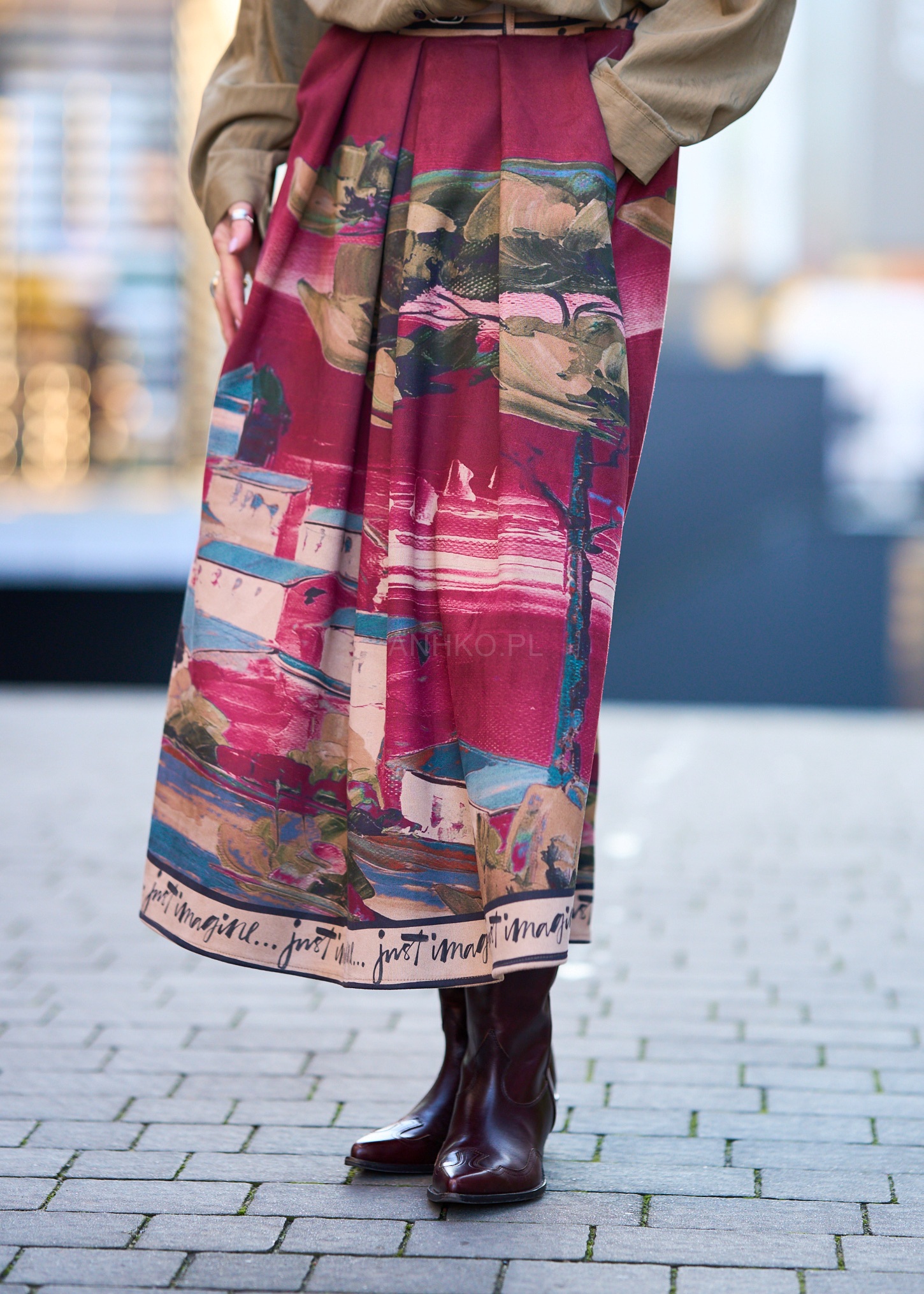 Ta designerska spódnica to połączenie wygody i artystycznego wyrazu. Wykonana z miękkiego, lejącego materiału, pięknie układa się w ruchu i zapewnia komfort noszenia przez cały dzień. Elastyczna talia dopasowuje się do sylwetki, a dekoracyjny pasek z regulacją dodaje nowoczesnego charakteru i pozwala na indywidualne stylizowanie. Model posiada praktyczne kieszenie po bokach oraz brak podszewki, dzięki czemu jest lekki i przewiewny. Doskonale sprawdzi się w codziennych stylizacjach, na spotkania, spacery, wyjazdy czy artystyczne eventy. Świetnie wygląda zarówno z prostym topem, jak i dzianinowym swetrem lub koszulą.