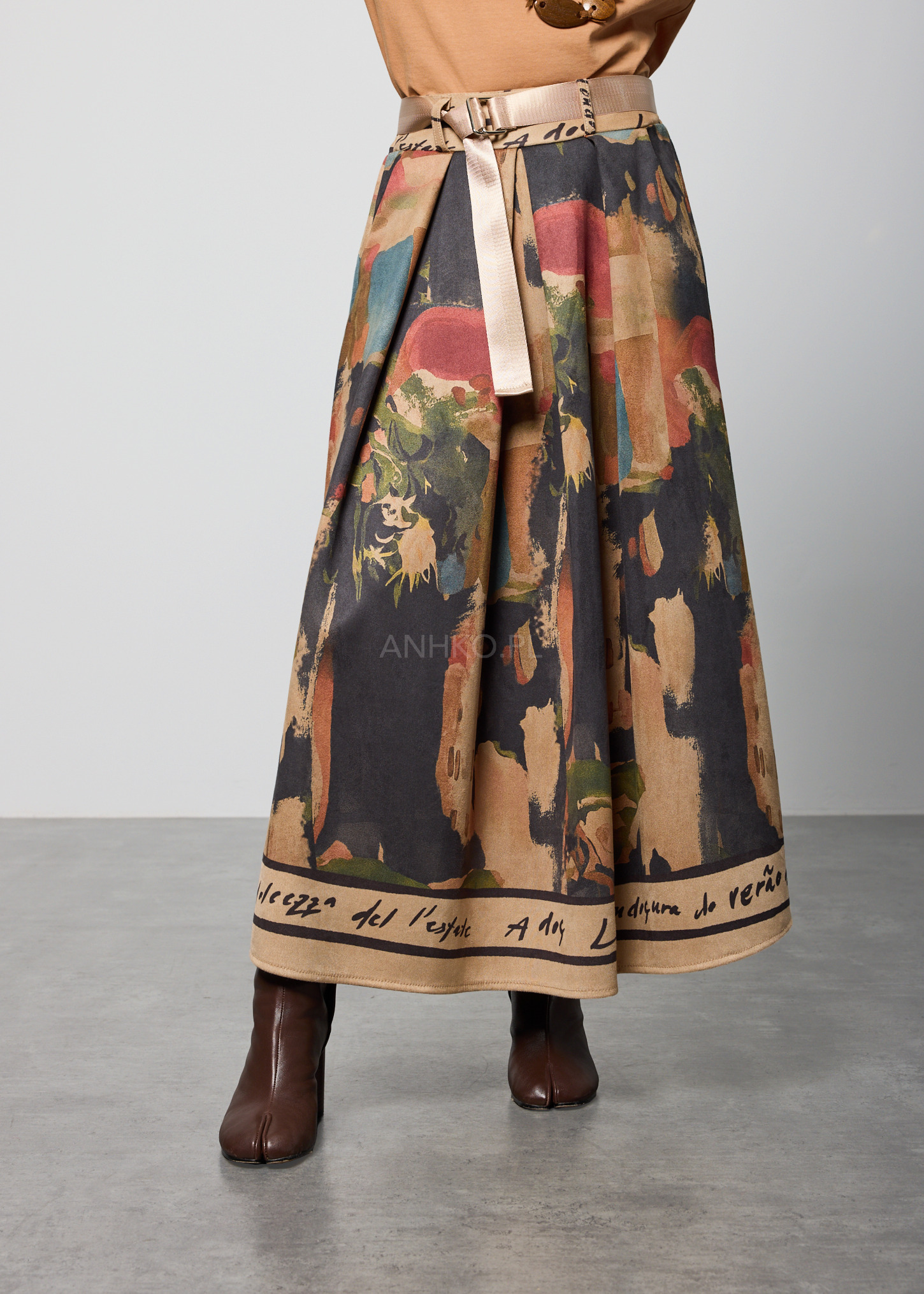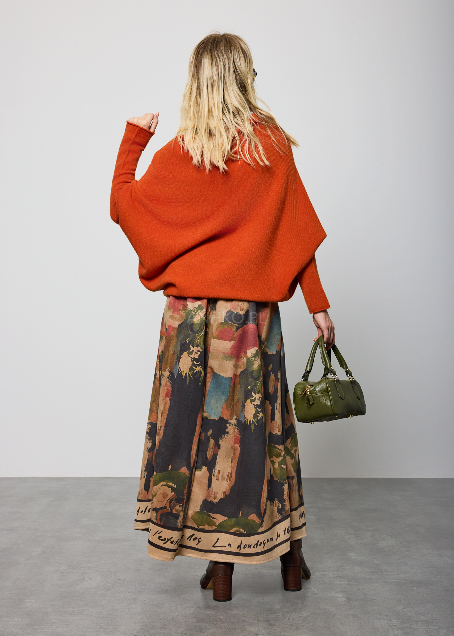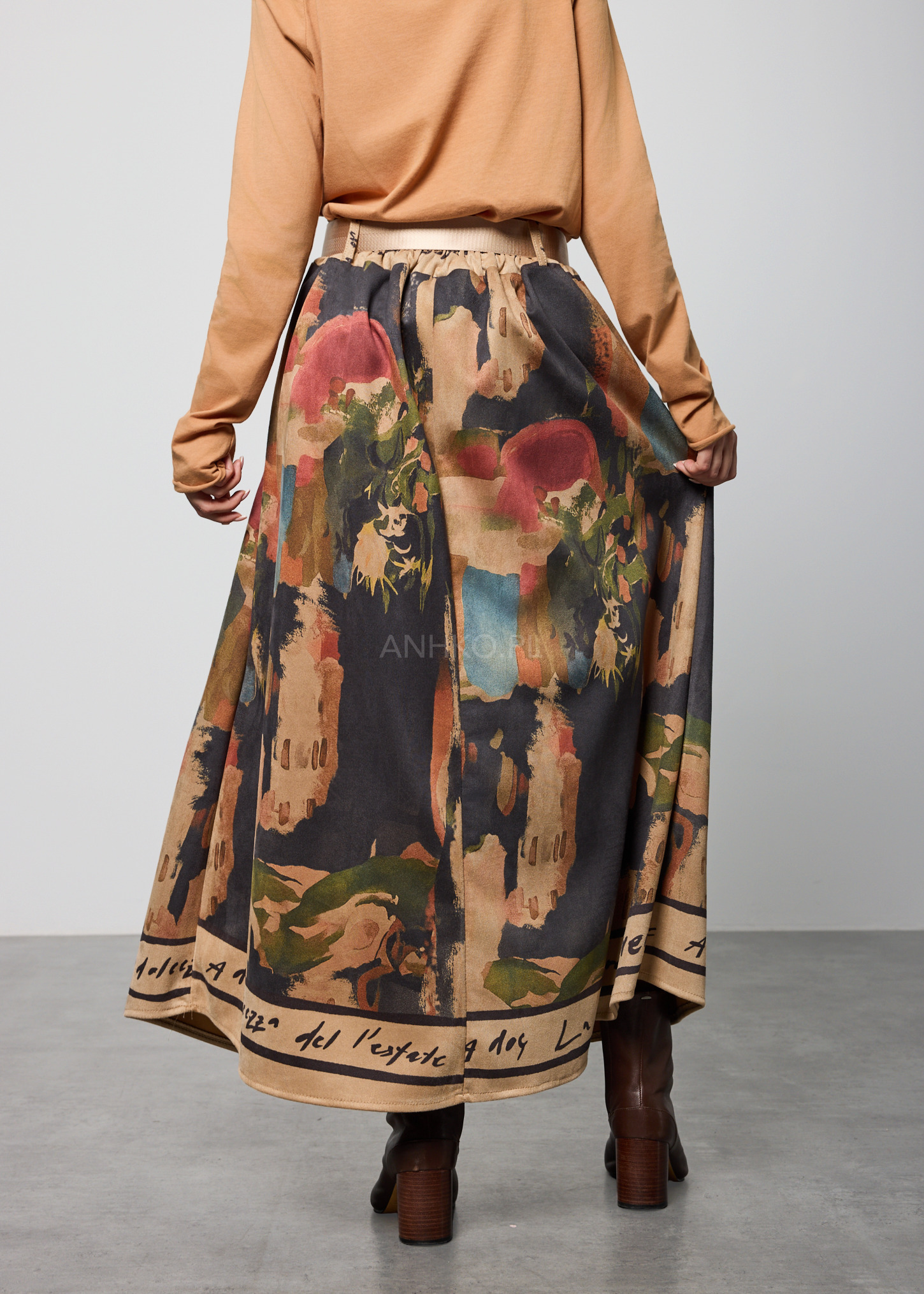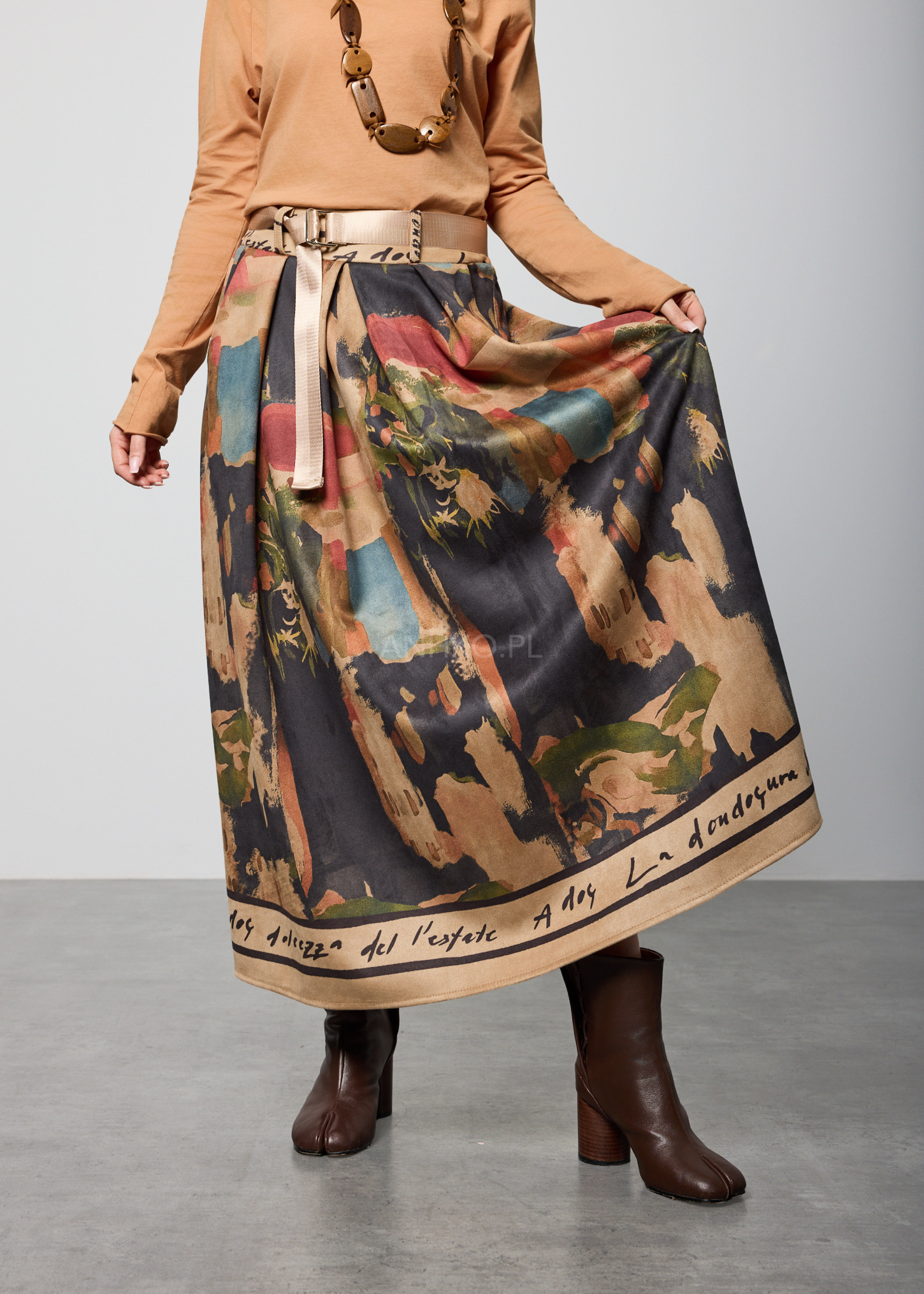 Ta designerska spódnica to połączenie wygody i artystycznego wyrazu. Wykonana z miękkiego, lejącego materiału, pięknie układa się w ruchu i zapewnia komfort noszenia przez cały dzień. Elastyczna talia dopasowuje się do sylwetki, a dekoracyjny pasek z regulacją dodaje nowoczesnego charakteru i pozwala na indywidualne stylizowanie. Model posiada praktyczne kieszenie po bokach oraz brak podszewki, dzięki czemu jest lekki i przewiewny. Doskonale sprawdzi się w codziennych stylizacjach, na spotkania, spacery, wyjazdy czy artystyczne eventy. Świetnie wygląda zarówno z prostym topem, jak i dzianinowym swetrem lub koszulą.