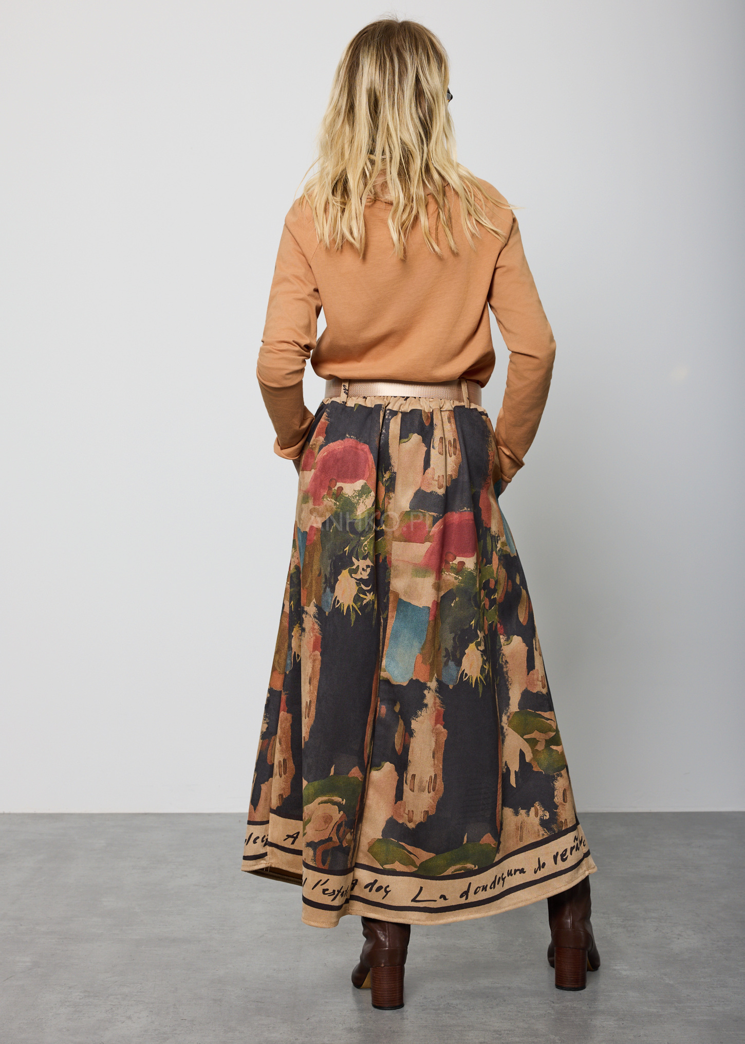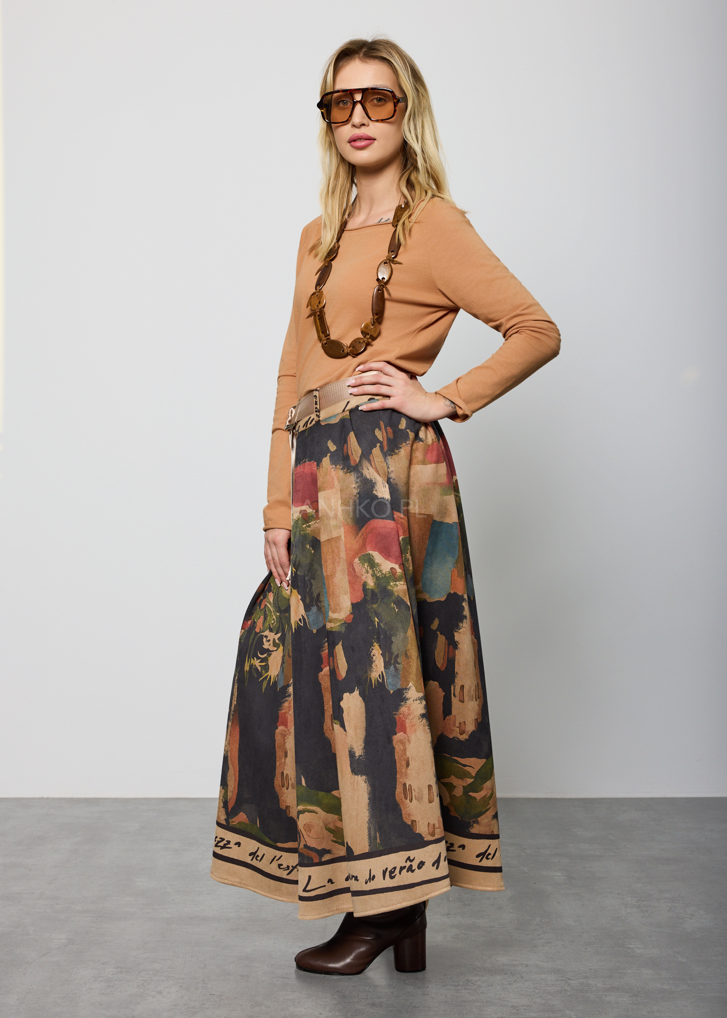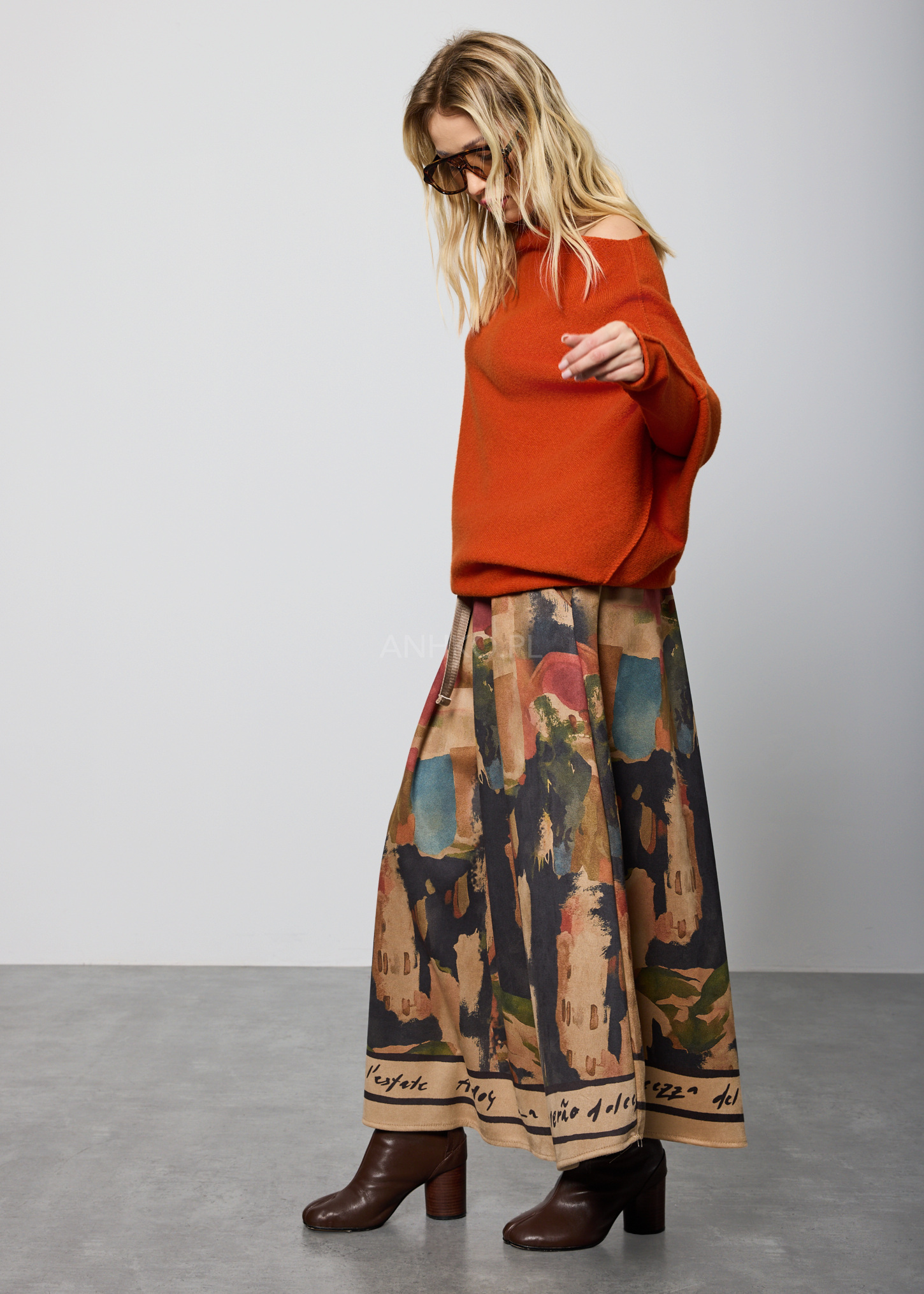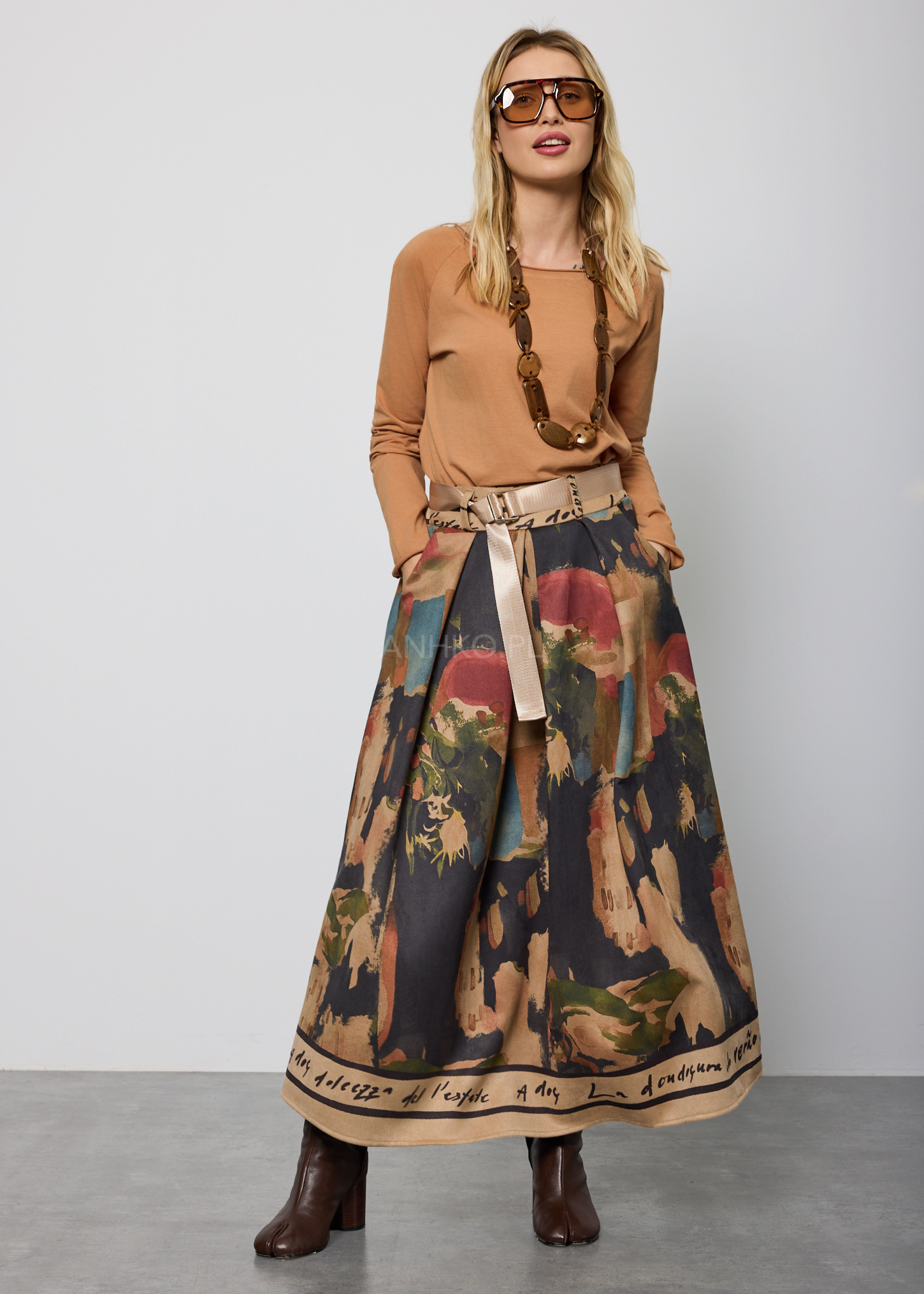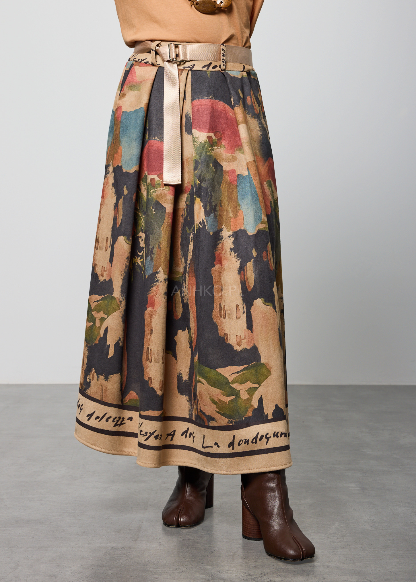 Ta designerska spódnica to połączenie wygody i artystycznego wyrazu. Wykonana z miękkiego, lejącego materiału, pięknie układa się w ruchu i zapewnia komfort noszenia przez cały dzień. Elastyczna talia dopasowuje się do sylwetki, a dekoracyjny pasek z regulacją dodaje nowoczesnego charakteru i pozwala na indywidualne stylizowanie. Model posiada praktyczne kieszenie po bokach oraz brak podszewki, dzięki czemu jest lekki i przewiewny. Doskonale sprawdzi się w codziennych stylizacjach, na spotkania, spacery, wyjazdy czy artystyczne eventy. Świetnie wygląda zarówno z prostym topem, jak i dzianinowym swetrem lub koszulą.