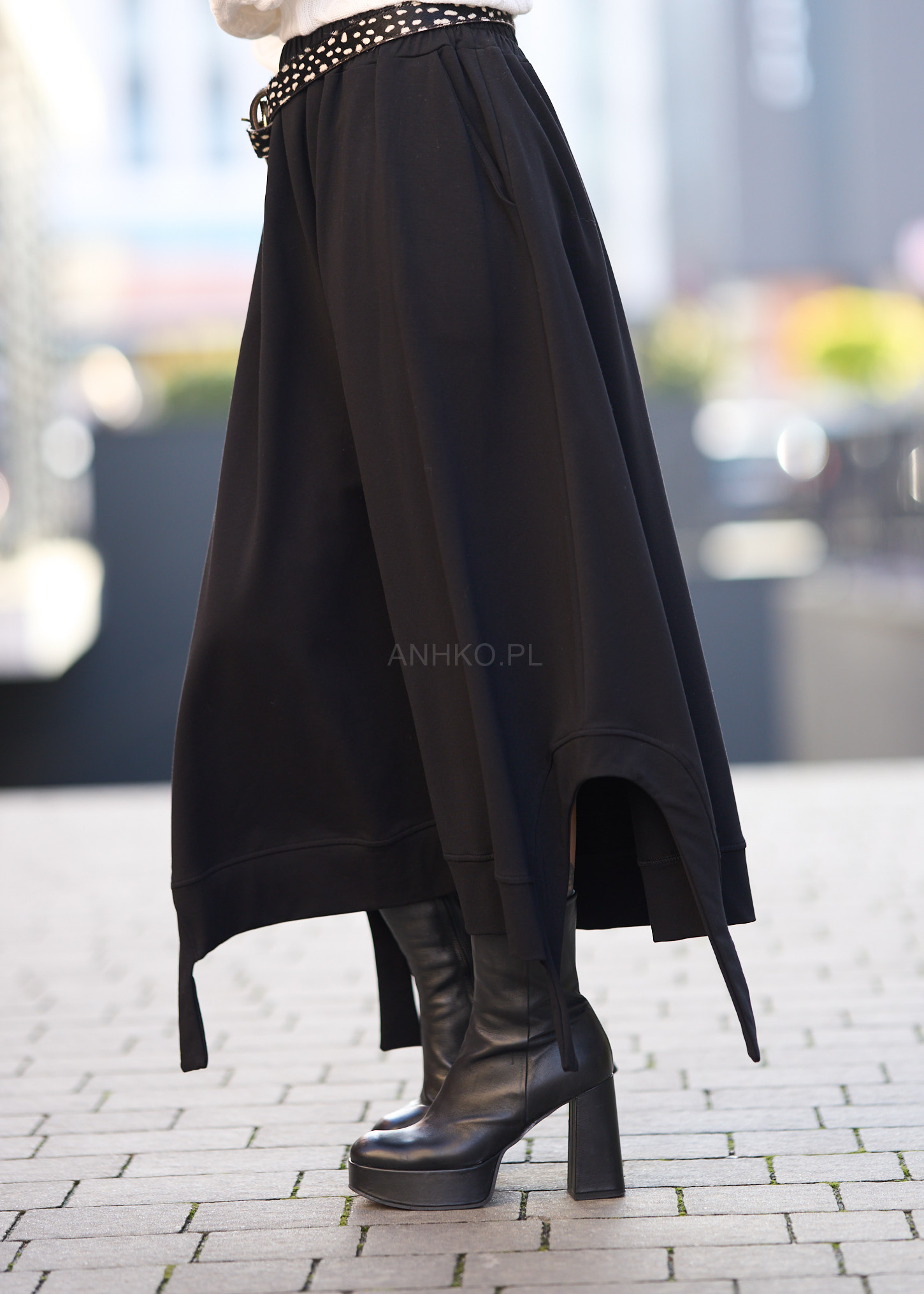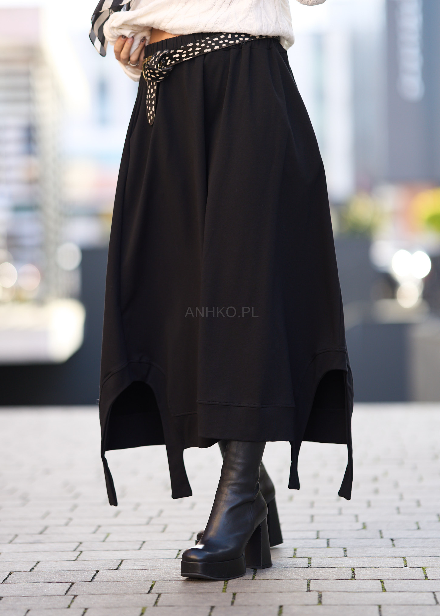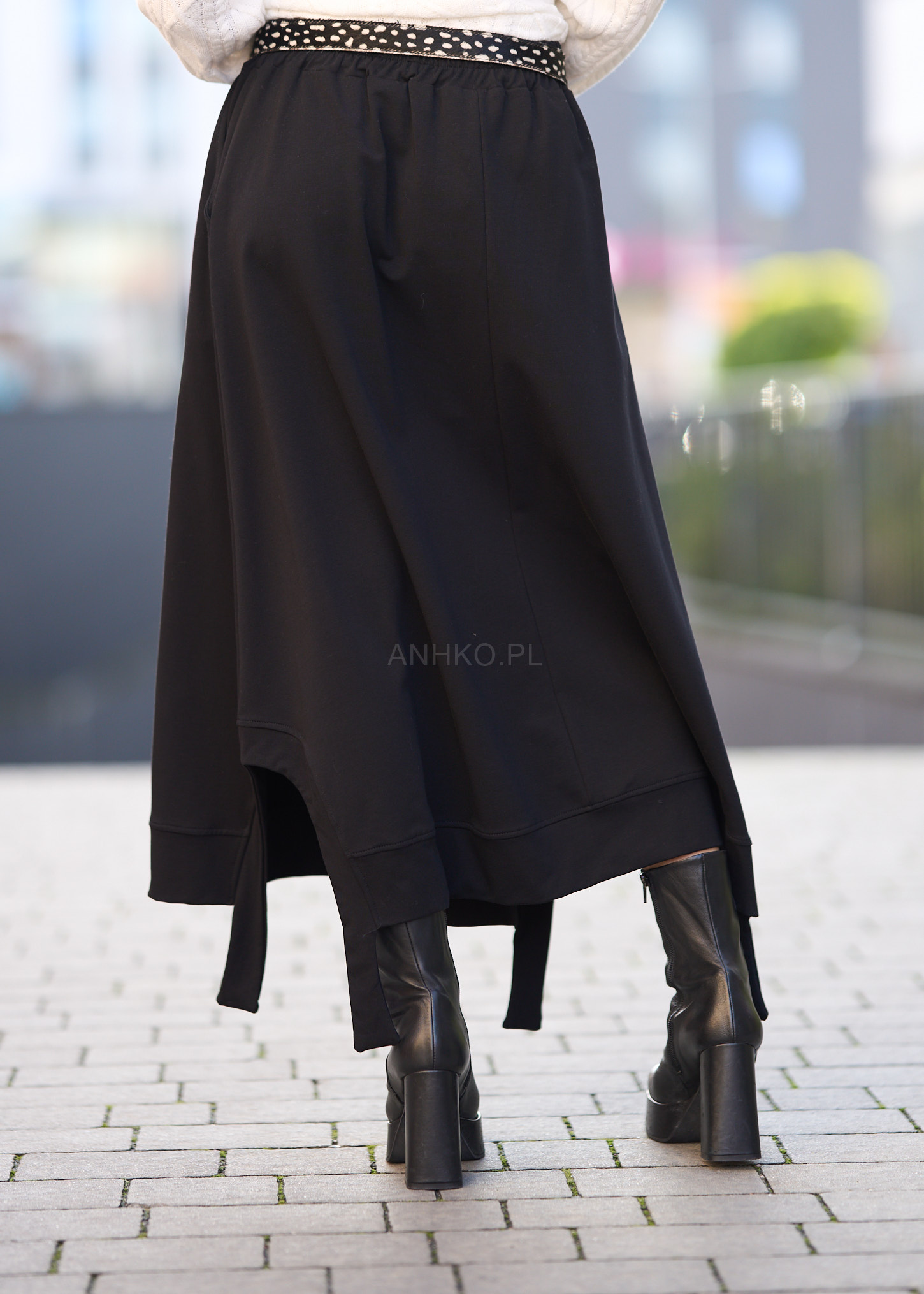 Ta spódnica dzianinowa miękko układa się na sylwetce, tworząc swobodną linię i efektowny ruch przy każdym kroku. Asymetryczny dół, elastyczny pas oraz dekoracyjny pasek podkreślają nowoczesny charakter modelu, a czarna kolorystyka sprawia, że całość łatwo wkomponować w miejskie, casualowe i bardziej wyraziste stylizacje.