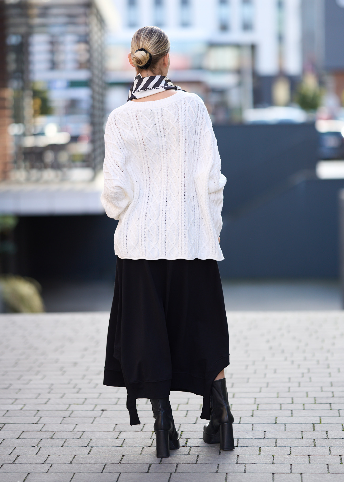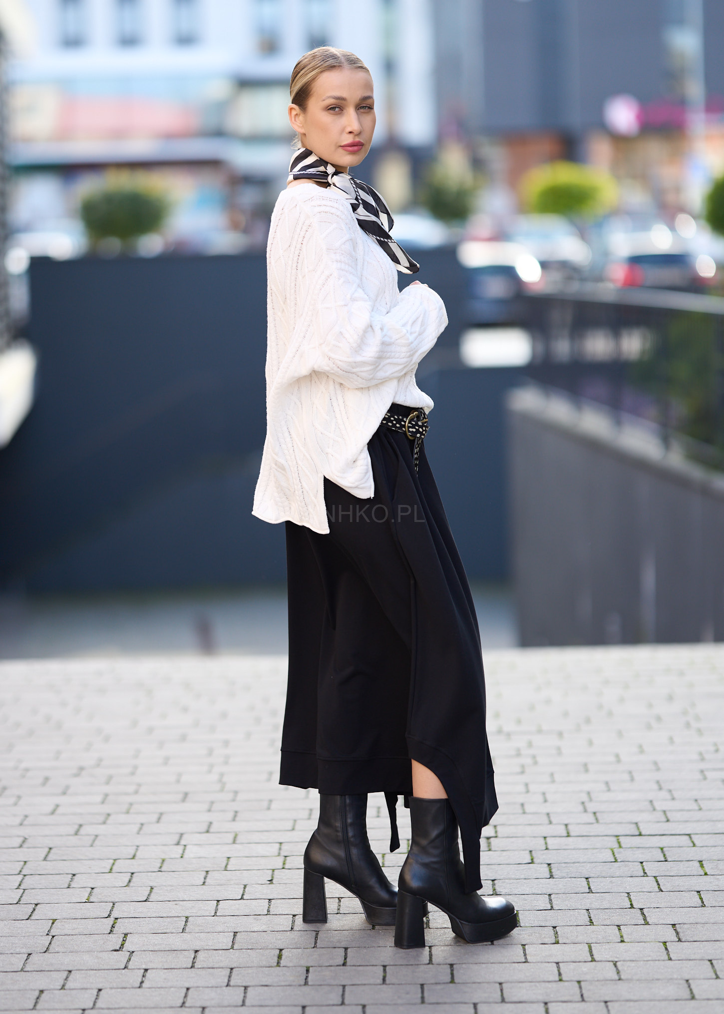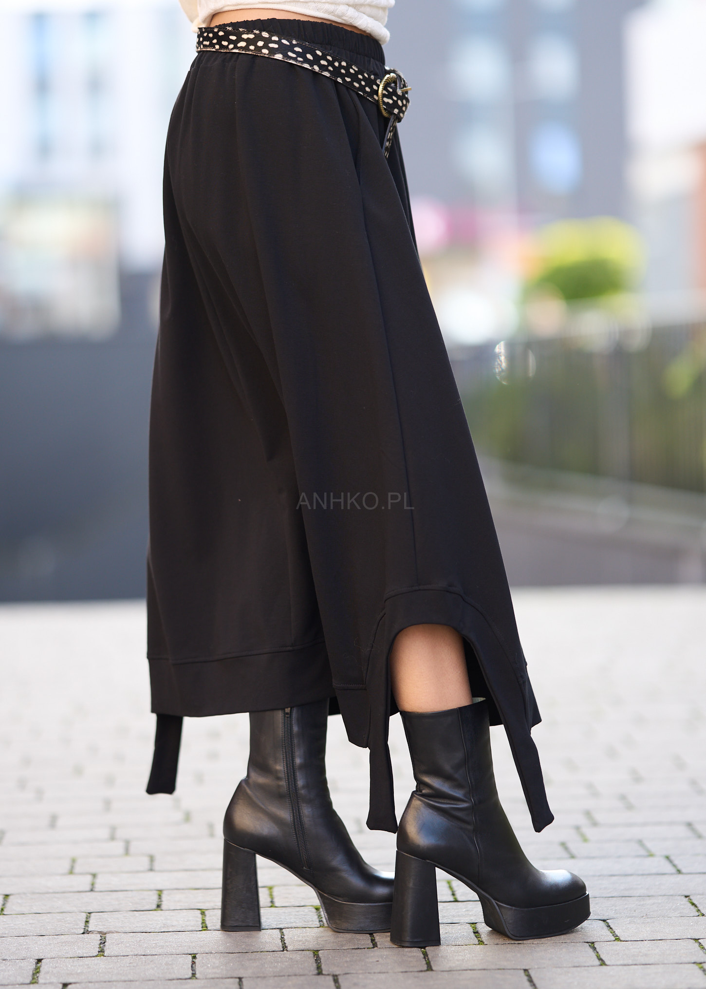 Ta spódnica dzianinowa miękko układa się na sylwetce, tworząc swobodną linię i efektowny ruch przy każdym kroku. Asymetryczny dół, elastyczny pas oraz dekoracyjny pasek podkreślają nowoczesny charakter modelu, a czarna kolorystyka sprawia, że całość łatwo wkomponować w miejskie, casualowe i bardziej wyraziste stylizacje.