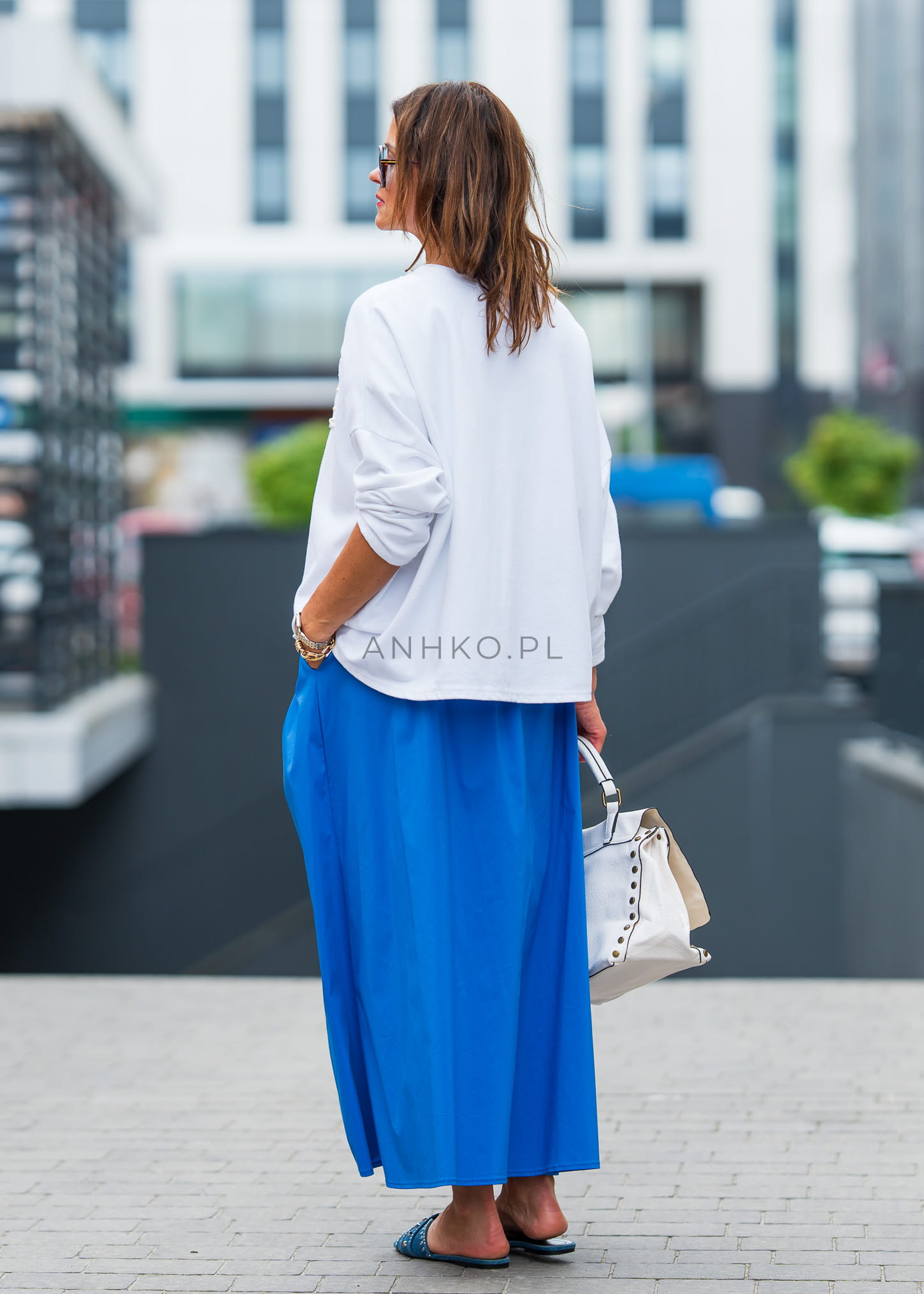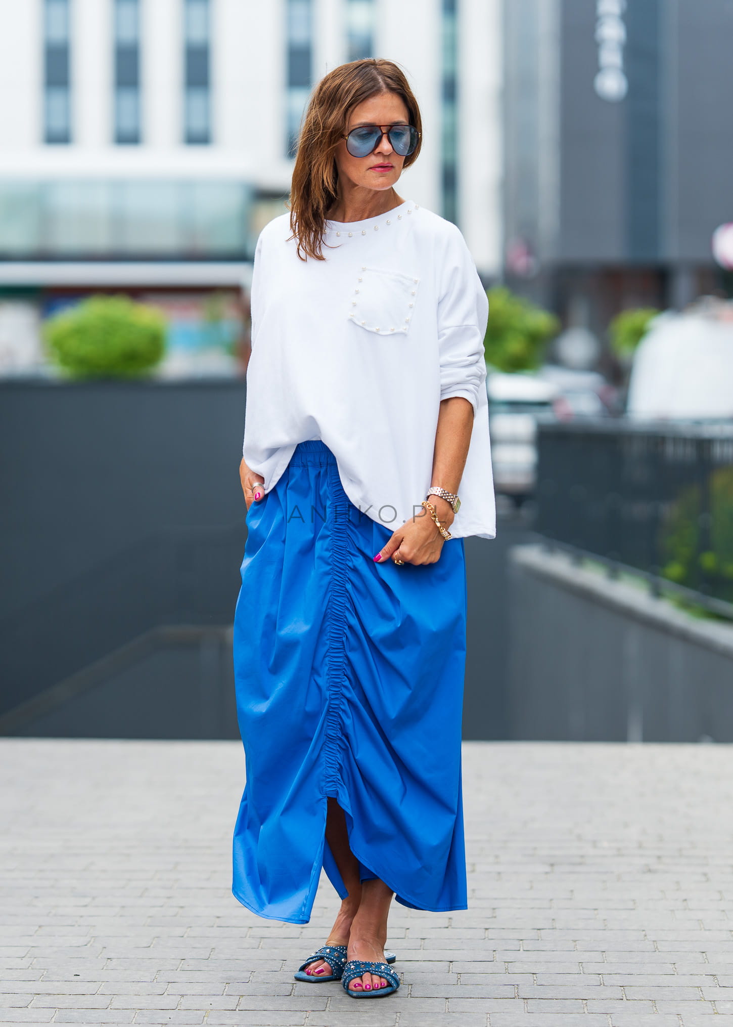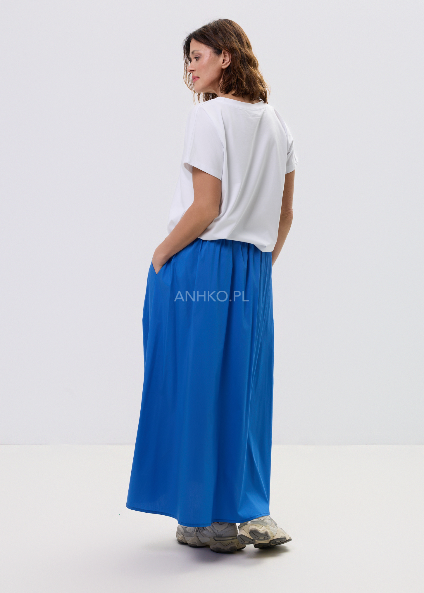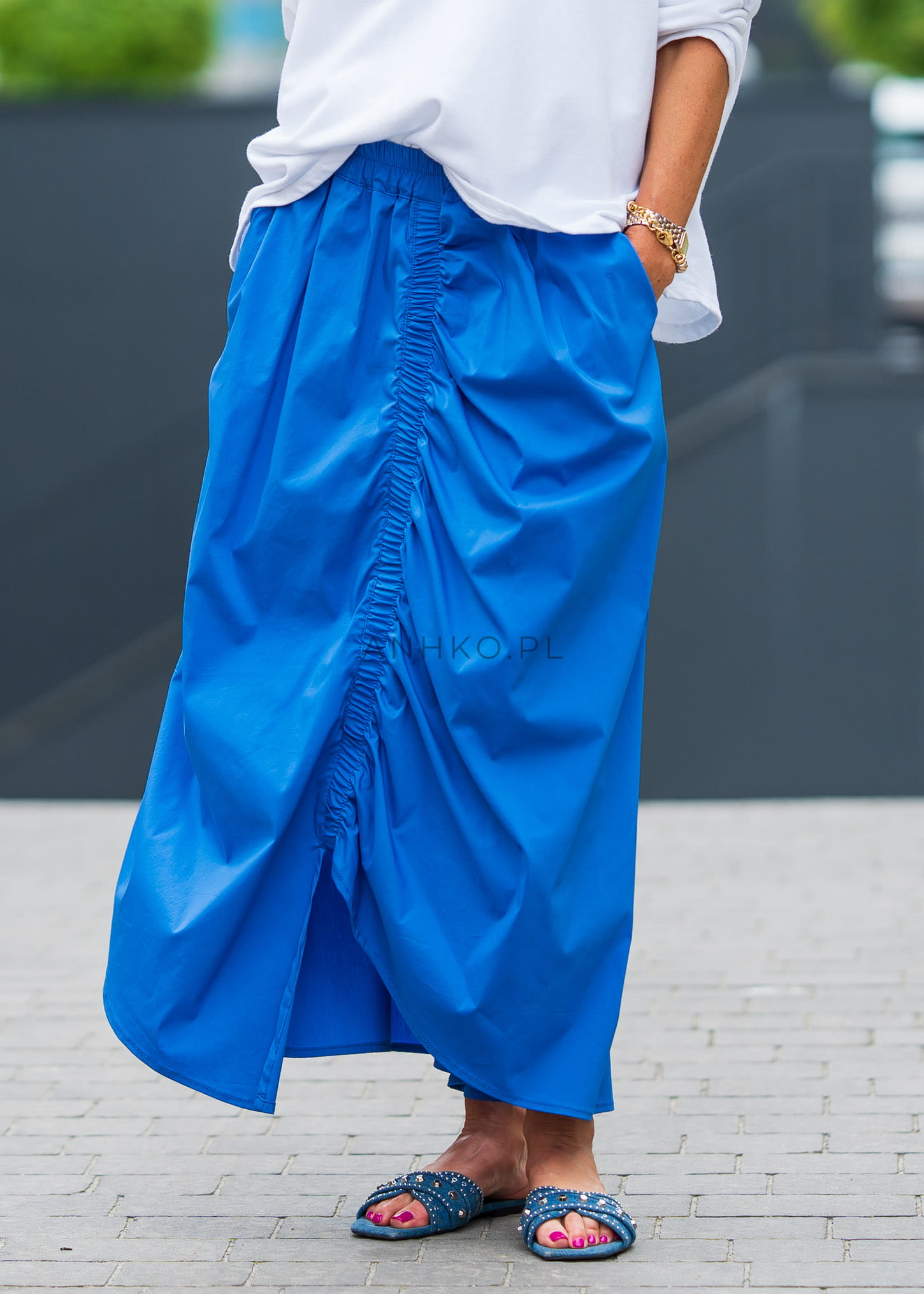 To spódnica stworzona dla kobiet, które kochają komfort i kolor. Jej soczysty niebieski odcień przyciąga spojrzenia, a elastyczny pas i marszczenie z przodu nadają jej nowoczesnego charakteru. Uszyta z lekkiego, przewiewnego materiału, idealna na upalne dni. Możesz zestawić ją z prostym topem lub lnianą koszulą – sprawdzi się zarówno na wakacjach, jak i w miejskich stylizacjach. Świetna do noszenia z sandałami, sneakersami lub espadrylami. To wyrazisty, ale funkcjonalny element garderoby, który wnosi świeżość do letnich outfitów.