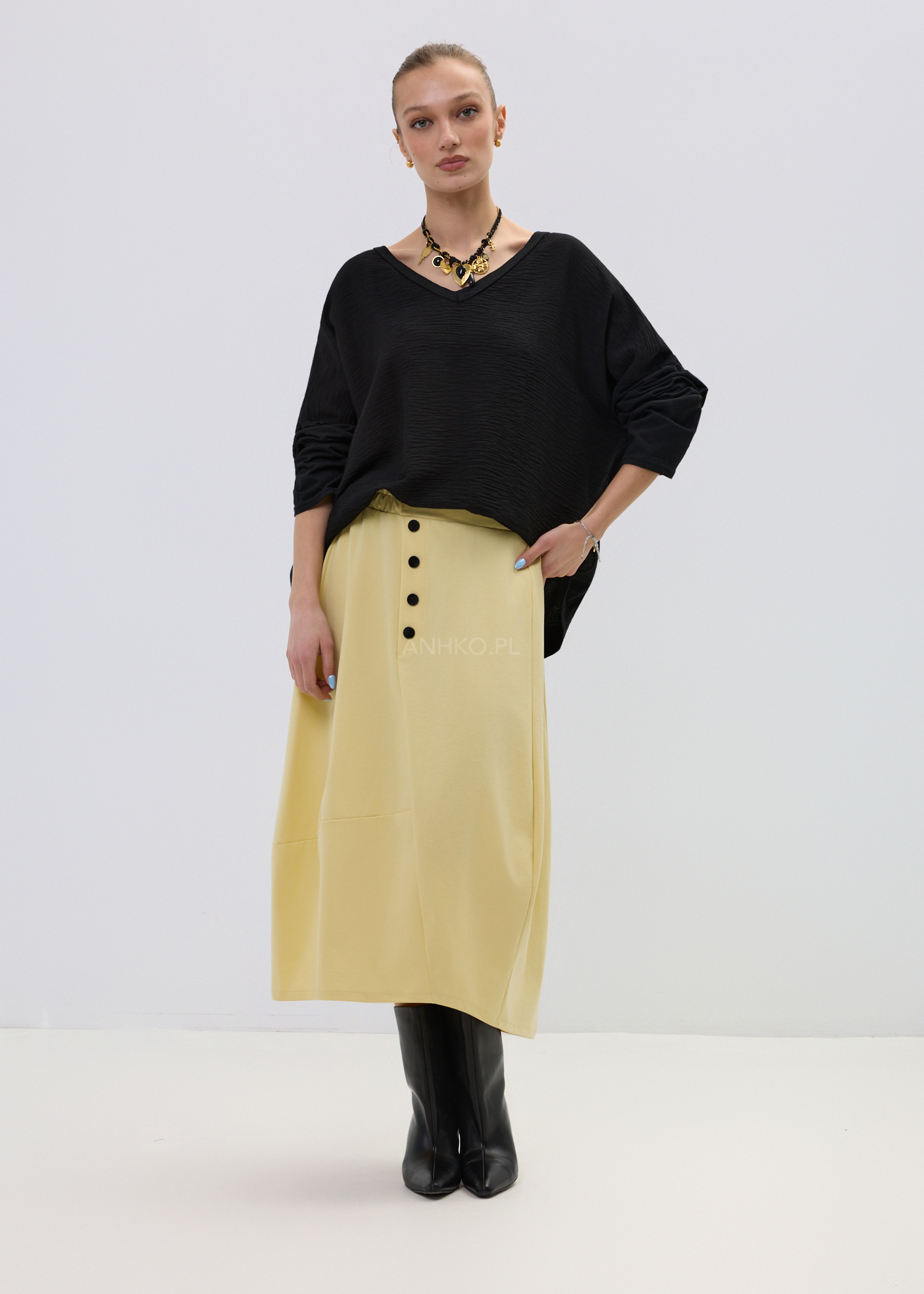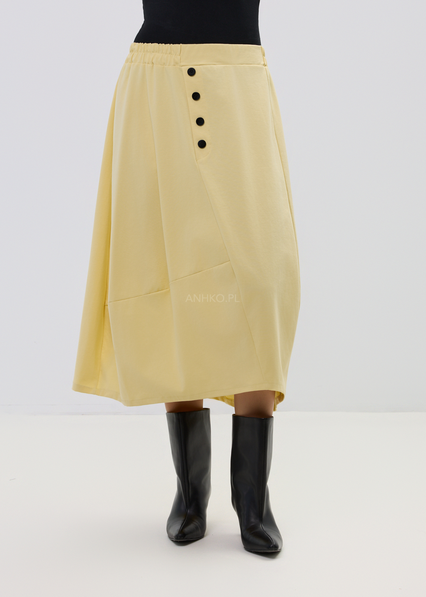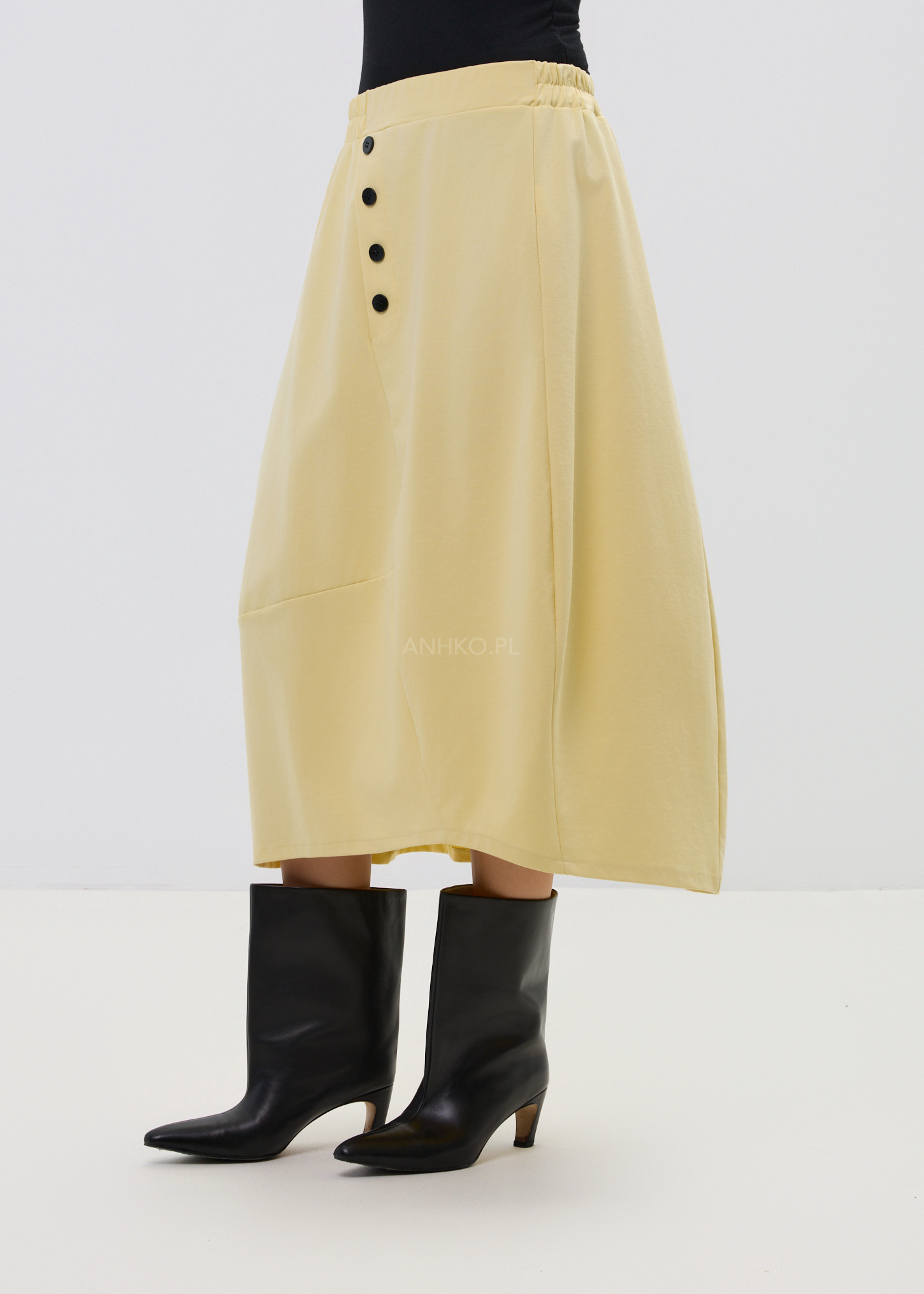 Ta spódnica midi o lekko rozkloszowanym kroju naturalnie układa się na sylwetce, tworząc płynny, miękki ruch przy każdym kroku. Asymetryczny przód z dekoracyjnymi guzikami subtelnie przyciąga uwagę i nadaje całości nowoczesnego charakteru, jednocześnie zachowując lekkość formy.
