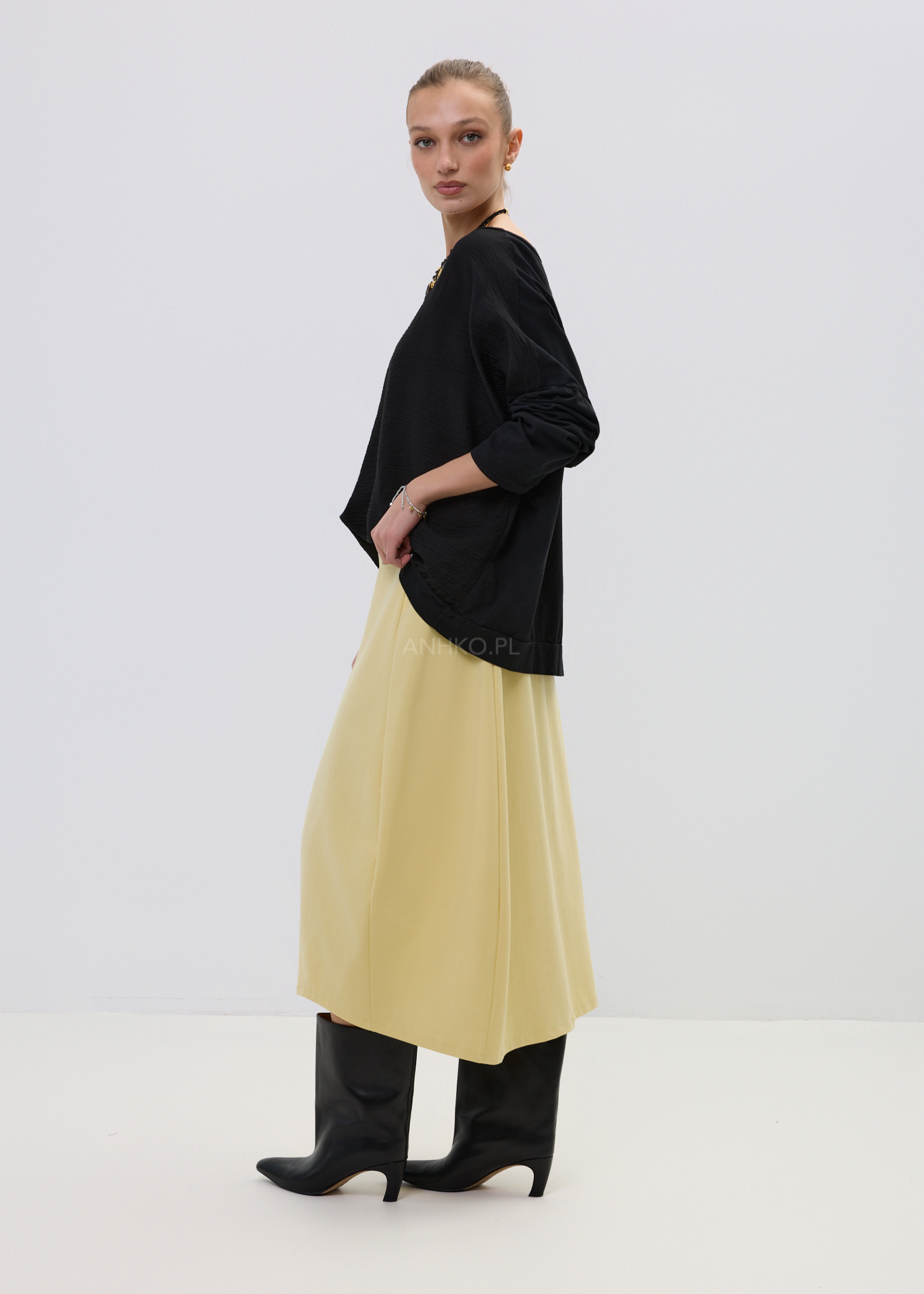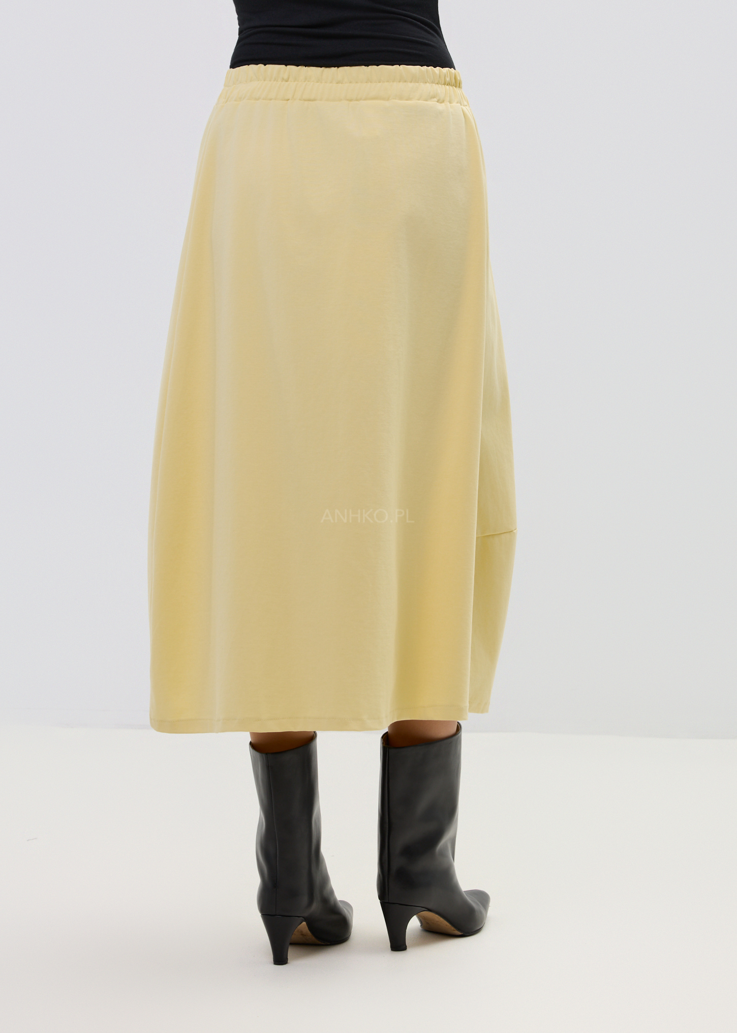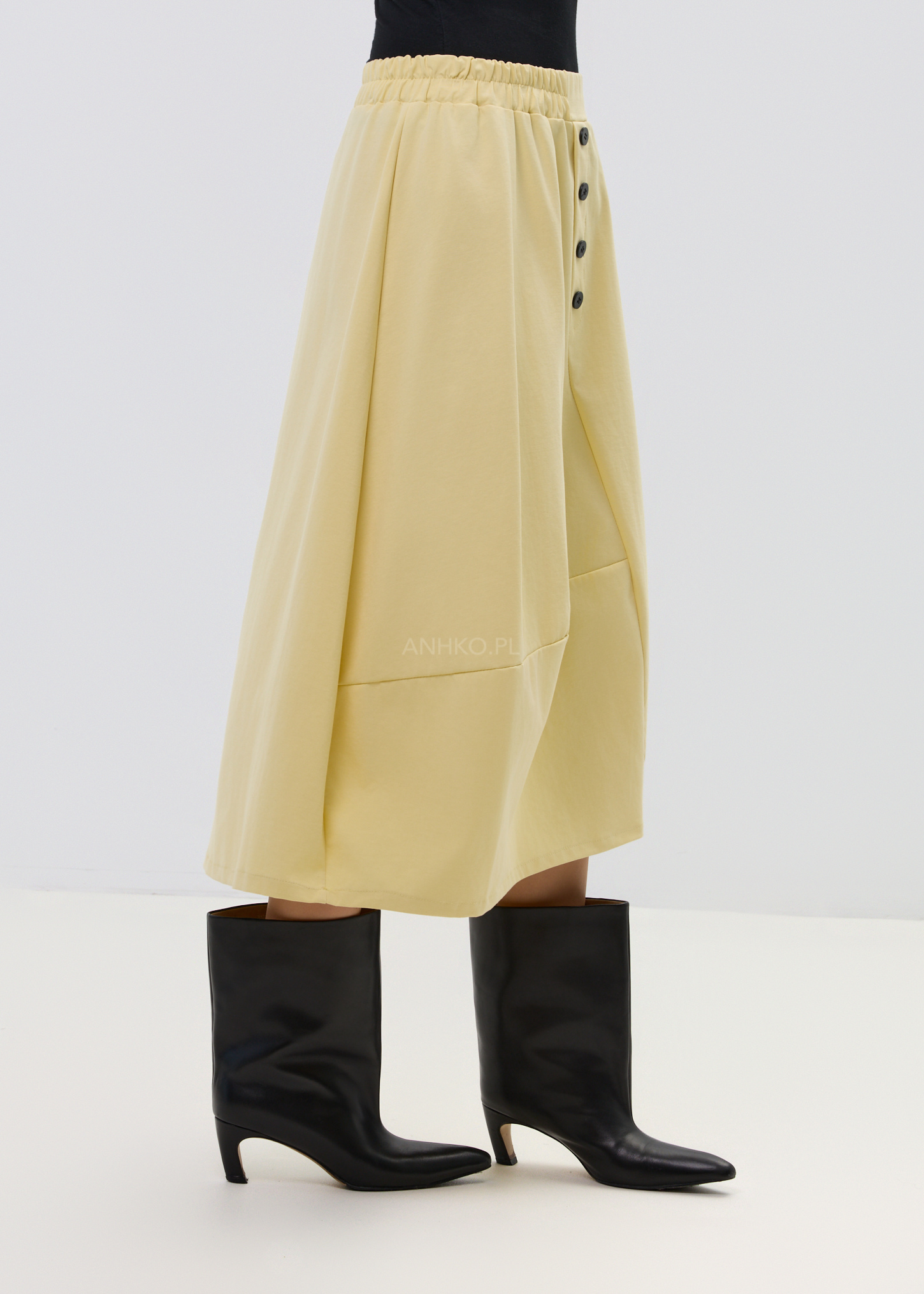 Ta spódnica midi o lekko rozkloszowanym kroju naturalnie układa się na sylwetce, tworząc płynny, miękki ruch przy każdym kroku. Asymetryczny przód z dekoracyjnymi guzikami subtelnie przyciąga uwagę i nadaje całości nowoczesnego charakteru, jednocześnie zachowując lekkość formy.