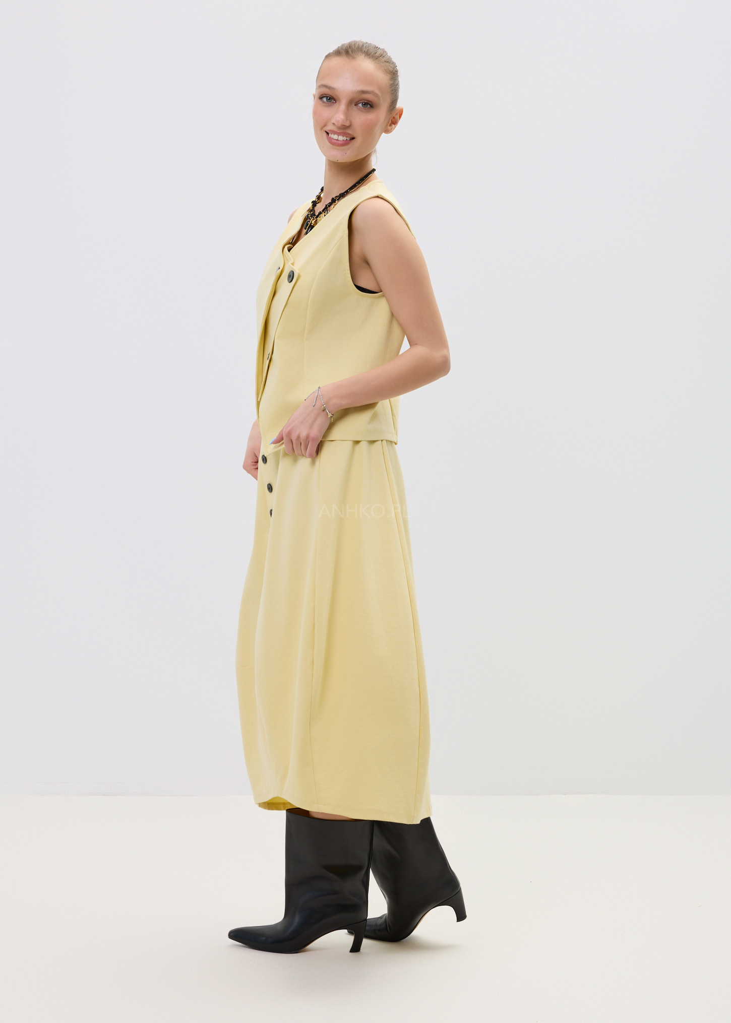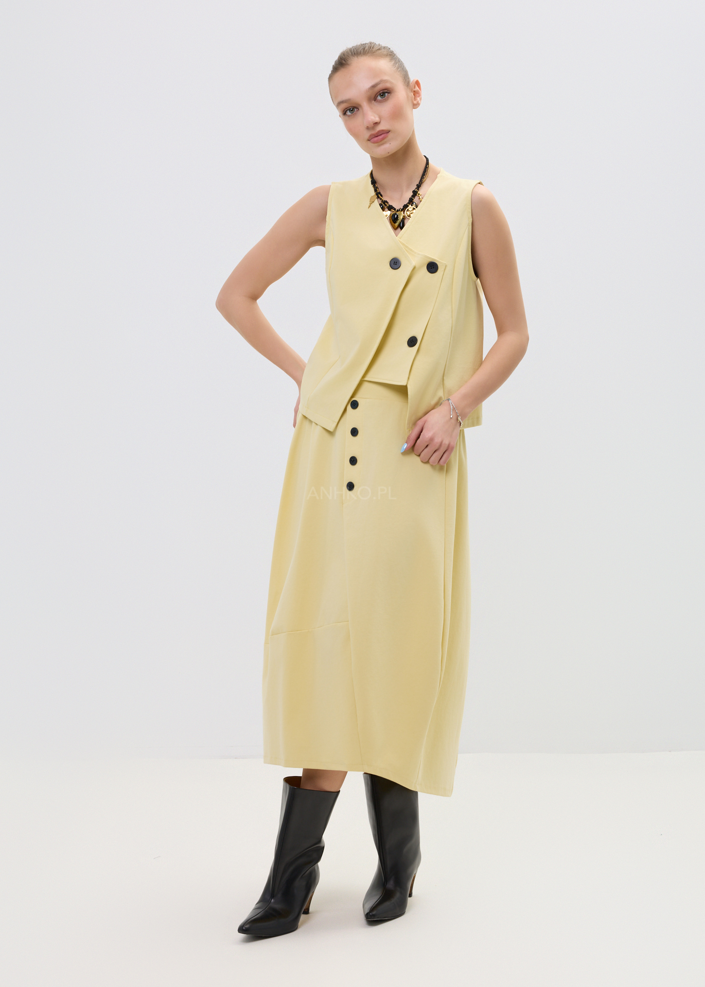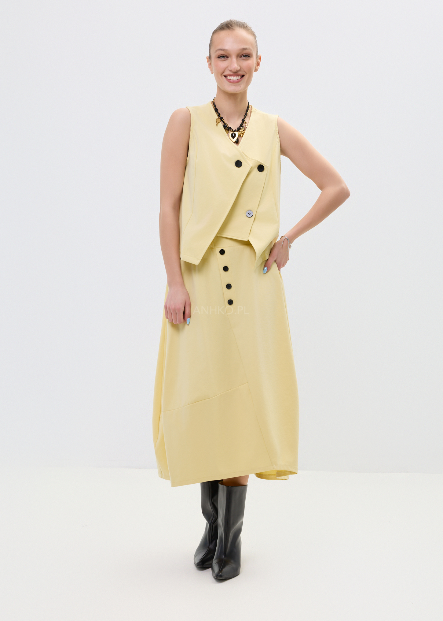 Kamizelka Mustaco Żółta - Stylowa kamizelka w maślanym odcieniu z asymetrycznym zapięciem to idealny wybór na nowoczesne stylizacje. Minimalistyczna forma z twistem, który robi efekt.