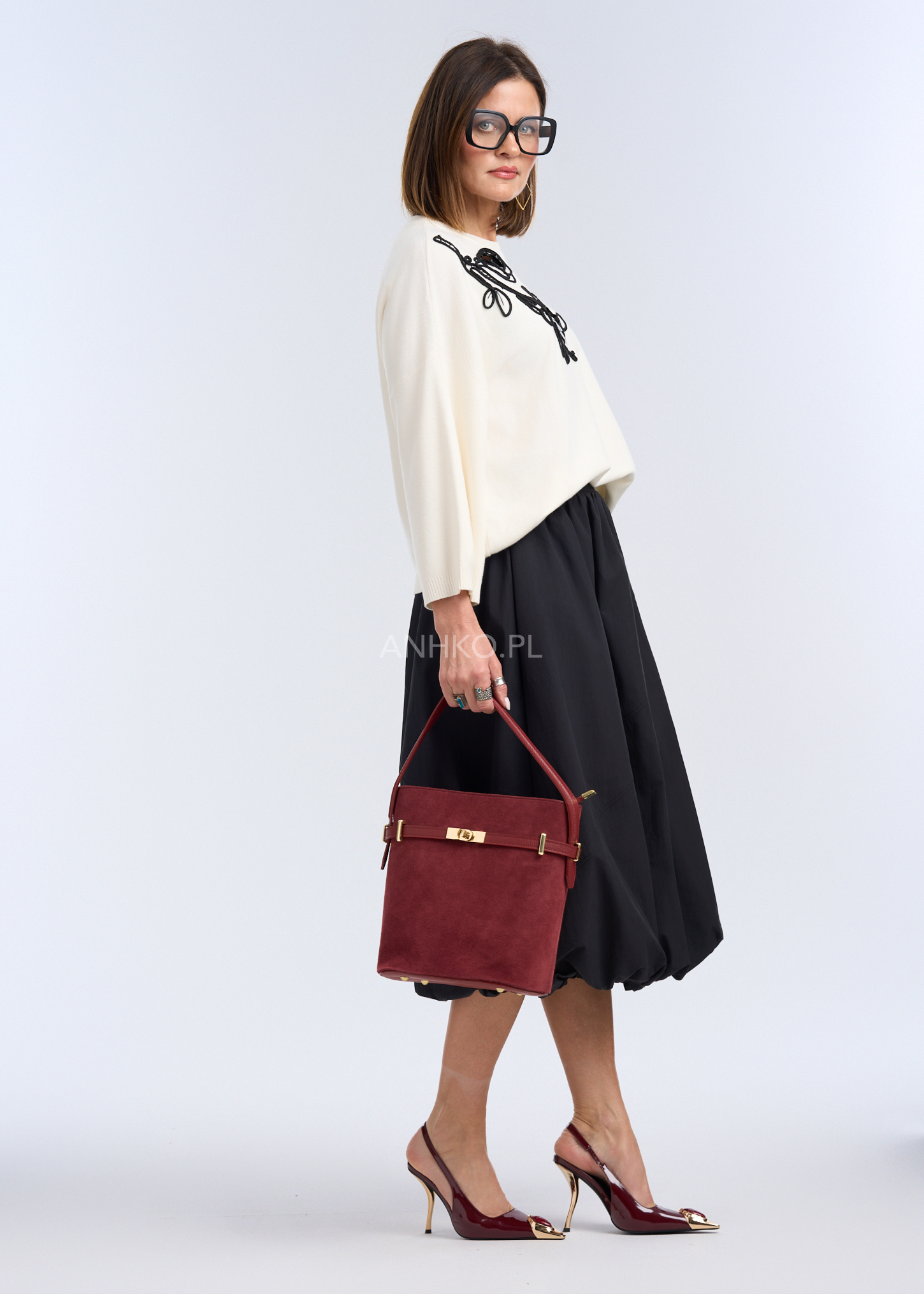 Torebka Bold w kolorze bordowym to elegancka, usztywniana torebka wykonana z prawdziwej zamszowej skóry. Zapinana na zamek, posiada ozdobne zapięcie obrotowe z przodu oraz dodatkowy długi pasek w środku. Idealna na eleganckie okazje, dostępna także w innych kolorach.
