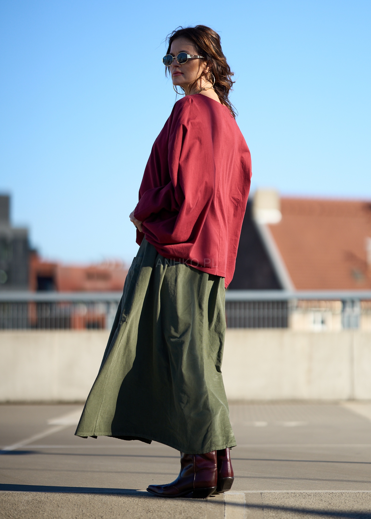 Bluzka Kessia Czerwona - Luźna, komfortowa bluzka o swobodnym kroju. Wykonana z miękkiej bawełny z dodatkiem elastanu, idealna na co dzień. Dłuższy tył i lekko rozszerzany dół nadają sylwetce lekkości. Doskonała baza do wielu stylizacji – od casual po smart-casual.