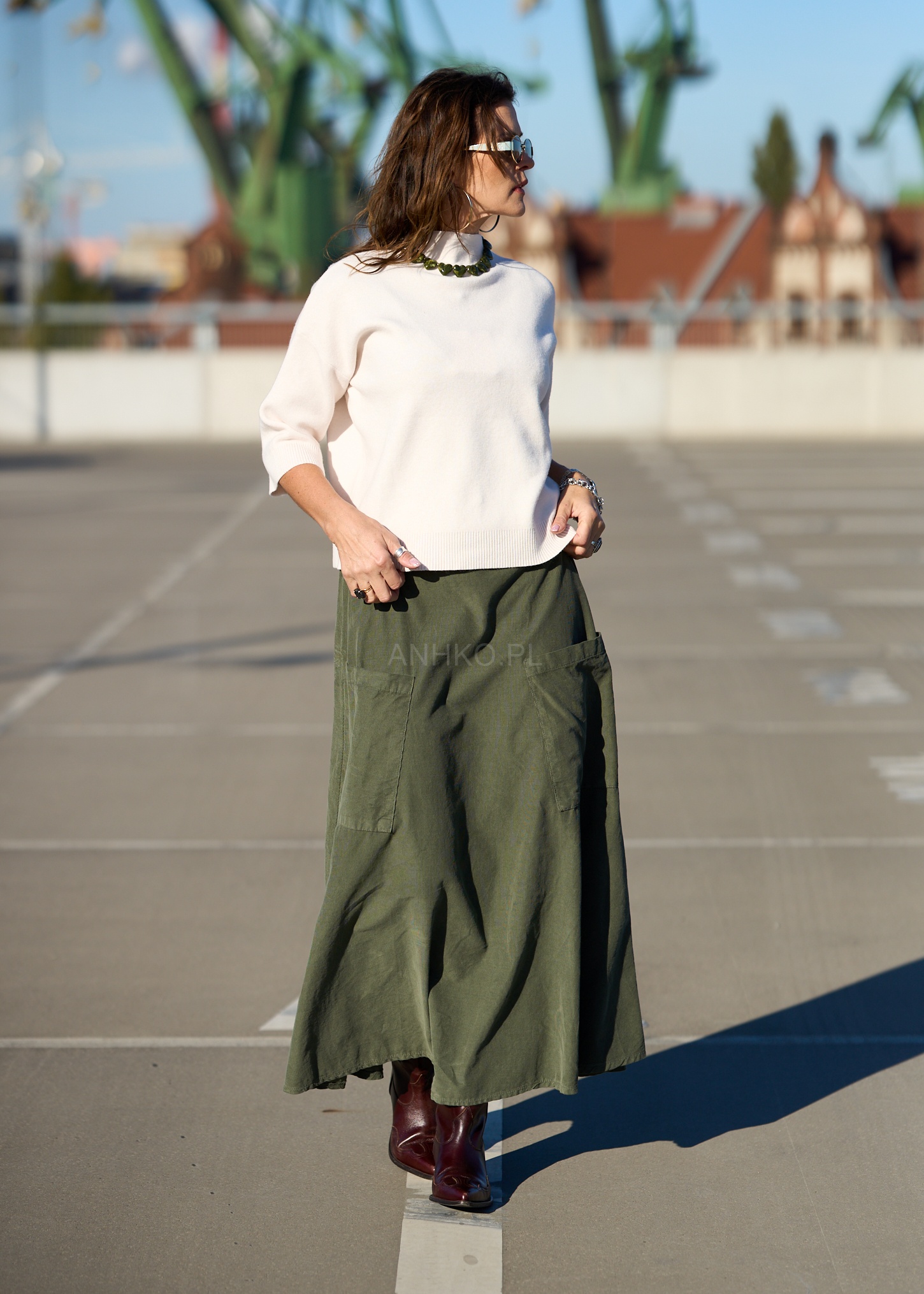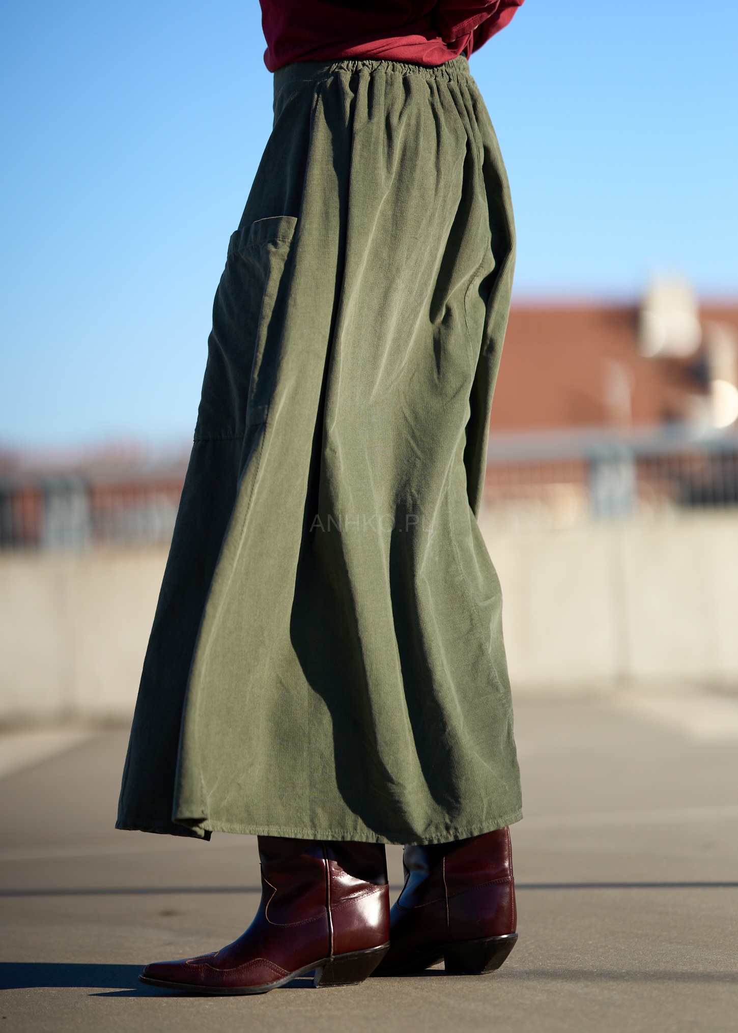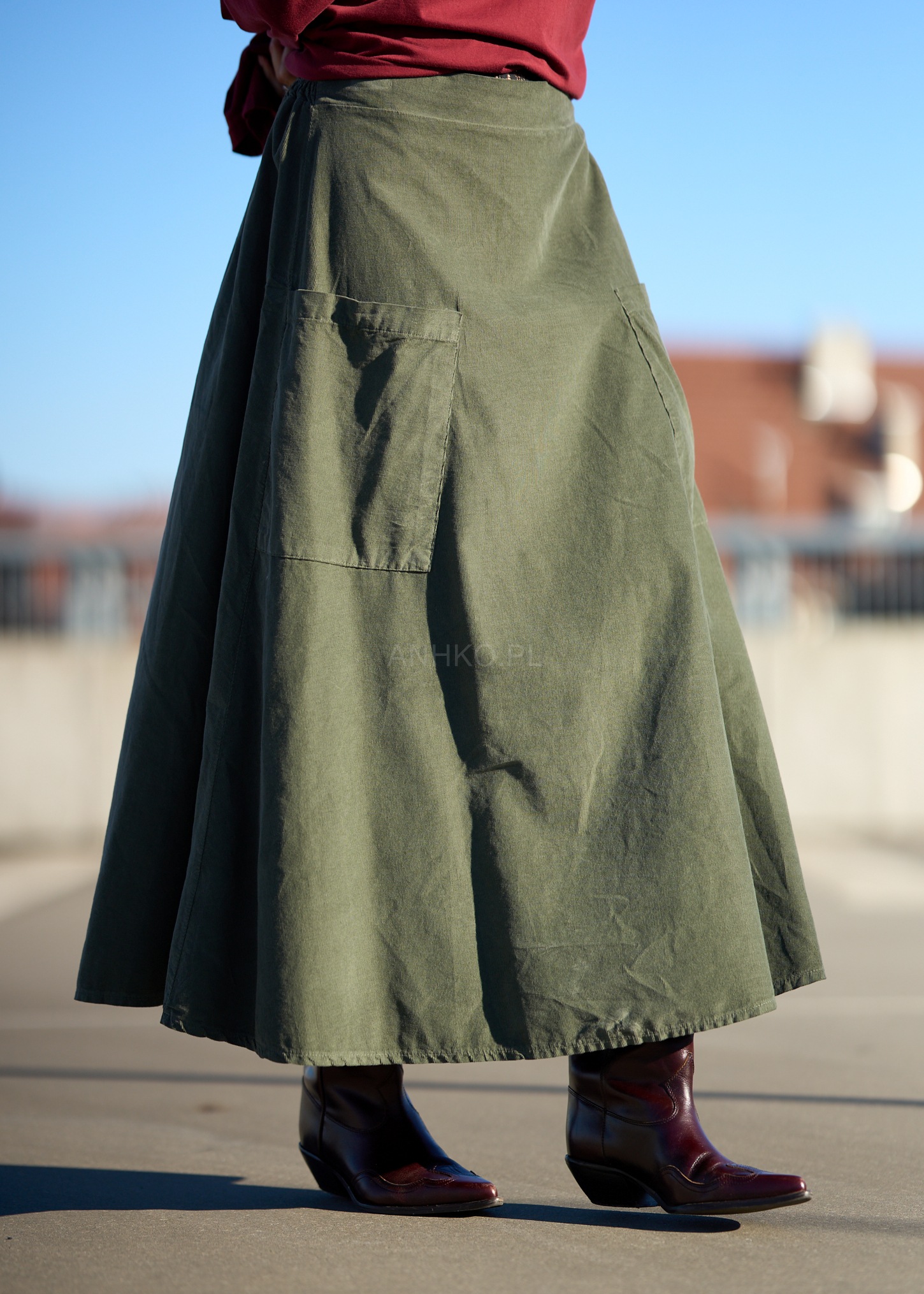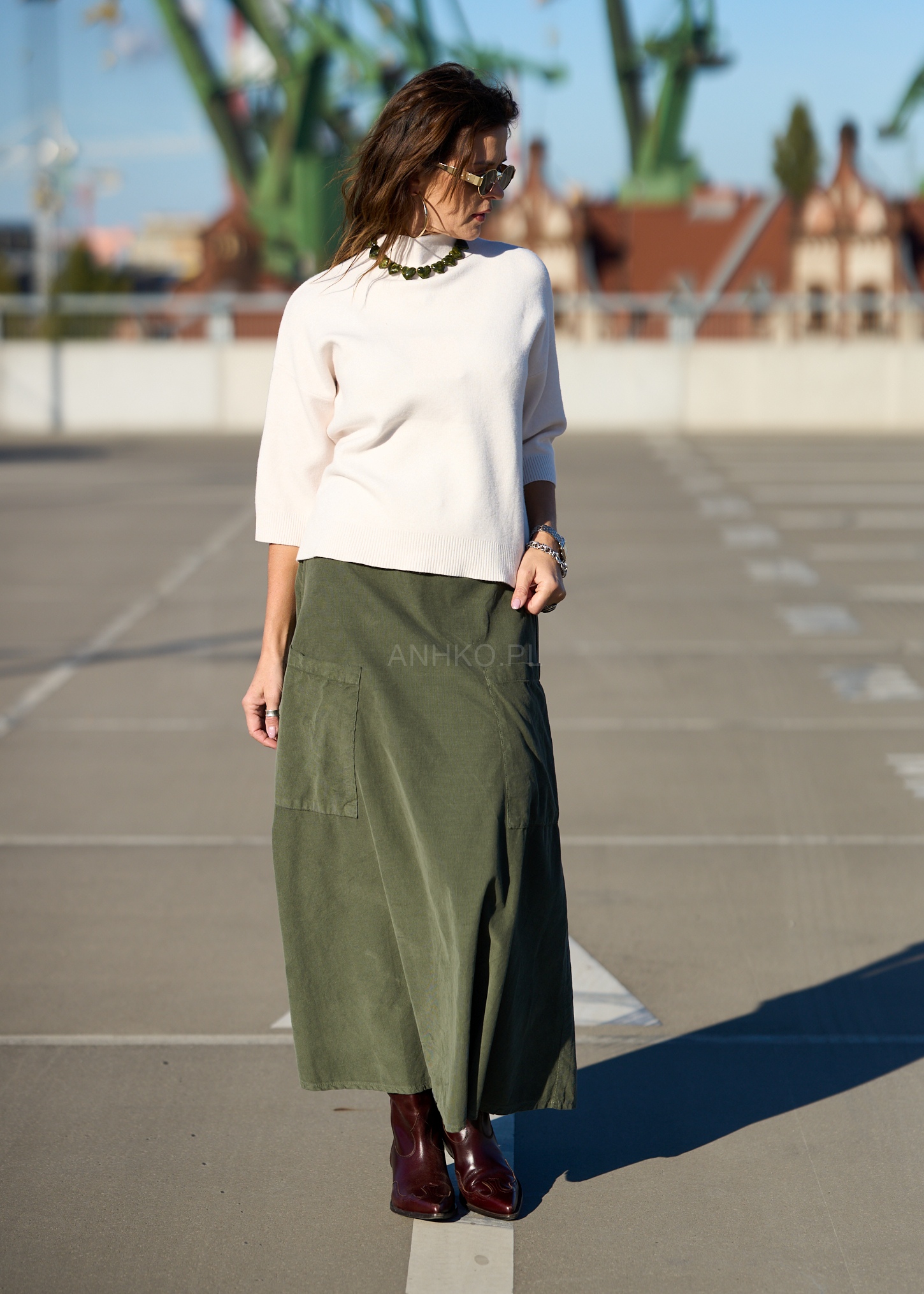 Zachwyca prostotą i subtelnym urokiem naturalnej tkaniny. Uszyta z miękkiego, bawełnianego sztruksu, ma przyjemną w dotyku fakturę i pięknie układa się na sylwetce. Luźny, nieco rozszerzany krój z elastyczną gumką w pasie zapewnia wygodę noszenia przez cały dzień. Po bokach znajdują się praktyczne kieszenie, które dodają funkcjonalności i luzu. Sztruksowy materiał sprawia, że model doskonale pasuje do jesiennych i zimowych stylizacji – świetnie wygląda z oversize’owym swetrem, grubymi rajstopami i botkami. Idealna na co dzień, do pracy lub weekendowy spacer.