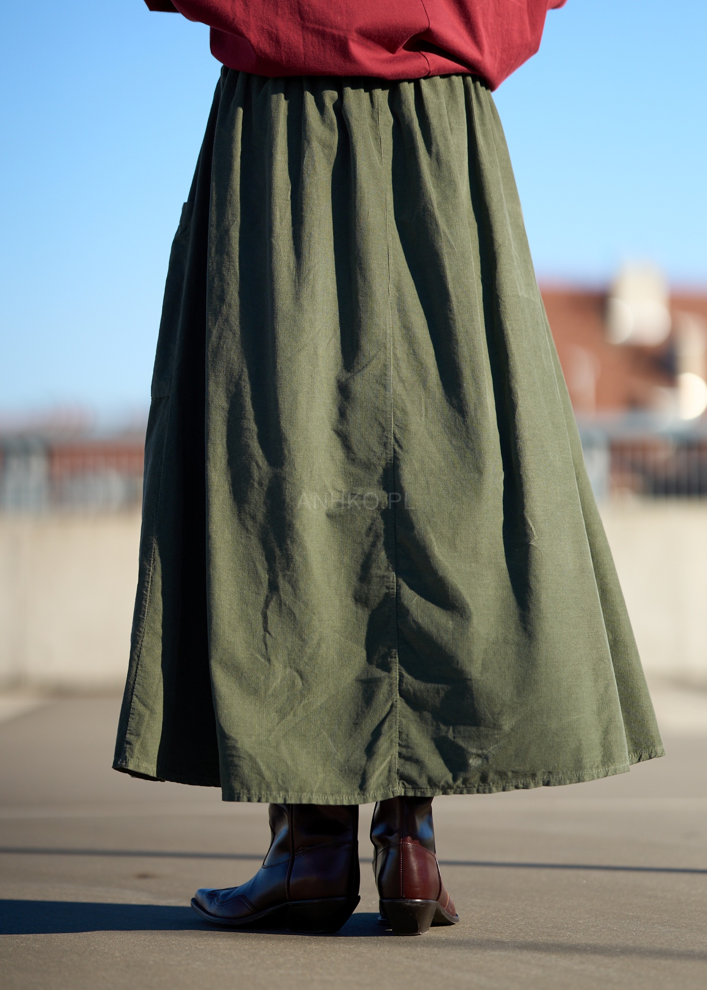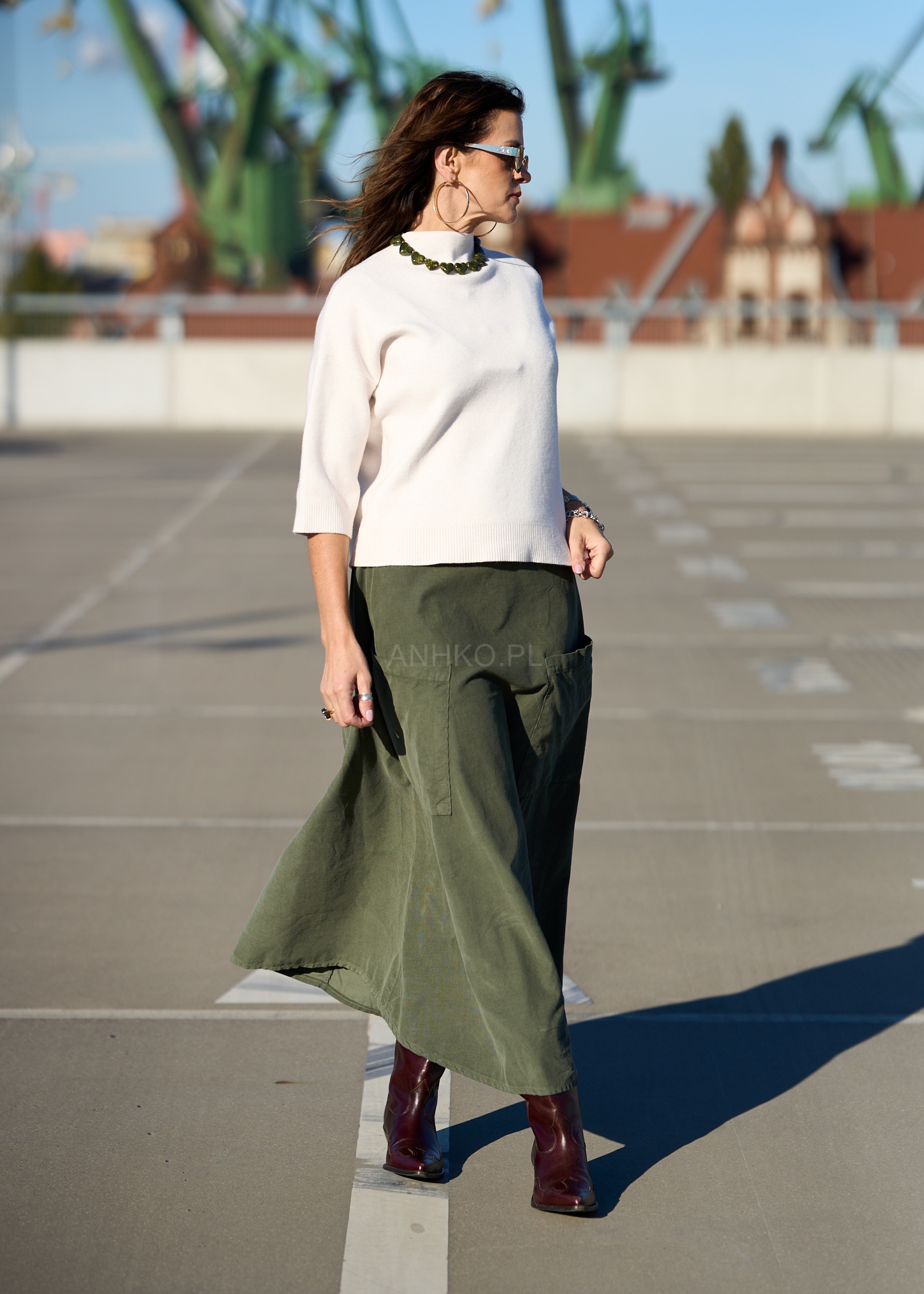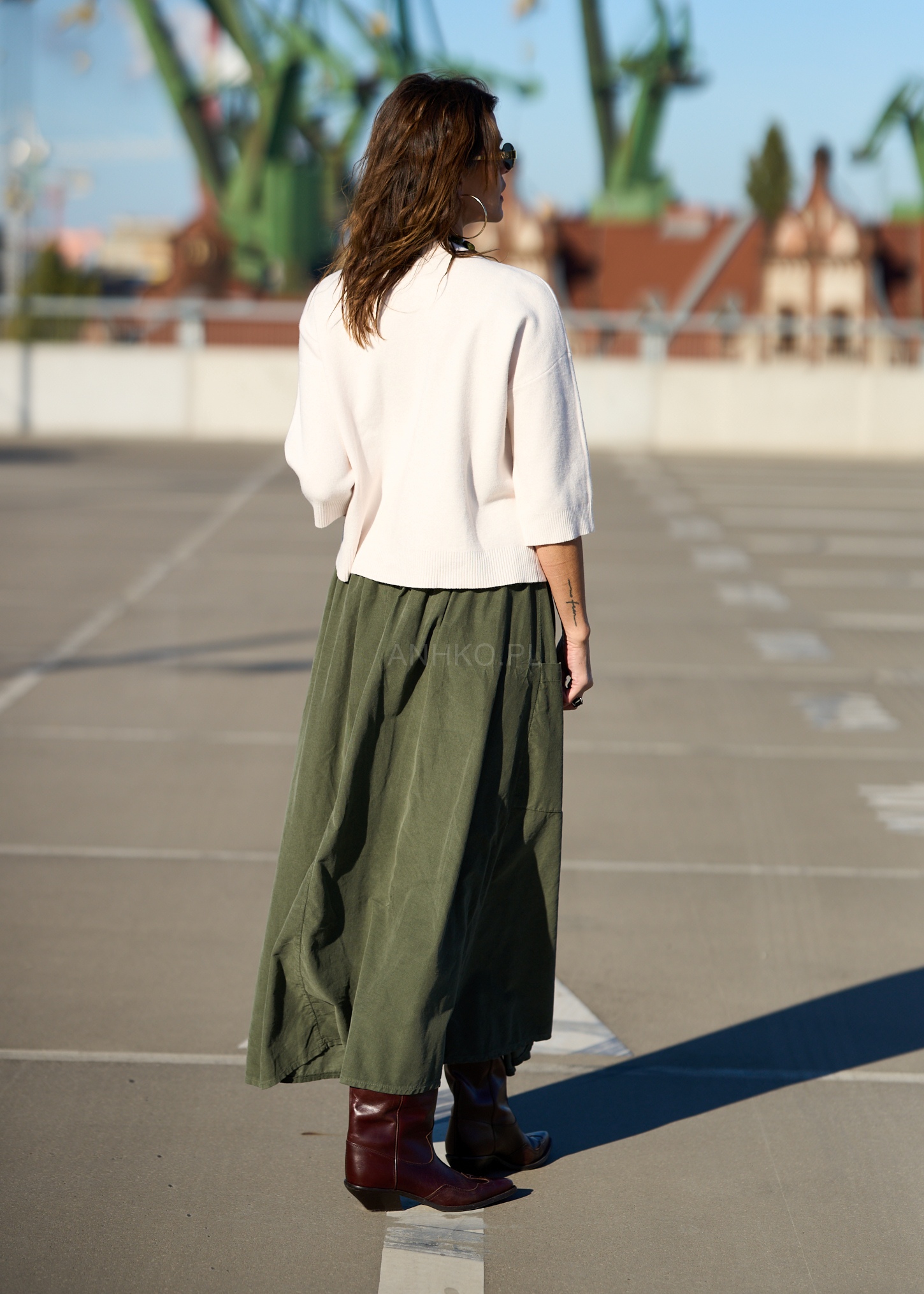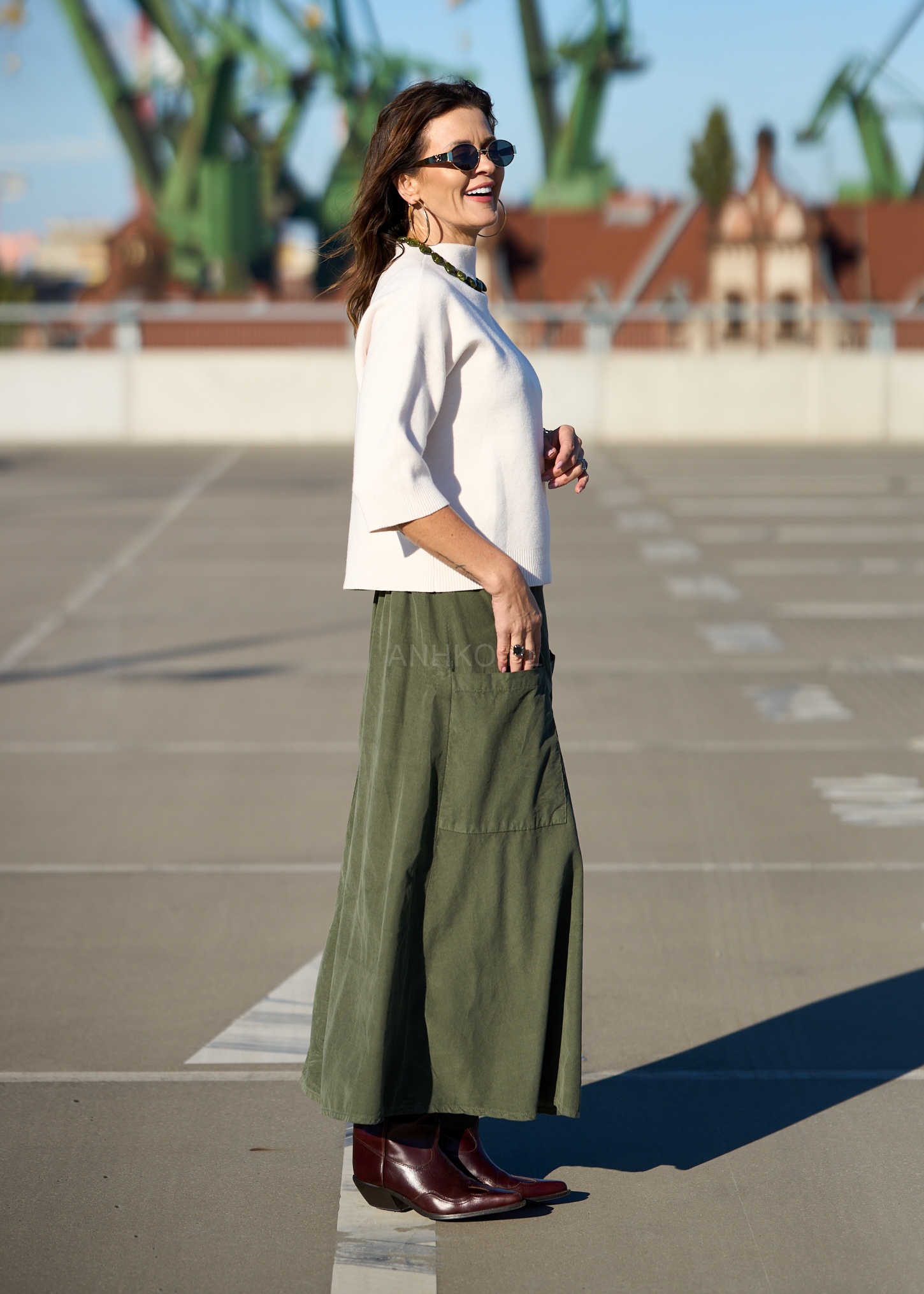 Zachwyca prostotą i subtelnym urokiem naturalnej tkaniny. Uszyta z miękkiego, bawełnianego sztruksu, ma przyjemną w dotyku fakturę i pięknie układa się na sylwetce. Luźny, nieco rozszerzany krój z elastyczną gumką w pasie zapewnia wygodę noszenia przez cały dzień. Po bokach znajdują się praktyczne kieszenie, które dodają funkcjonalności i luzu. Sztruksowy materiał sprawia, że model doskonale pasuje do jesiennych i zimowych stylizacji – świetnie wygląda z oversize’owym swetrem, grubymi rajstopami i botkami. Idealna na co dzień, do pracy lub weekendowy spacer.