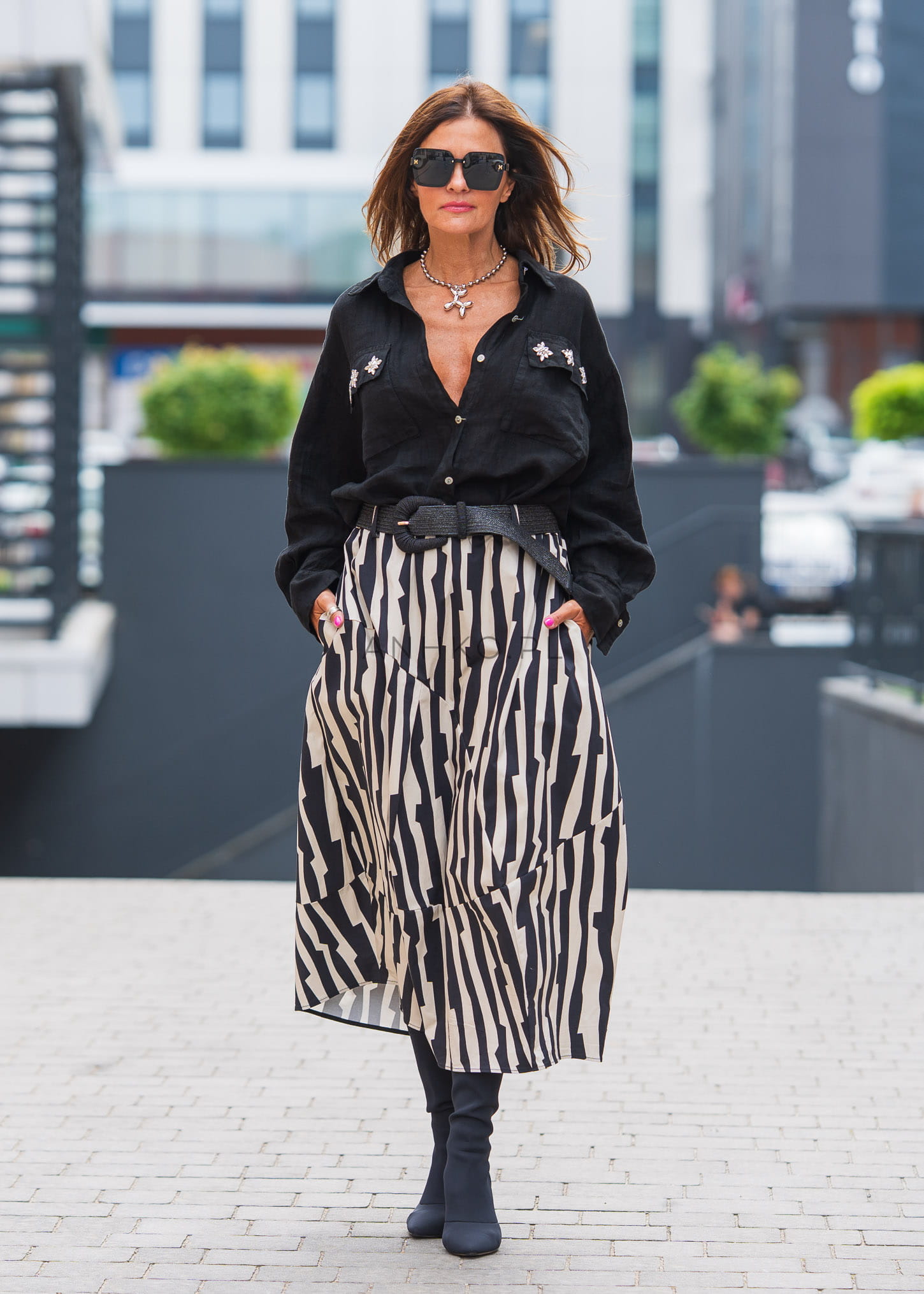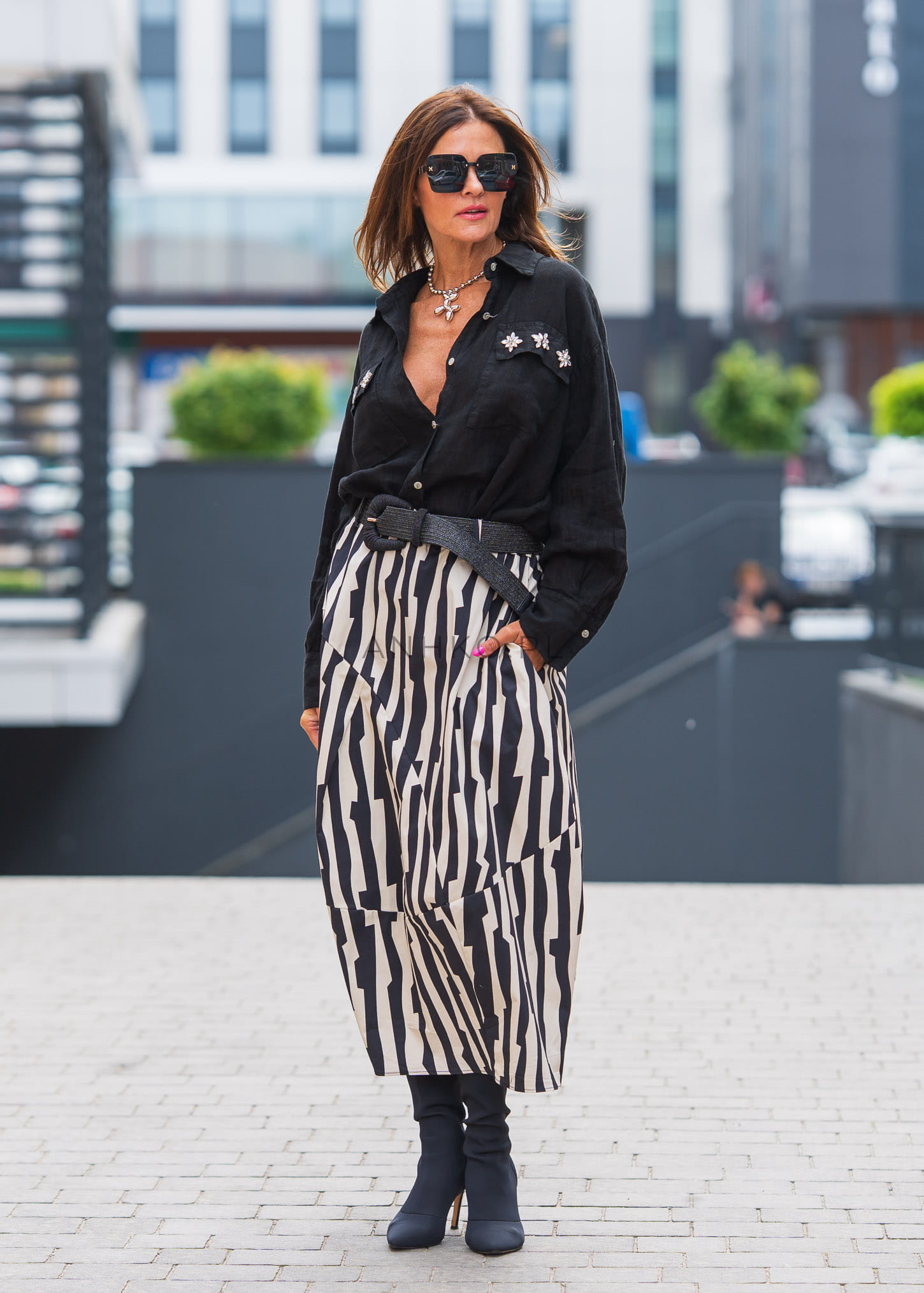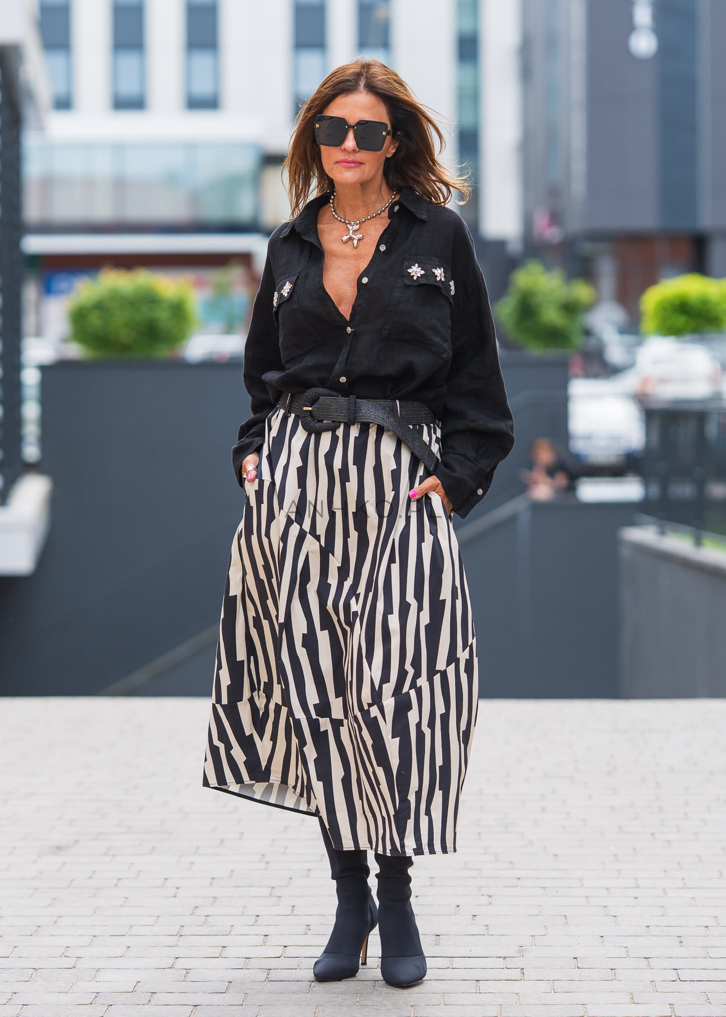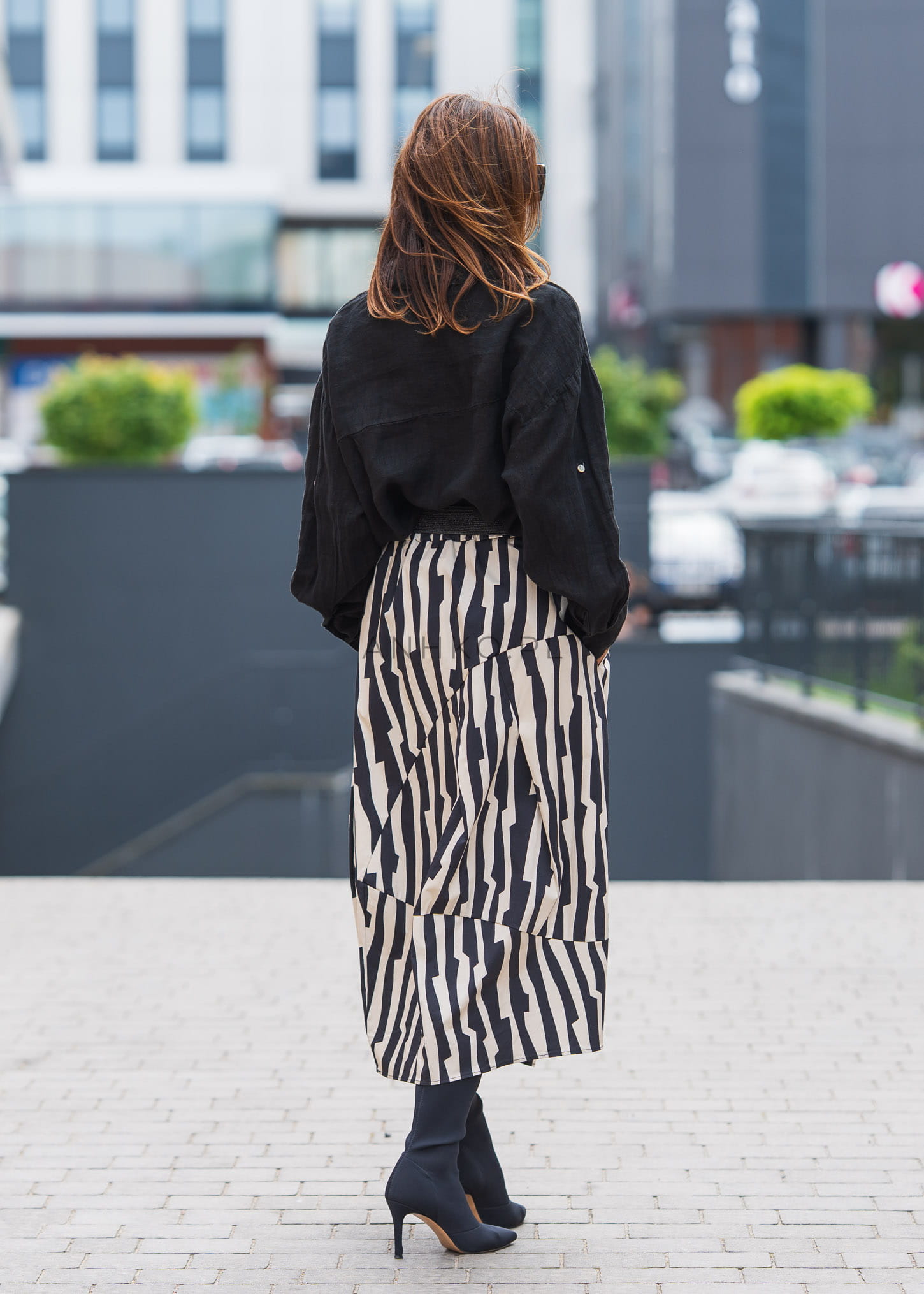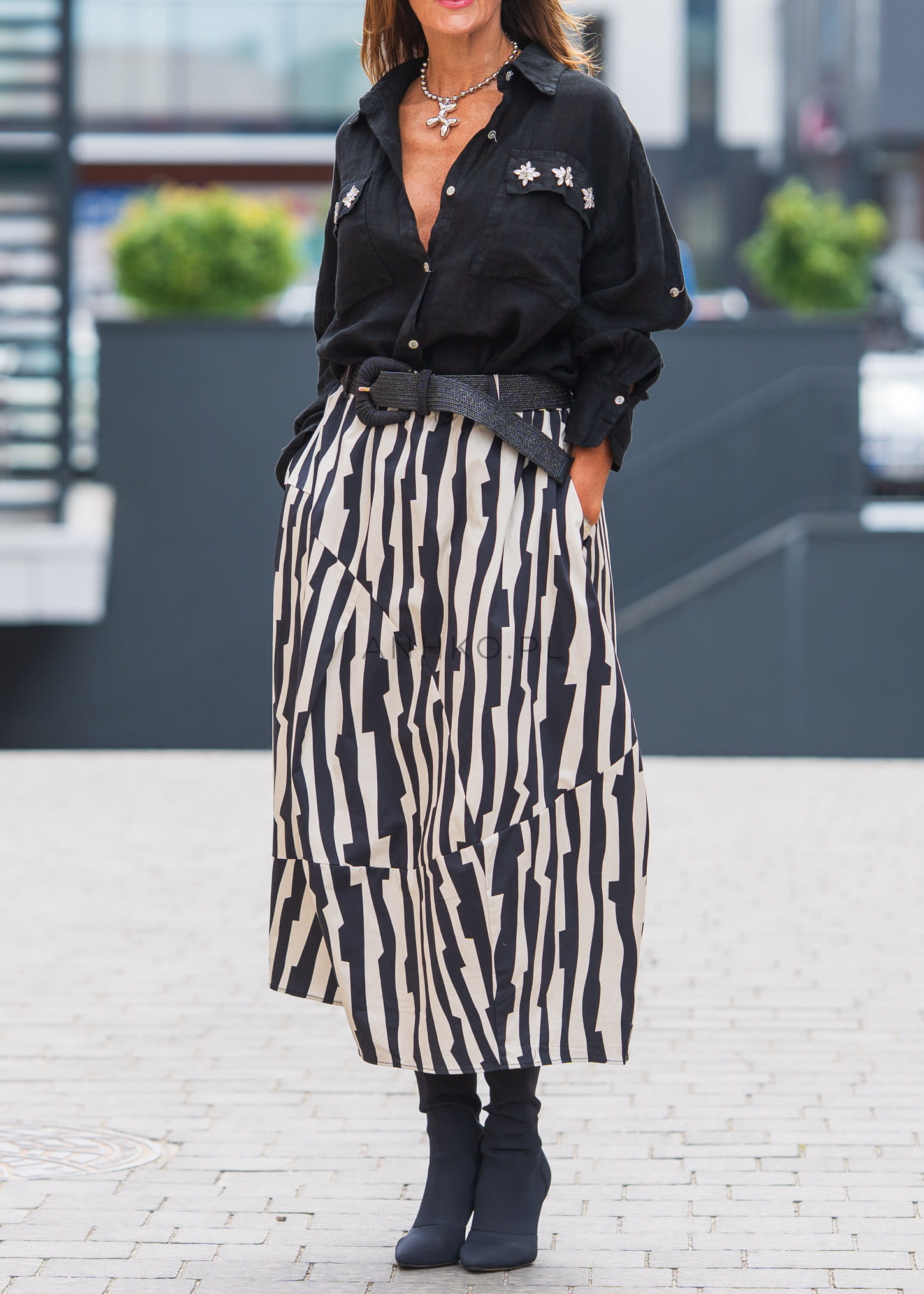 Ta spódnica balonowa przyciąga uwagę odważnym, czarno-białym wzorem zebra oraz wyrazistą konstrukcją. Charakterystyczne cięcia i marszczenia budują objętość, która nadaje sylwetce nowoczesny, architektoniczny wygląd.
