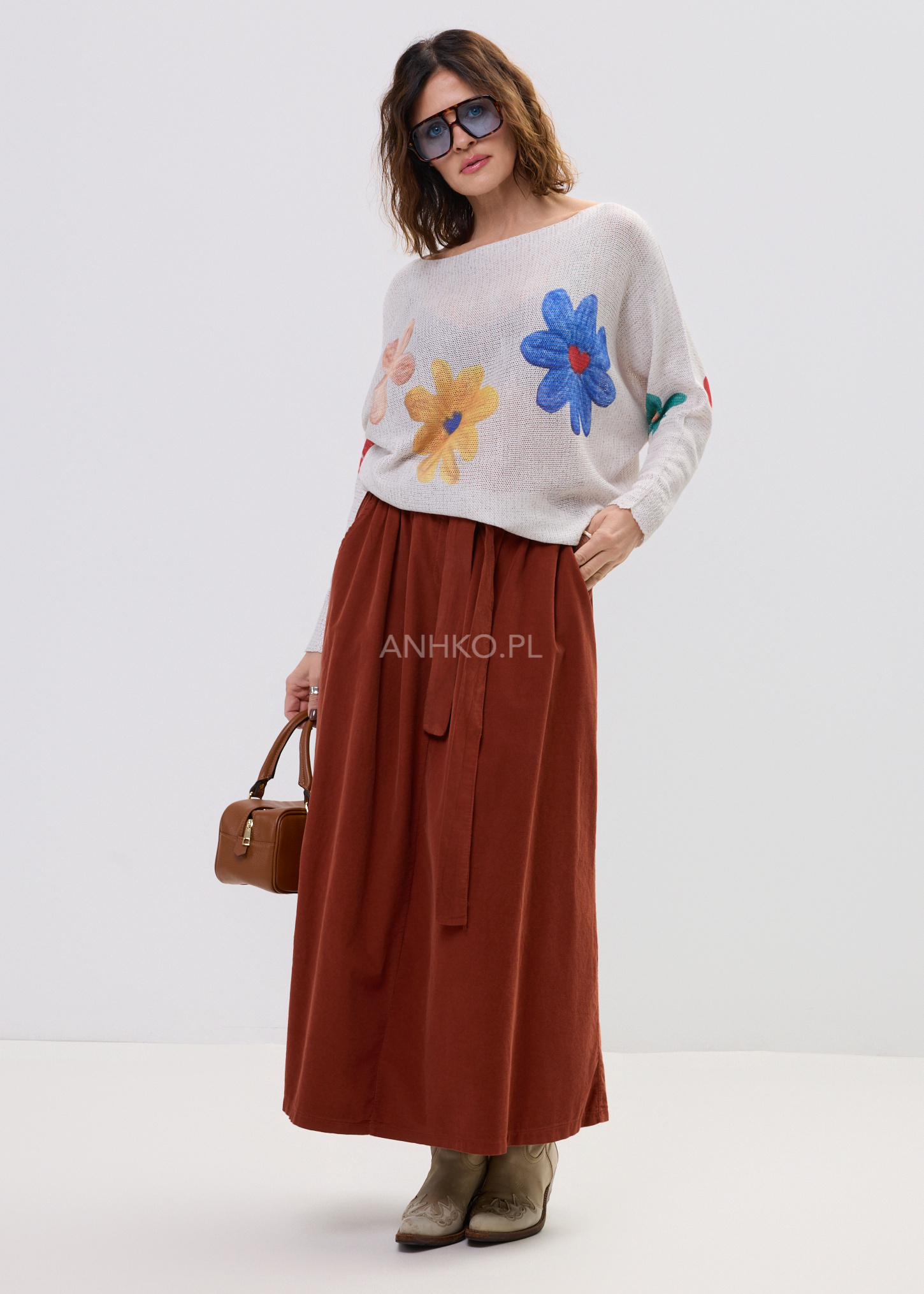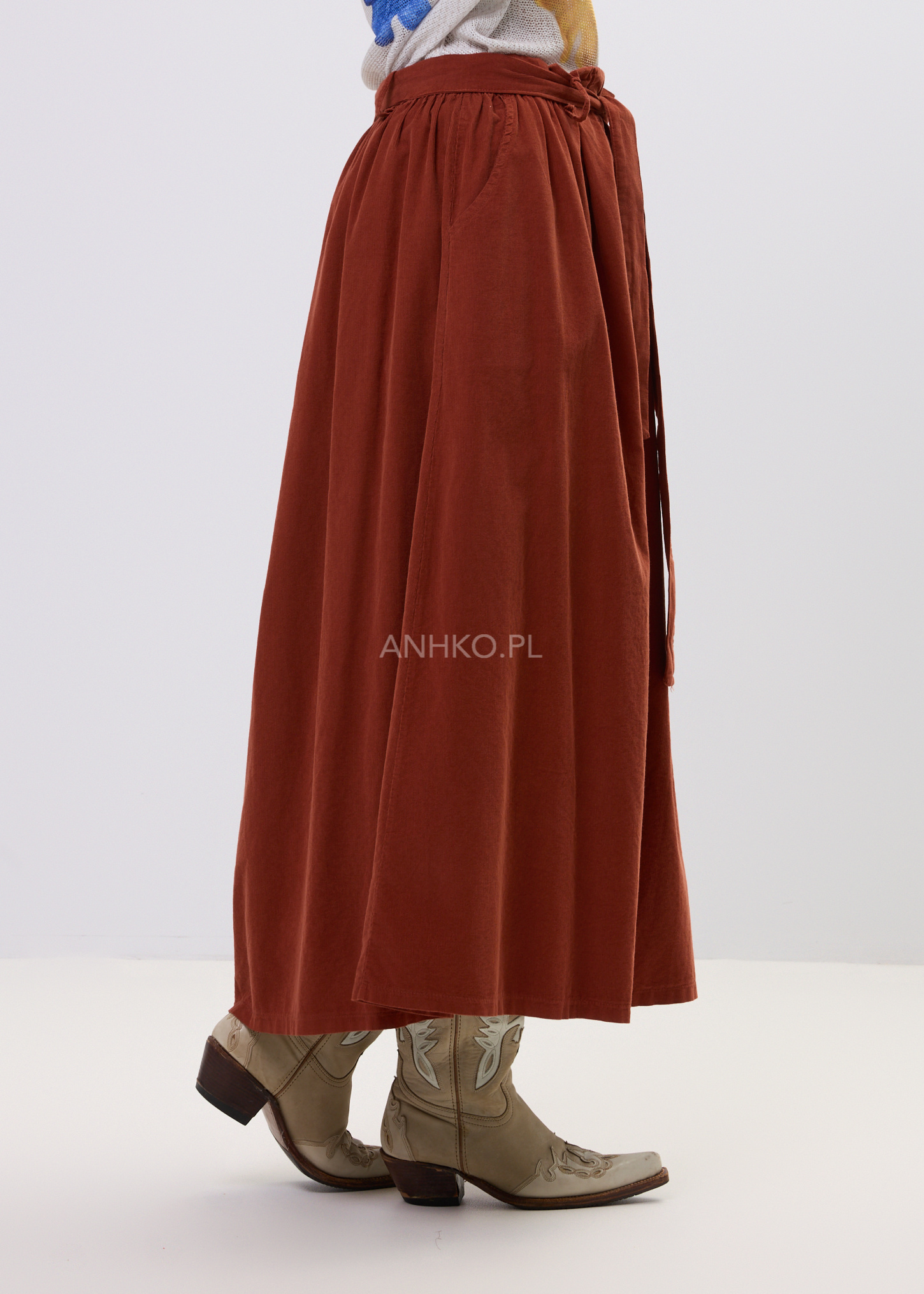Ta spódnica z wysokim stanem z miękkiego sztruksu pięknie akcentuje talię i swobodnie opływa sylwetkę aż do długości midi. Rozkloszowany dół pracuje w ruchu, nadając stylizacji lekkości, a wiązanie w pasie subtelnie podkreśla proporcje. Głęboki musztardowy kolor wprowadza wyrazisty, ale nadal ponadczasowy akcent.