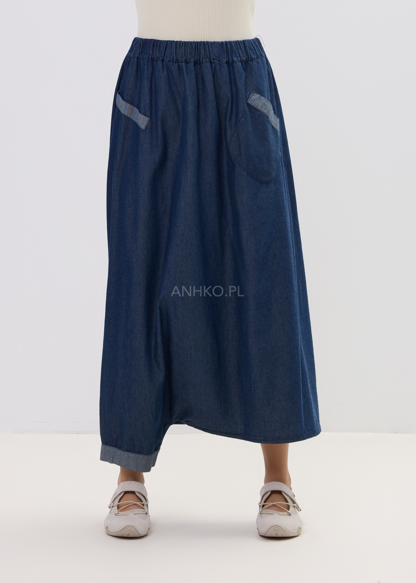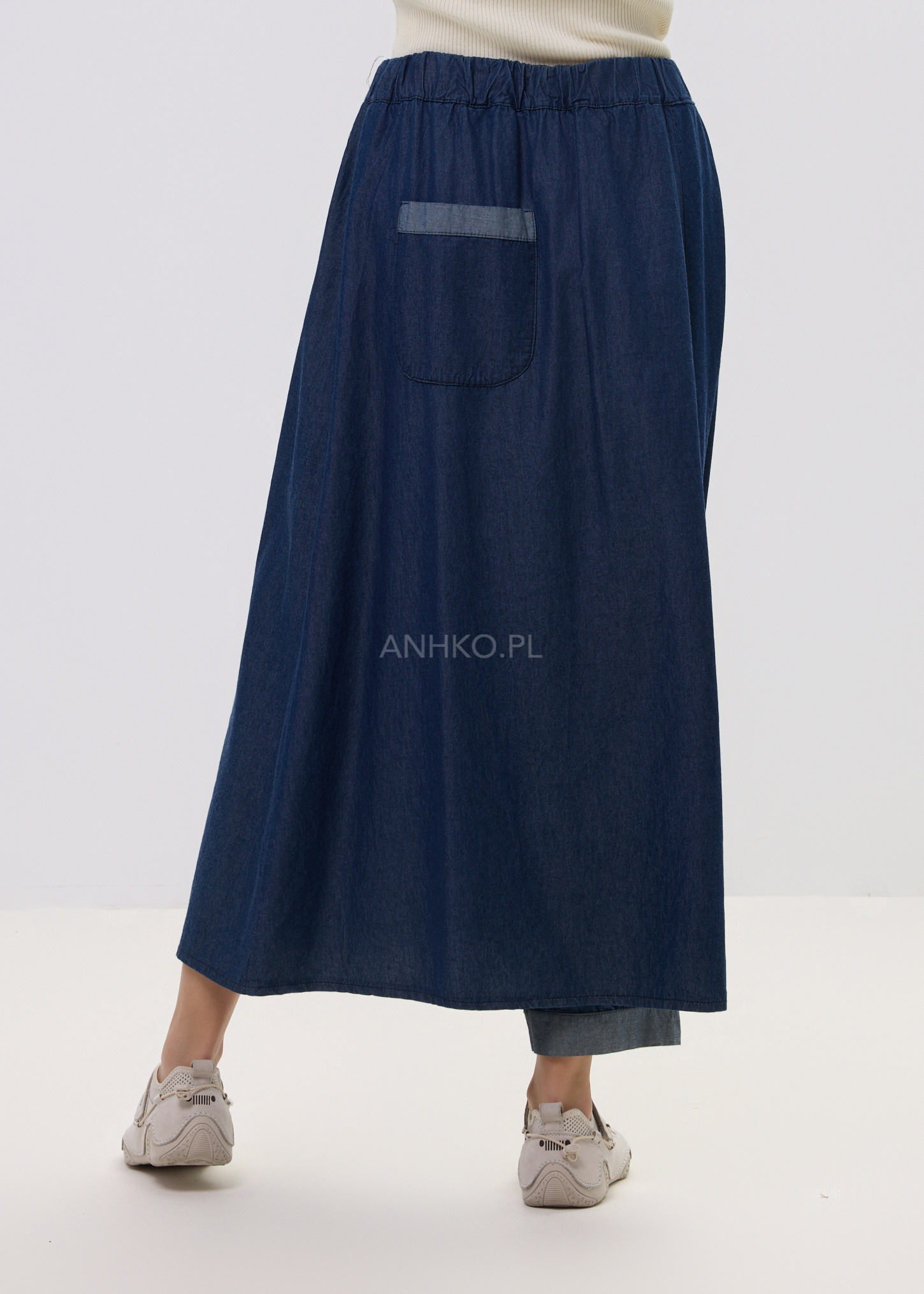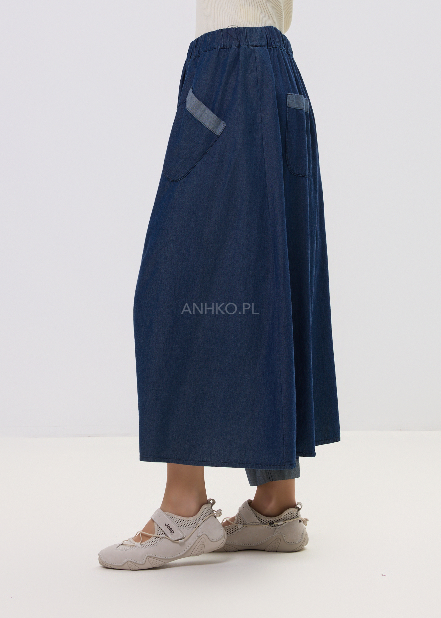 Ta spódnica midi wyróżnia się nietypową konstrukcją inspirowaną jedną nogawką, która nadaje sylwetce dynamiczny i nowoczesny charakter. Asymetryczny dół przyciąga uwagę i sprawia, że model układa się w ruchu w wyjątkowy sposób, podkreślając lekkość całej stylizacji. Rozkloszowany fason subtelnie akcentuje talię, a elastyczna gumka w pasie zapewnia pełną swobodę noszenia.