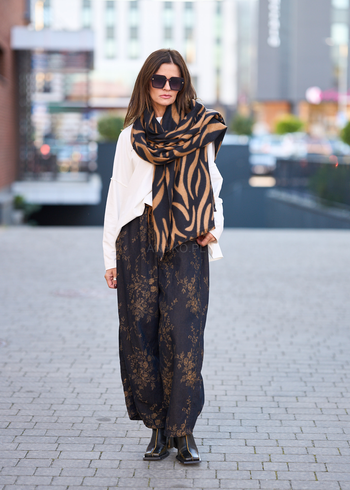 Szal Namibia Brązowo-Czarny - Miękki szalik w tygrysi wzór, który doda charakteru każdej stylizacji. Idealny na chłodne dni – łączy w sobie wygodę, ciepło i oryginalny design.