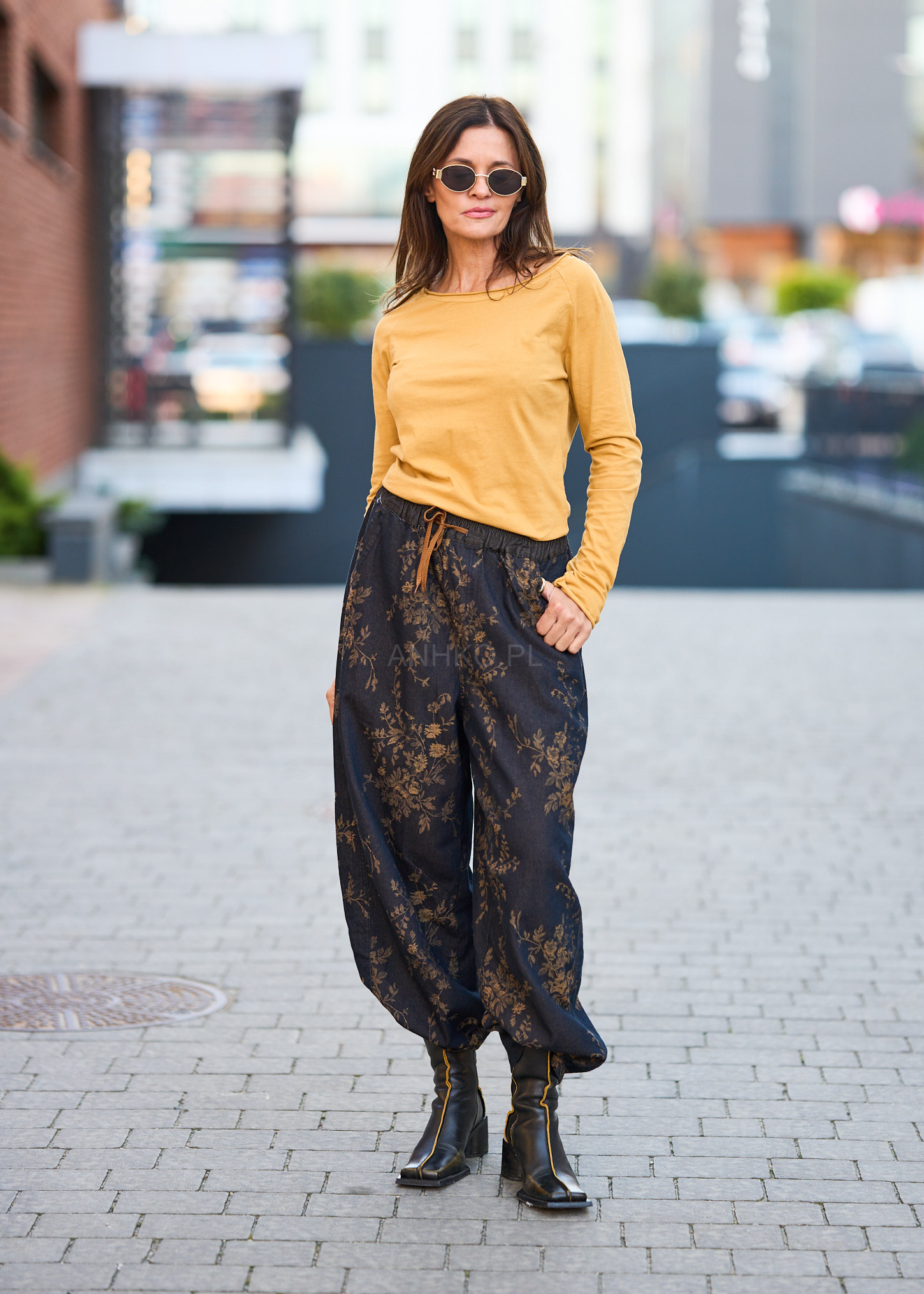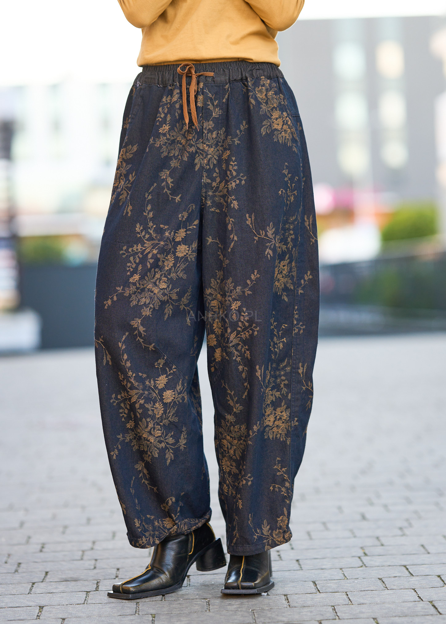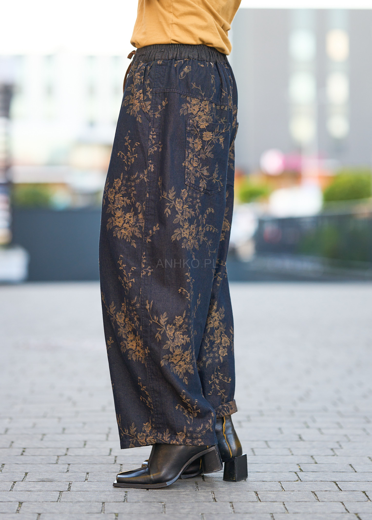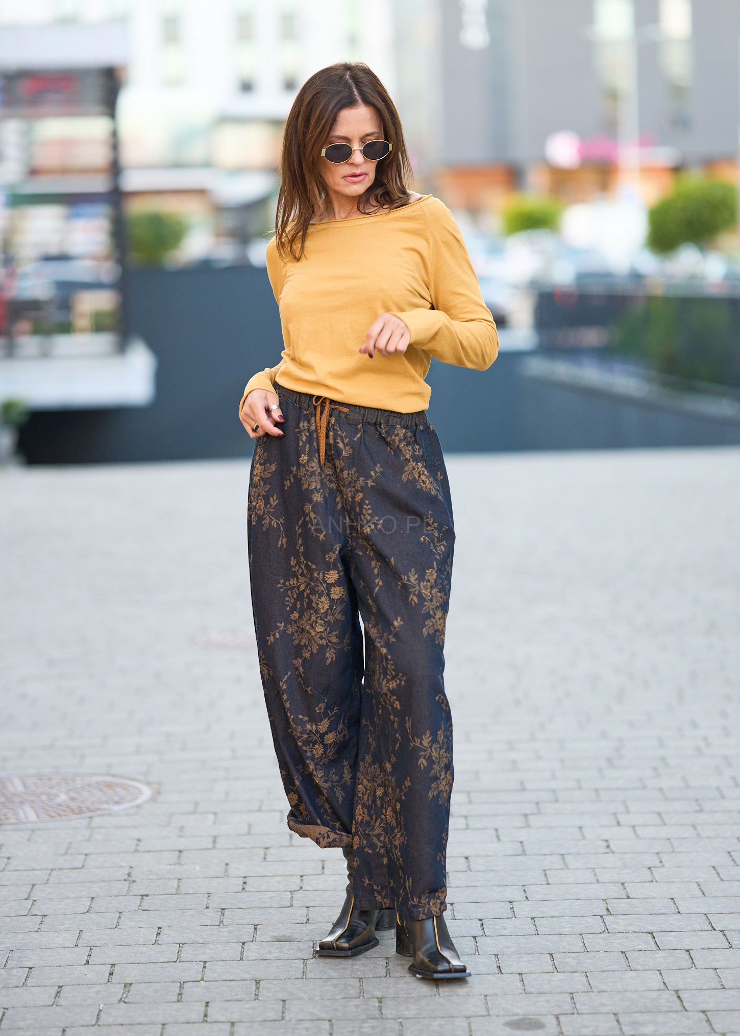 To połączenie wygody i elegancji w nowoczesnym wydaniu. Ciemna baza materiału została ozdobiona złotym, roślinnym wzorem, który nadaje im unikalnego, luksusowego charakteru. Luźny krój z elastycznym pasem gwarantuje komfort noszenia, a praktyczne kieszenie dodają funkcjonalności. Idealne zarówno do casualowych stylizacji z T-shirtem i sneakersami, jak i do bardziej eleganckich zestawów z koszulą lub marynarką. Sprawdzą się na co dzień, do pracy, na spotkania czy wieczorne wyjścia — wszędzie tam, gdzie chcesz wyglądać stylowo i czuć się swobodnie.