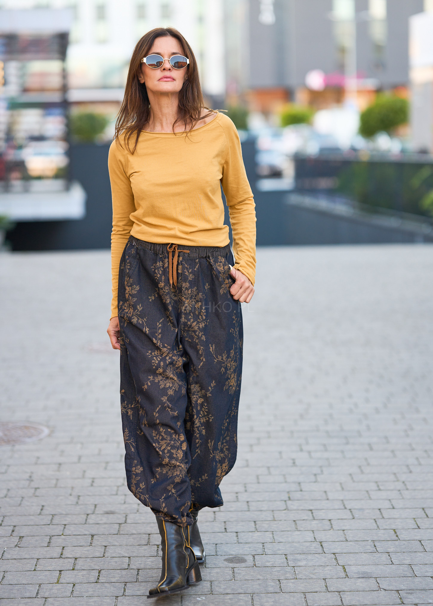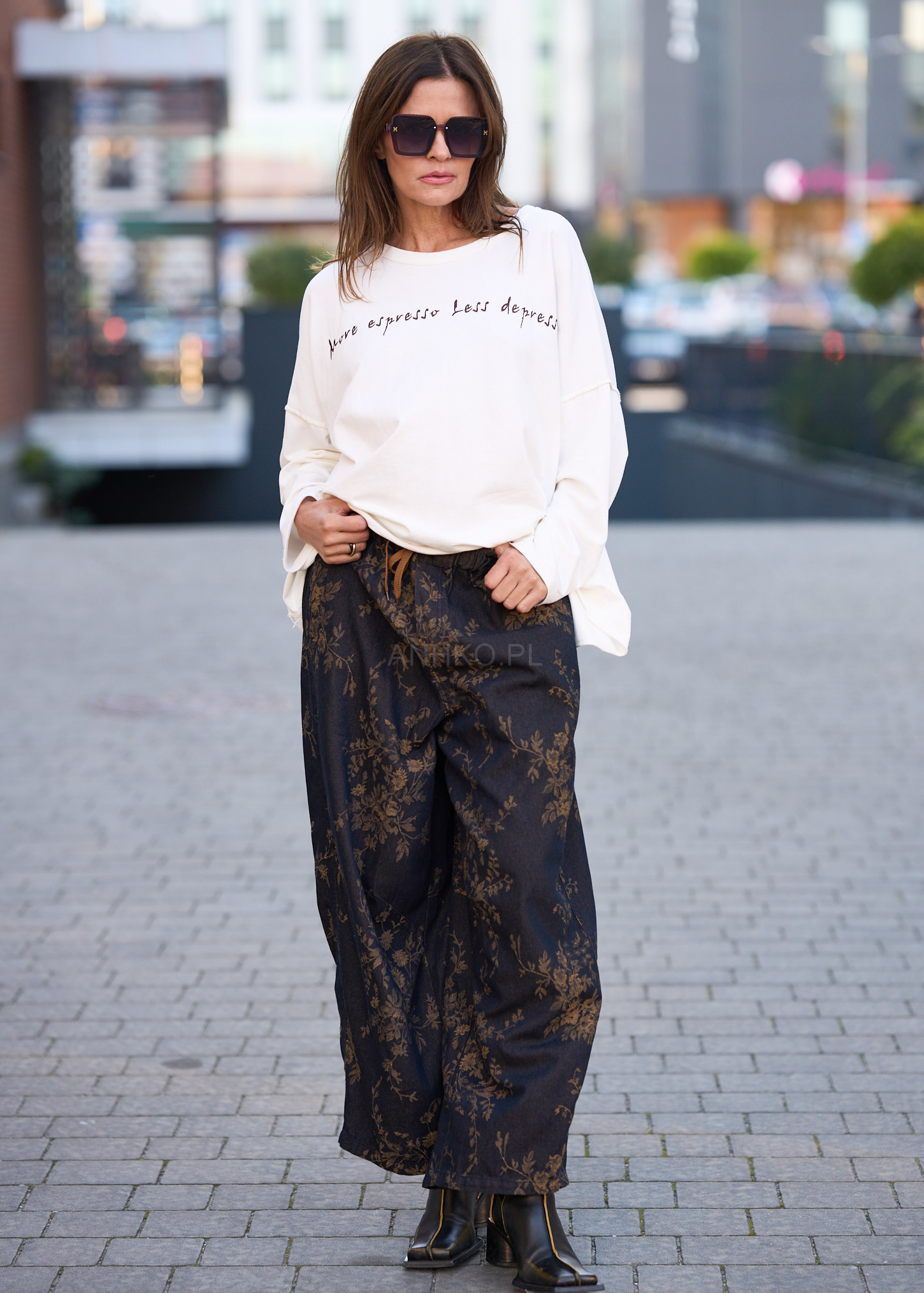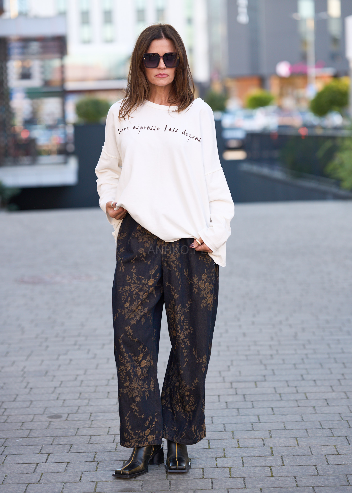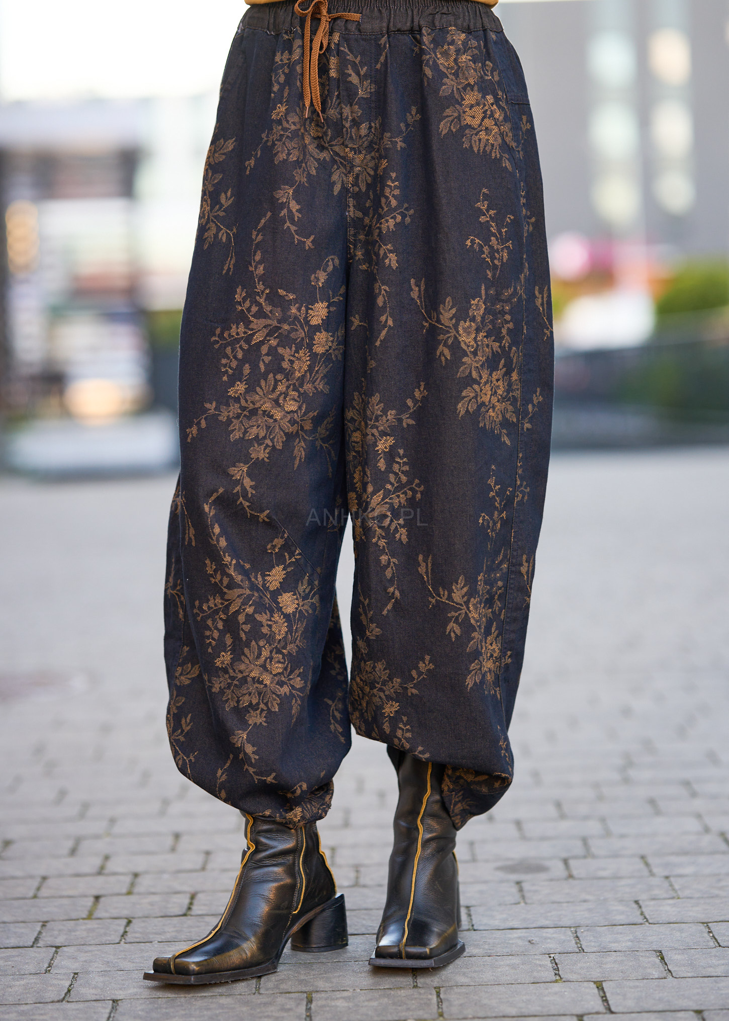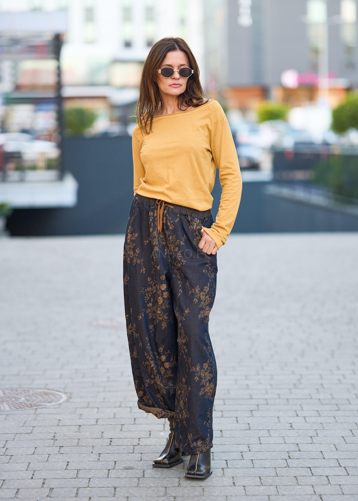 To połączenie wygody i elegancji w nowoczesnym wydaniu. Ciemna baza materiału została ozdobiona złotym, roślinnym wzorem, który nadaje im unikalnego, luksusowego charakteru. Luźny krój z elastycznym pasem gwarantuje komfort noszenia, a praktyczne kieszenie dodają funkcjonalności. Idealne zarówno do casualowych stylizacji z T-shirtem i sneakersami, jak i do bardziej eleganckich zestawów z koszulą lub marynarką. Sprawdzą się na co dzień, do pracy, na spotkania czy wieczorne wyjścia — wszędzie tam, gdzie chcesz wyglądać stylowo i czuć się swobodnie.