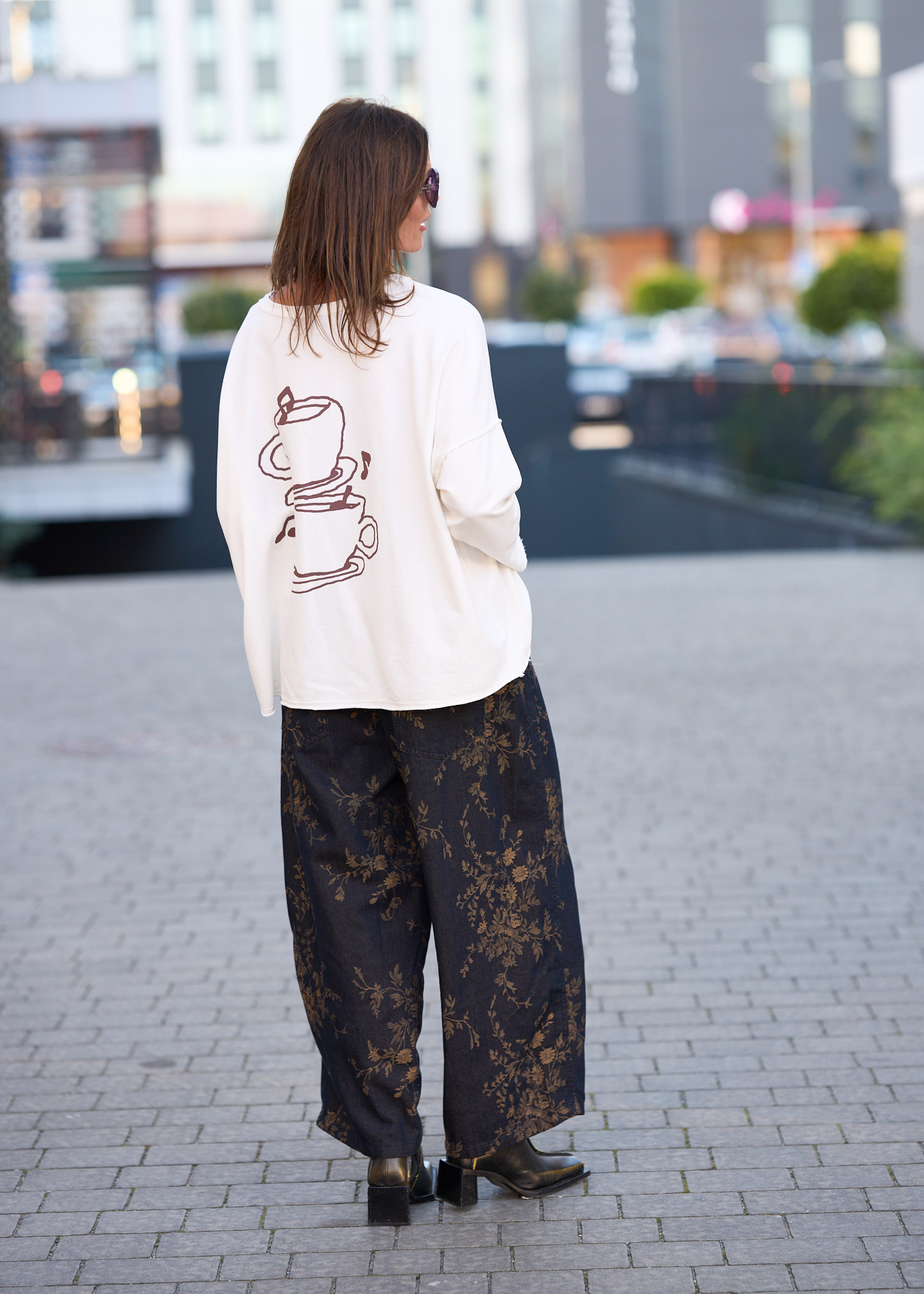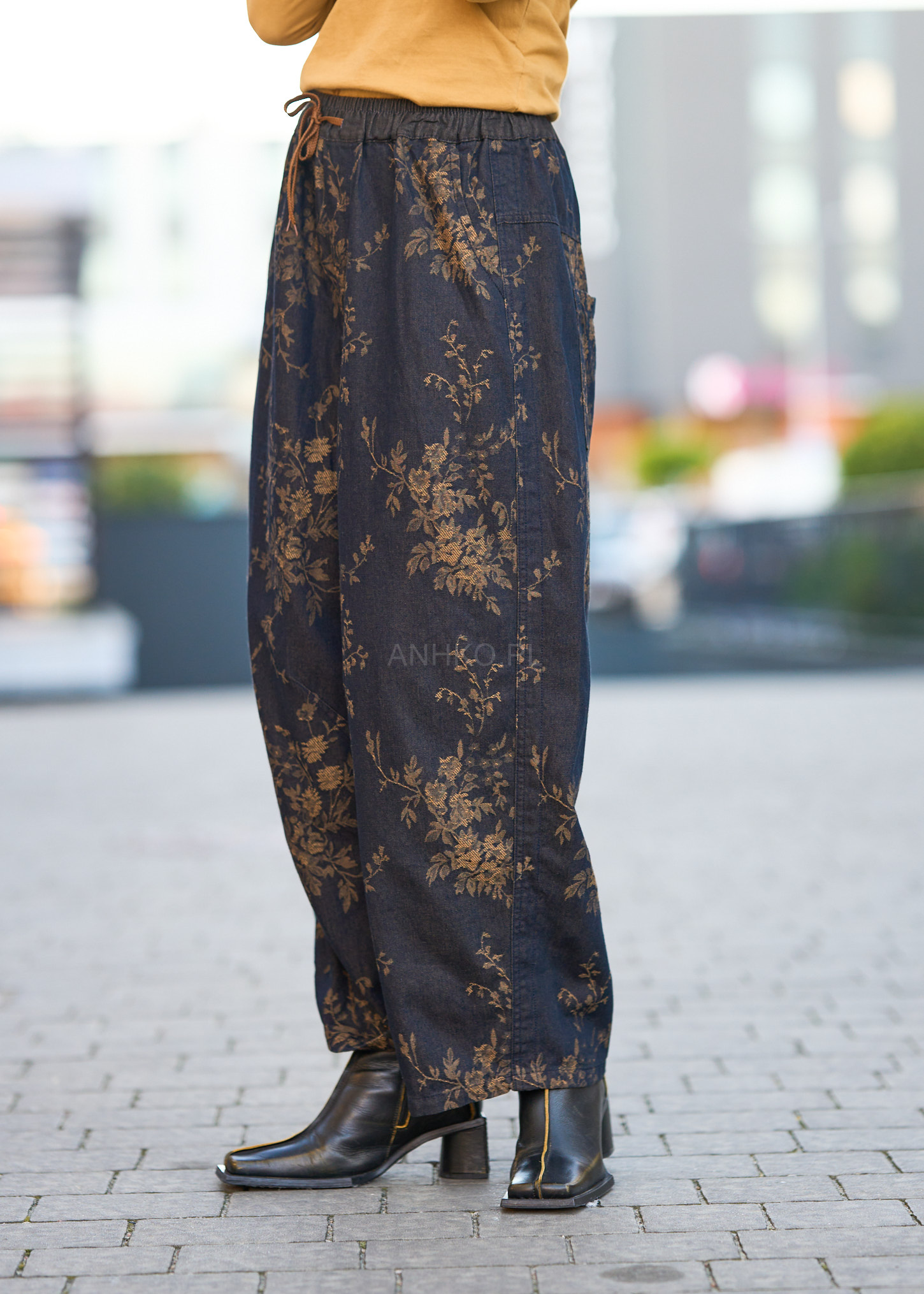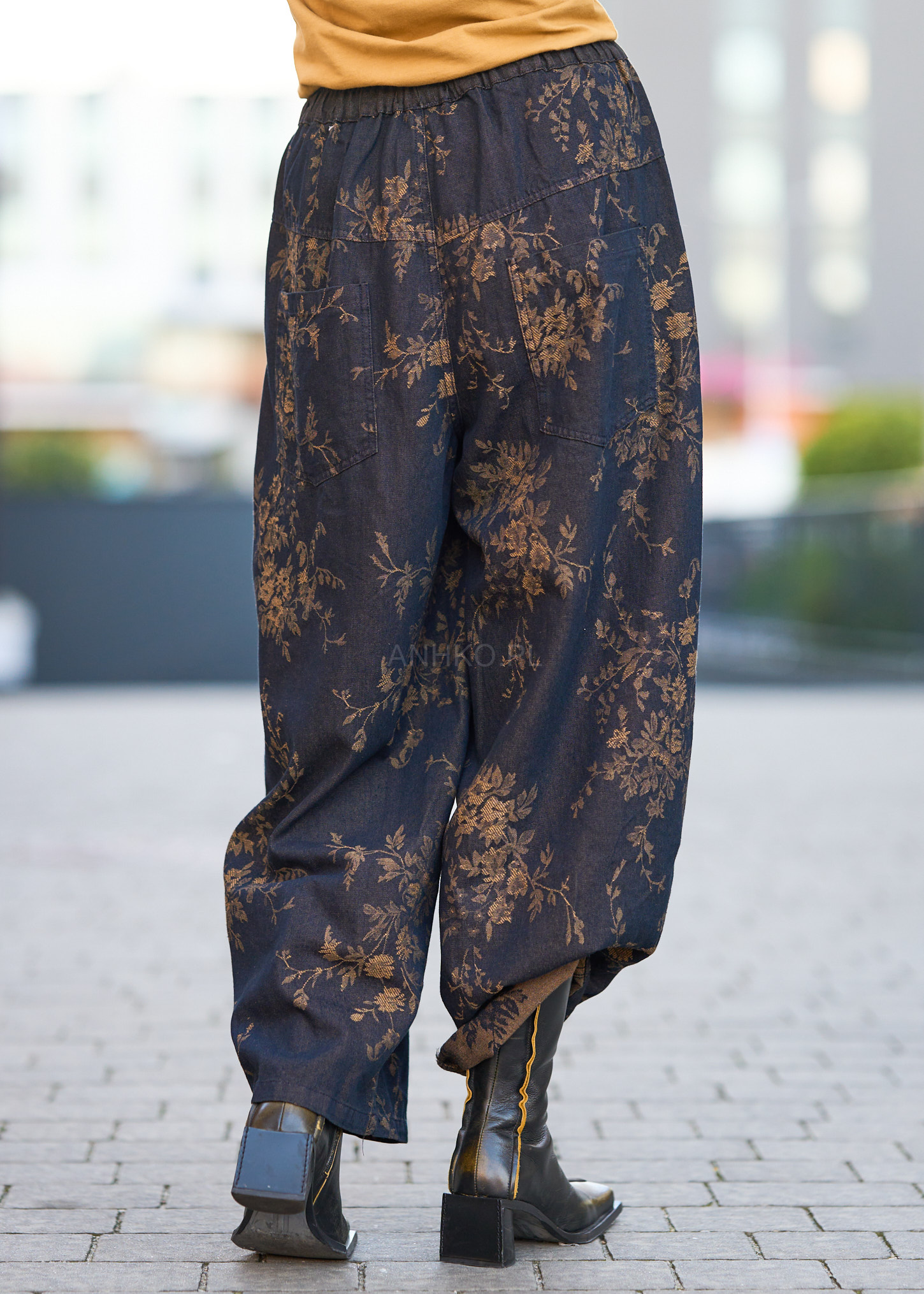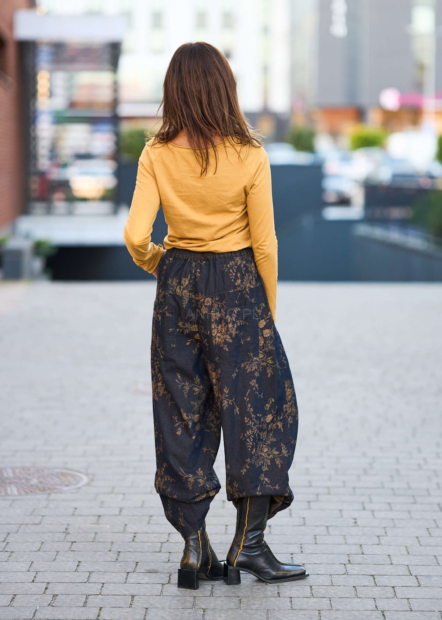 To połączenie wygody i elegancji w nowoczesnym wydaniu. Ciemna baza materiału została ozdobiona złotym, roślinnym wzorem, który nadaje im unikalnego, luksusowego charakteru. Luźny krój z elastycznym pasem gwarantuje komfort noszenia, a praktyczne kieszenie dodają funkcjonalności. Idealne zarówno do casualowych stylizacji z T-shirtem i sneakersami, jak i do bardziej eleganckich zestawów z koszulą lub marynarką. Sprawdzą się na co dzień, do pracy, na spotkania czy wieczorne wyjścia — wszędzie tam, gdzie chcesz wyglądać stylowo i czuć się swobodnie.