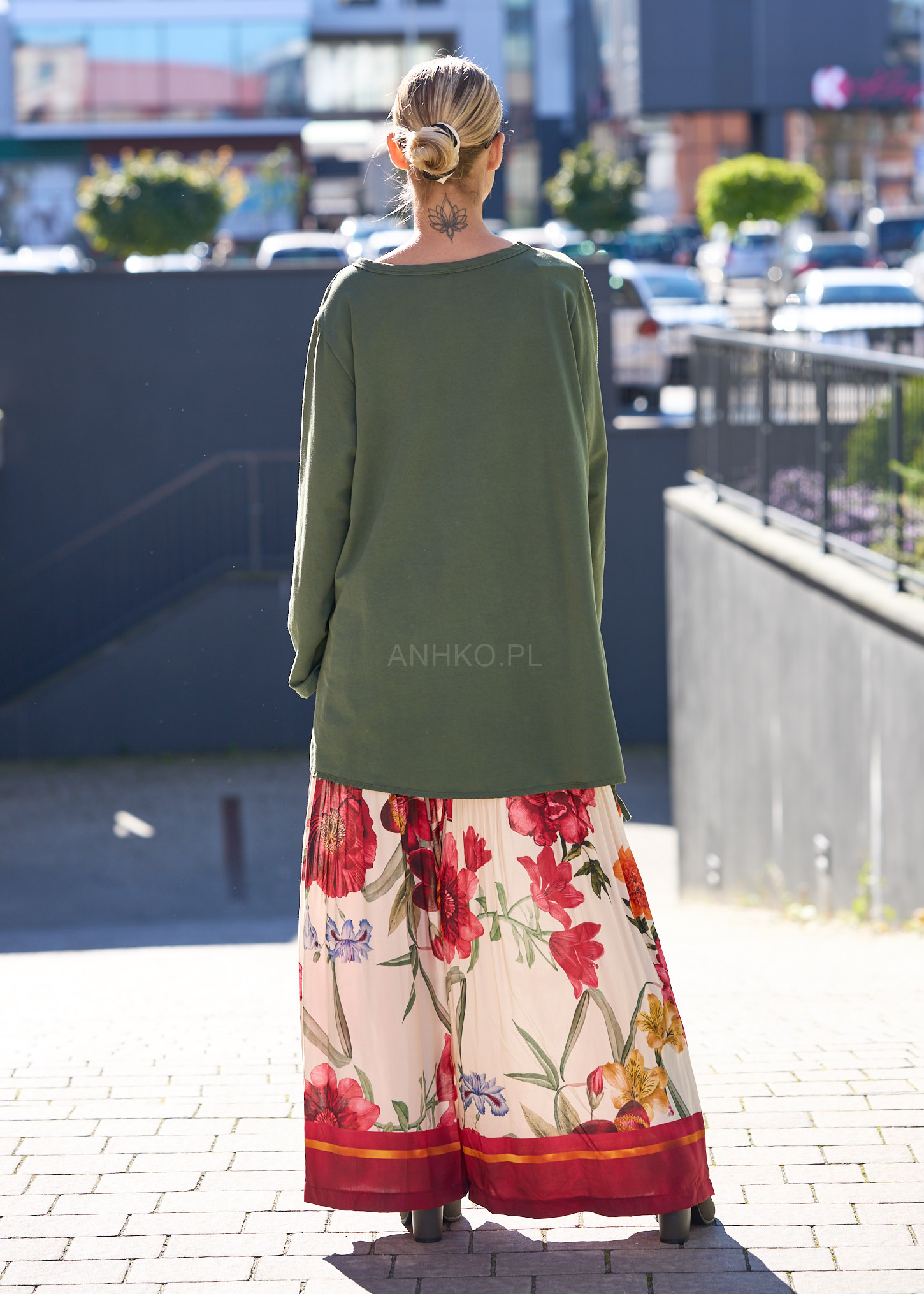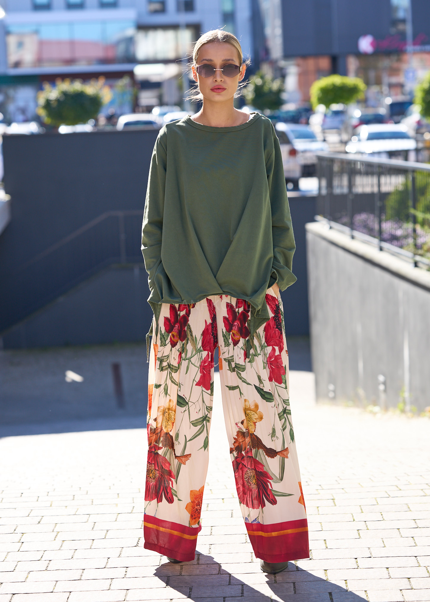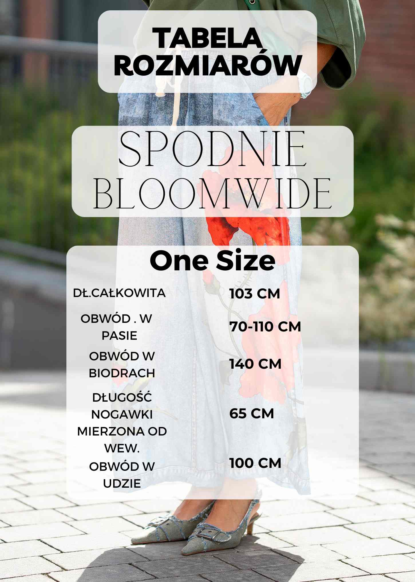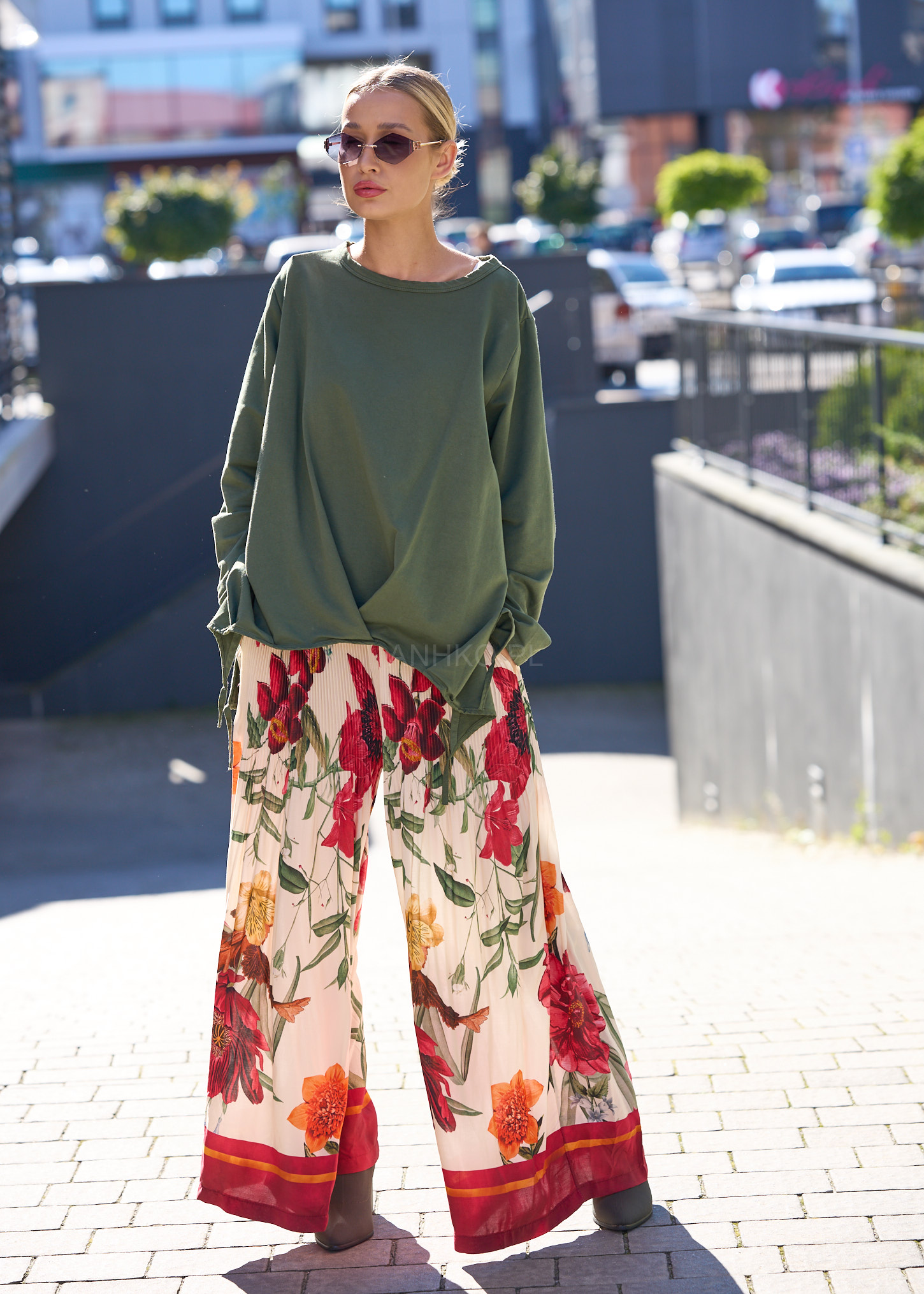 To kwintesencja letniej elegancji i swobody. Spodnie o szerokim kroju typu palazzo zostały wykonane z lekkiego, oddychającego materiału z domieszką wiskozy i bawełny. Plisowany materiał w dużym, malarskim, kwiatowym wzorze przyciąga wzrok i podkreśla kobiecą sylwetkę. Elastyczny pas w kolorze burgundu zapewnia komfort noszenia i idealne dopasowanie. Doskonale sprawdzą się w stylizacjach codziennych, wakacyjnych lub na letnie przyjęcia. Zestaw je z prostym topem i sandałkami na obcasie lub z espadrylami i kapeluszem, by uzyskać pełnię boho stylu.