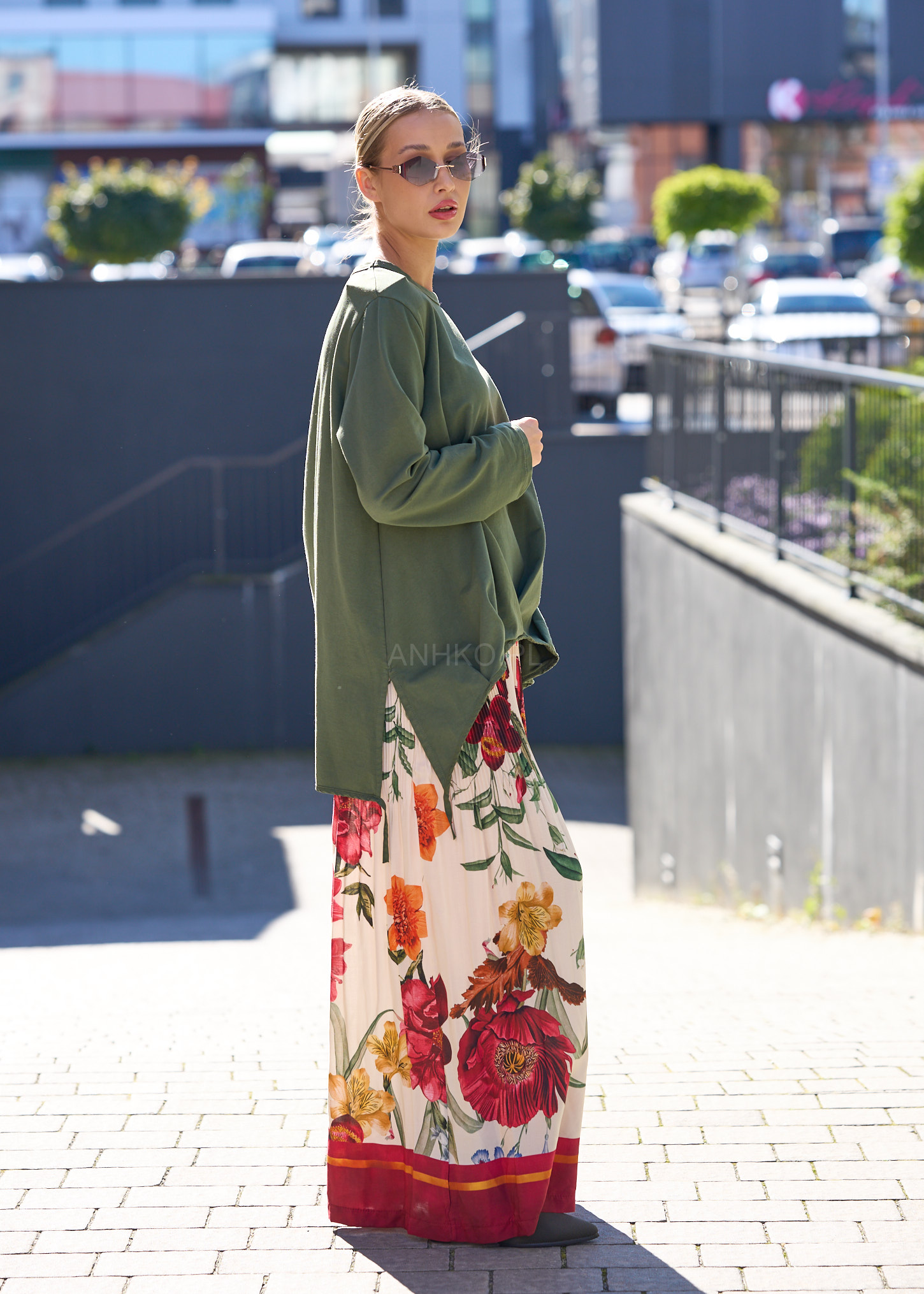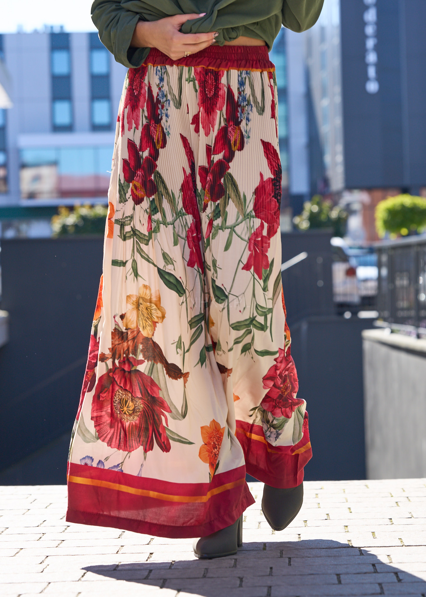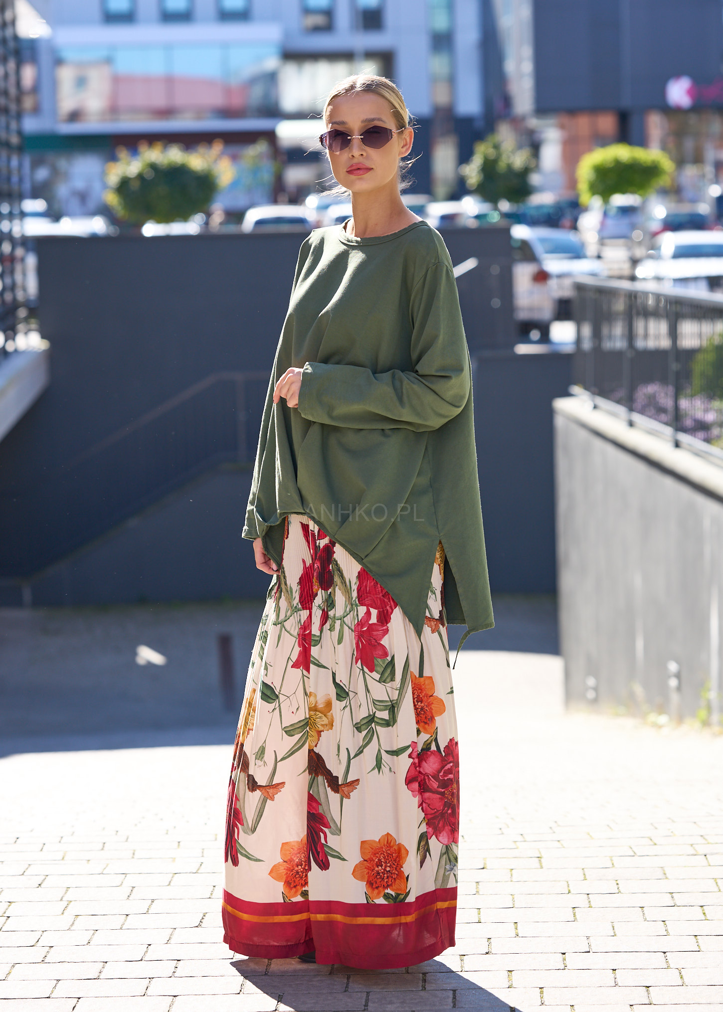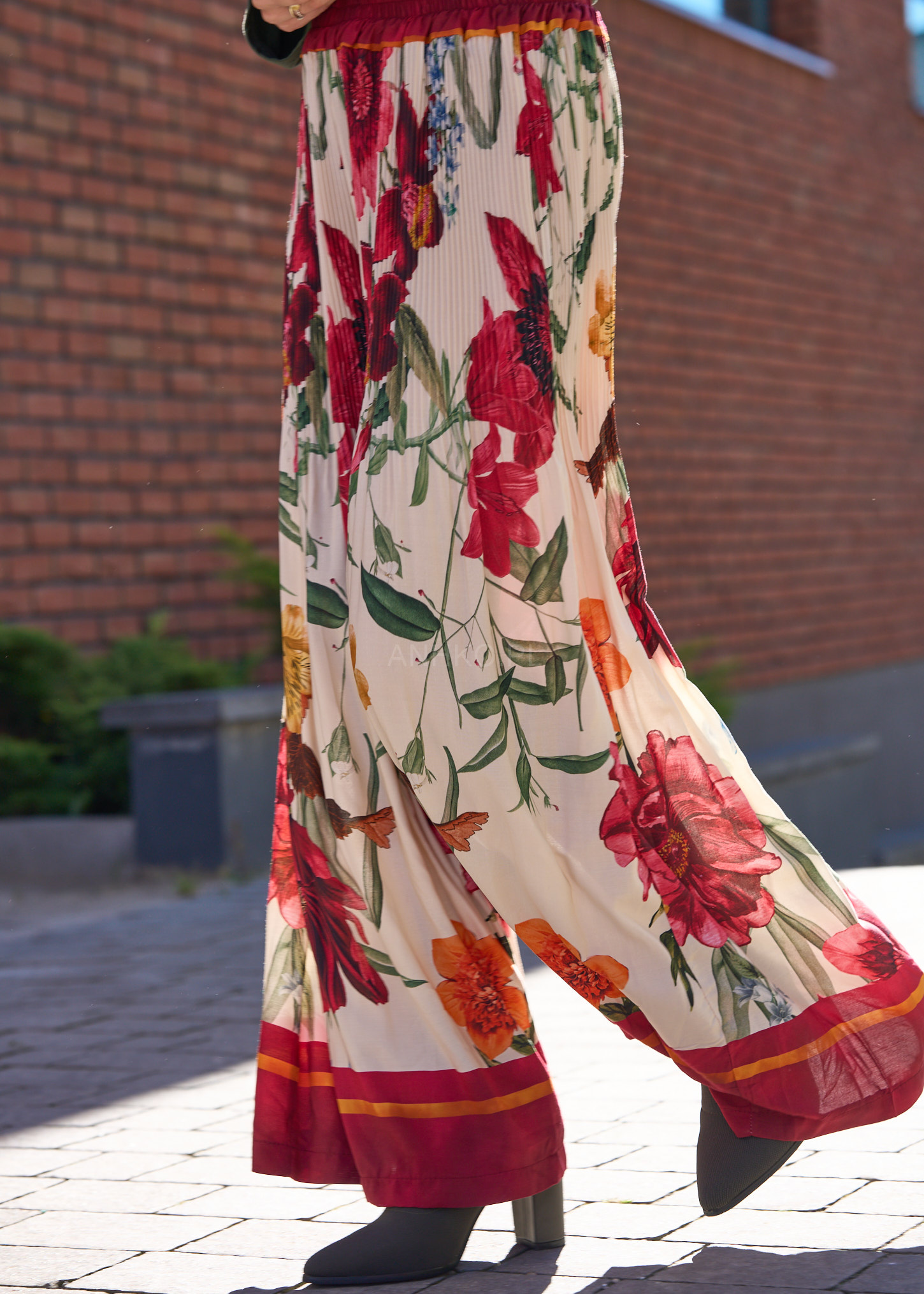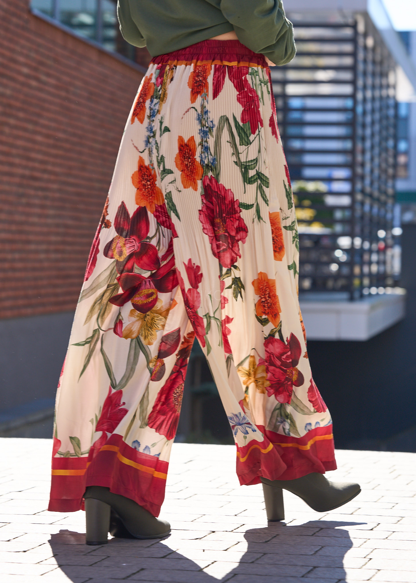 To kwintesencja letniej elegancji i swobody. Spodnie o szerokim kroju typu palazzo zostały wykonane z lekkiego, oddychającego materiału z domieszką wiskozy i bawełny. Plisowany materiał w dużym, malarskim, kwiatowym wzorze przyciąga wzrok i podkreśla kobiecą sylwetkę. Elastyczny pas w kolorze burgundu zapewnia komfort noszenia i idealne dopasowanie. Doskonale sprawdzą się w stylizacjach codziennych, wakacyjnych lub na letnie przyjęcia. Zestaw je z prostym topem i sandałkami na obcasie lub z espadrylami i kapeluszem, by uzyskać pełnię boho stylu.