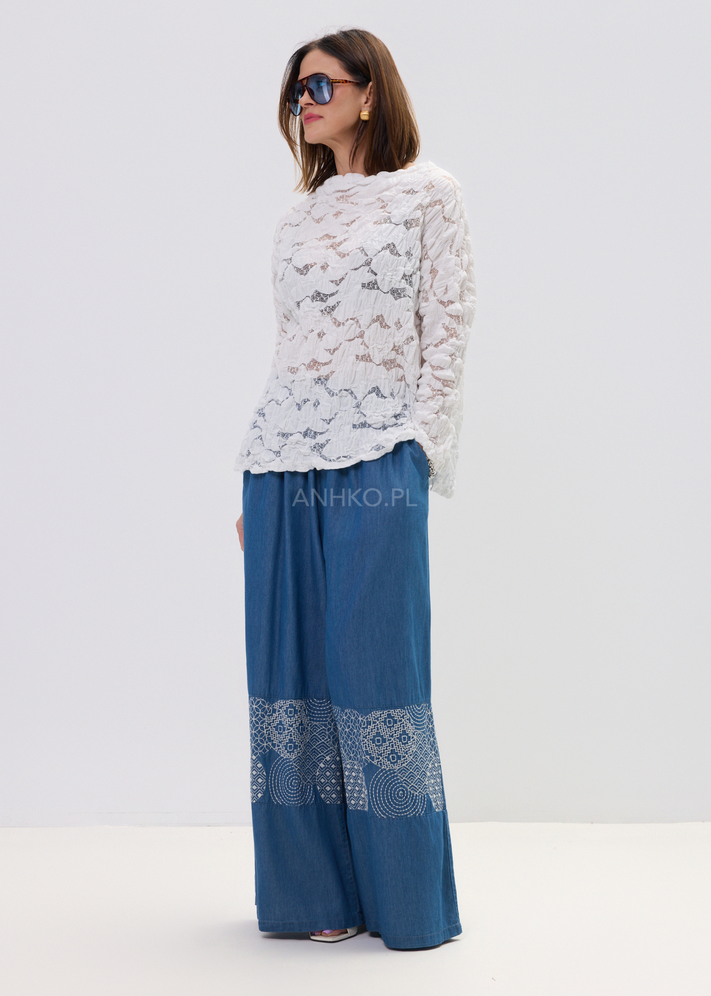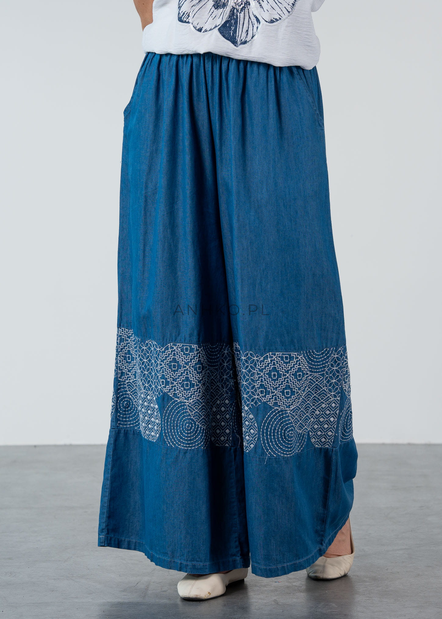 To wyjątkowe spodnie z lekkiego, przewiewnego materiału przypominającego denim, które łączą komfort i styl. Szerokie nogawki oraz ozdobny, biały haft nadają im boho-charakter i sprawiają, że każda stylizacja staje się niepowtarzalna. Dzięki elastycznemu pasowi spodnie świetnie dopasowują się do sylwetki, a praktyczne kieszenie podnoszą funkcjonalność modelu. Idealne na wiosnę i lato — zarówno na spacer, urlop, jak i luźne spotkania ze znajomymi. Łącz je z białą bluzką, sandałami lub espadrylami, by uzyskać lekki, kobiecy look z nutą włoskiego luzu.