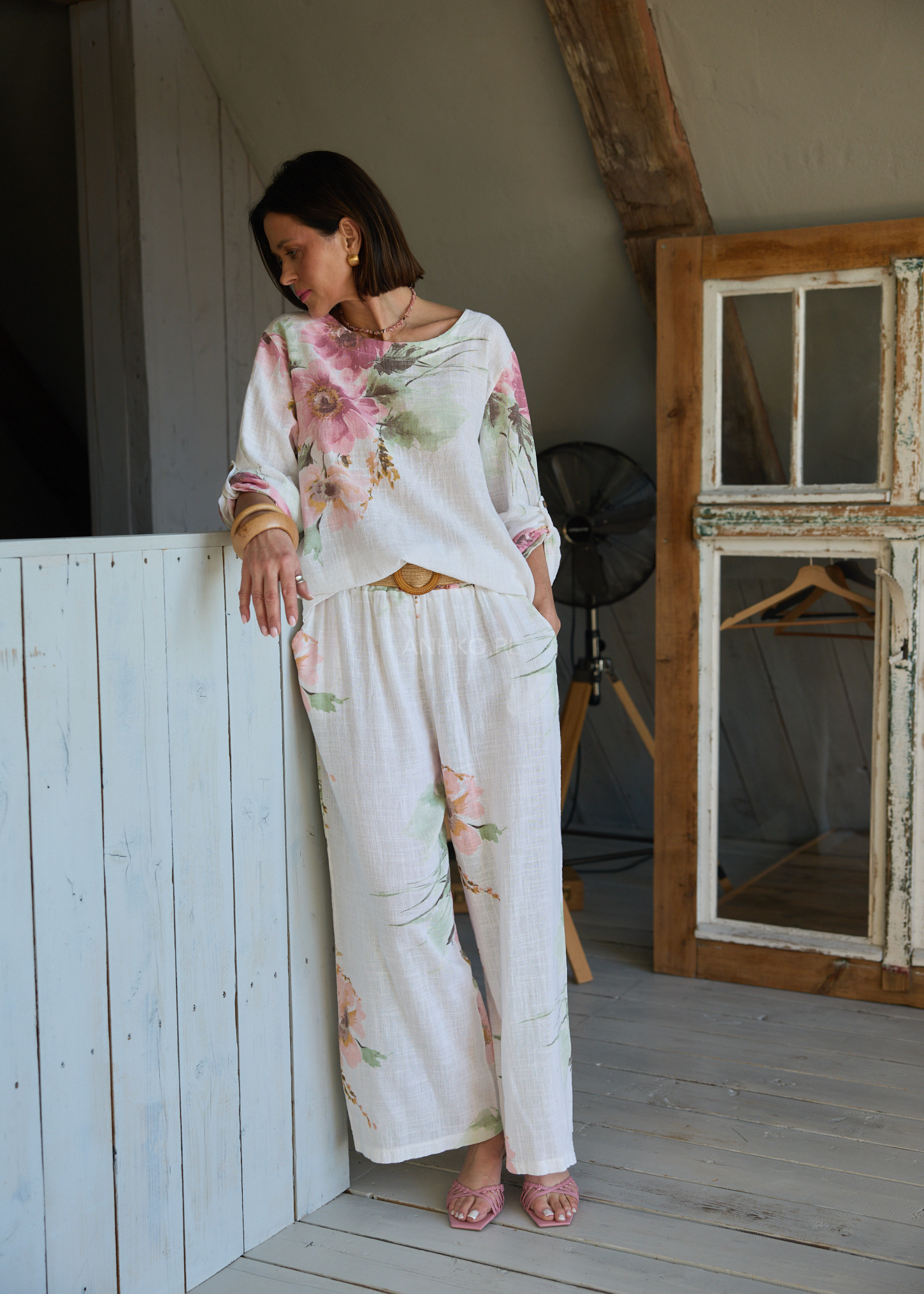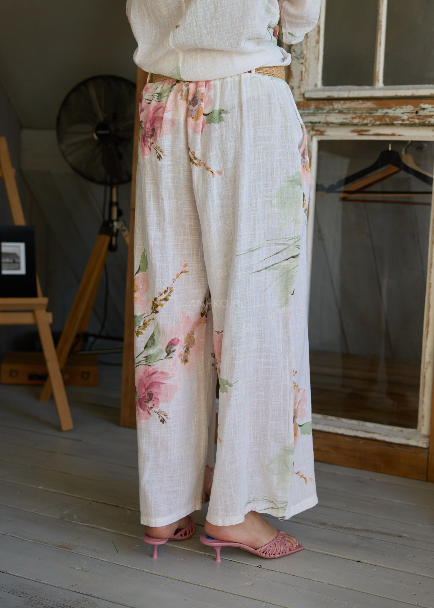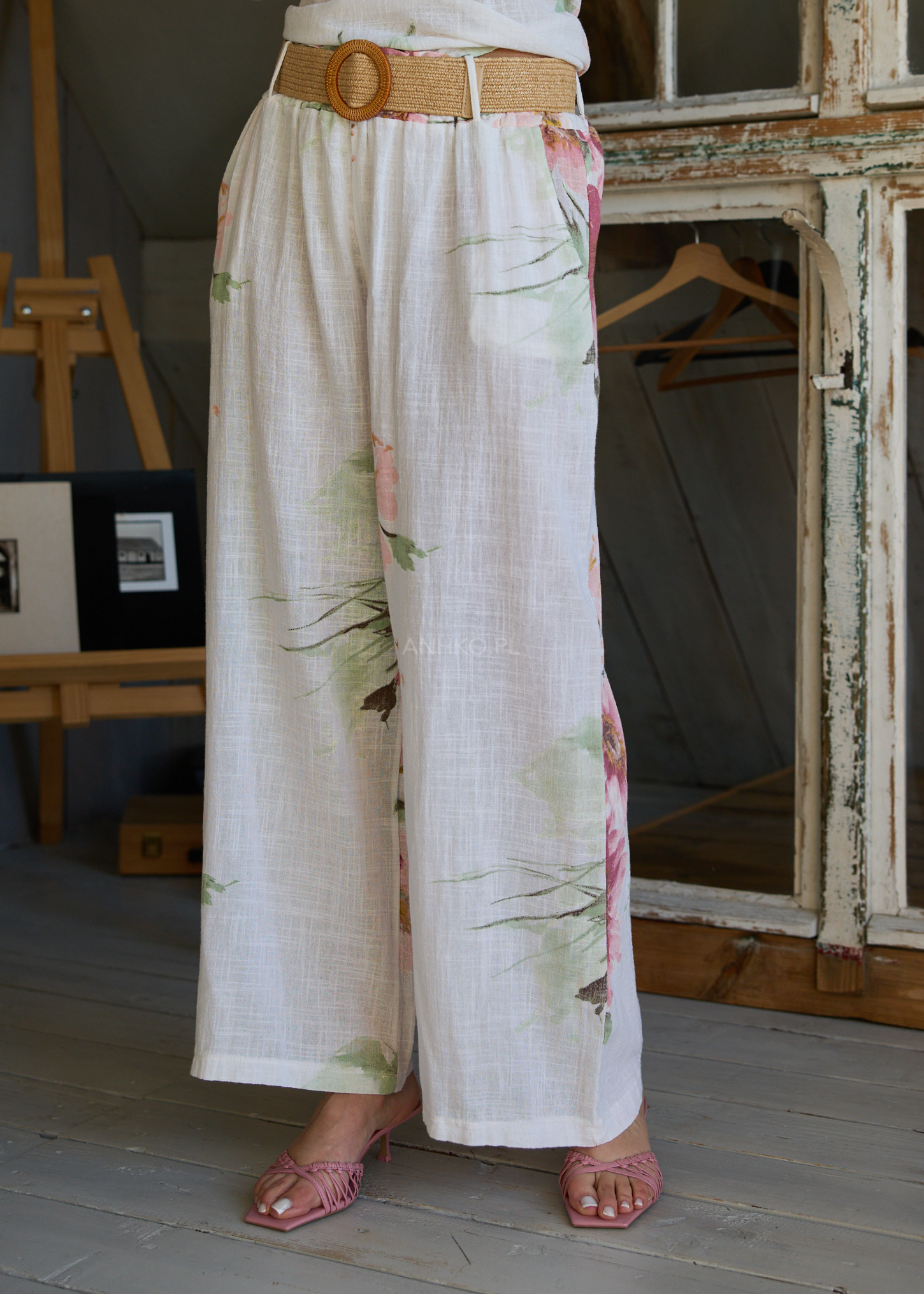 Te spodnie damskie wide leg wyróżniają się lekką formą, która naturalnie układa się na sylwetce i zapewnia pełną swobodę ruchu. Szerokie nogawki miękko opadają, tworząc efekt płynnej linii, a elastyczna talia dopasowuje się do ciała bez uczucia ucisku. Subtelny, kwiatowy print w pastelowych tonach nadaje całości artystycznego i kobiecego charakteru.