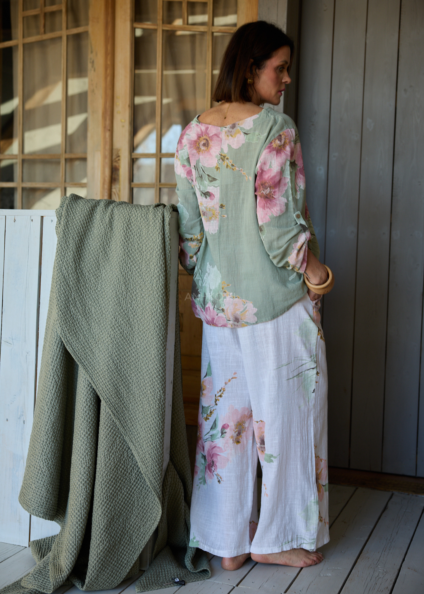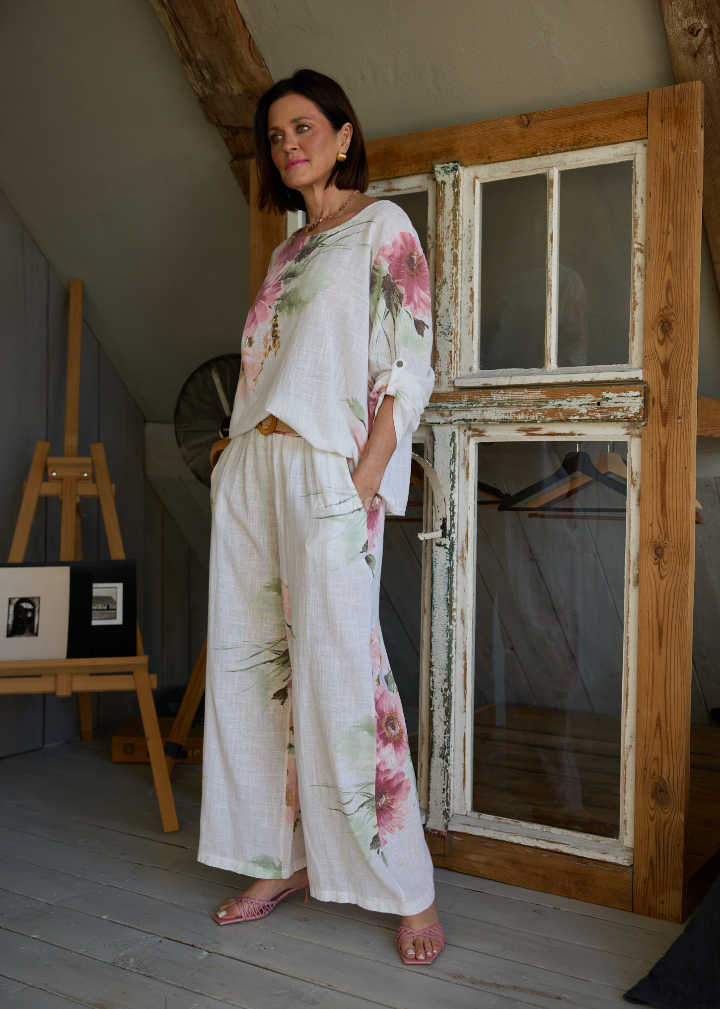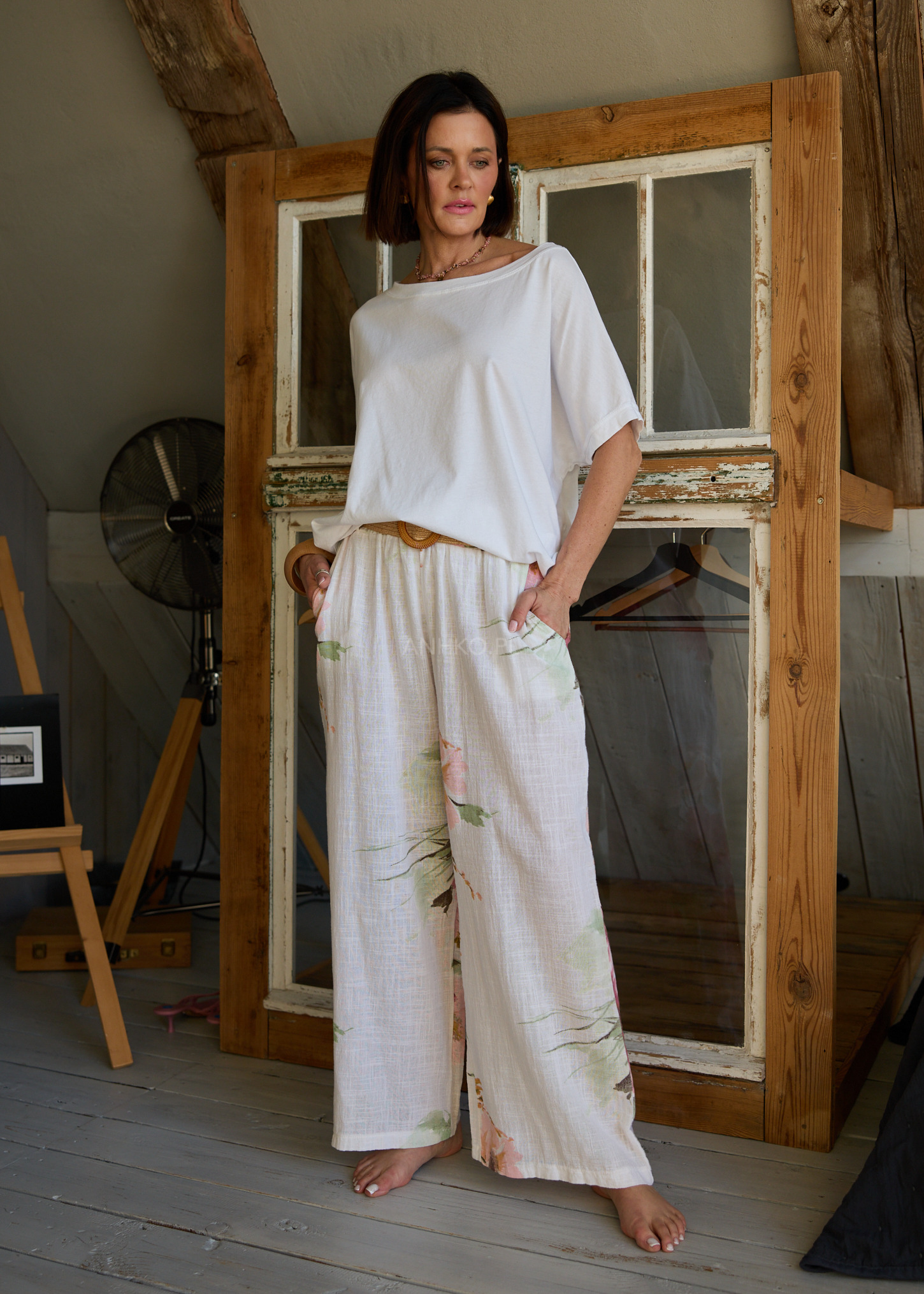 Te spodnie damskie wide leg wyróżniają się lekką formą, która naturalnie układa się na sylwetce i zapewnia pełną swobodę ruchu. Szerokie nogawki miękko opadają, tworząc efekt płynnej linii, a elastyczna talia dopasowuje się do ciała bez uczucia ucisku. Subtelny, kwiatowy print w pastelowych tonach nadaje całości artystycznego i kobiecego charakteru.