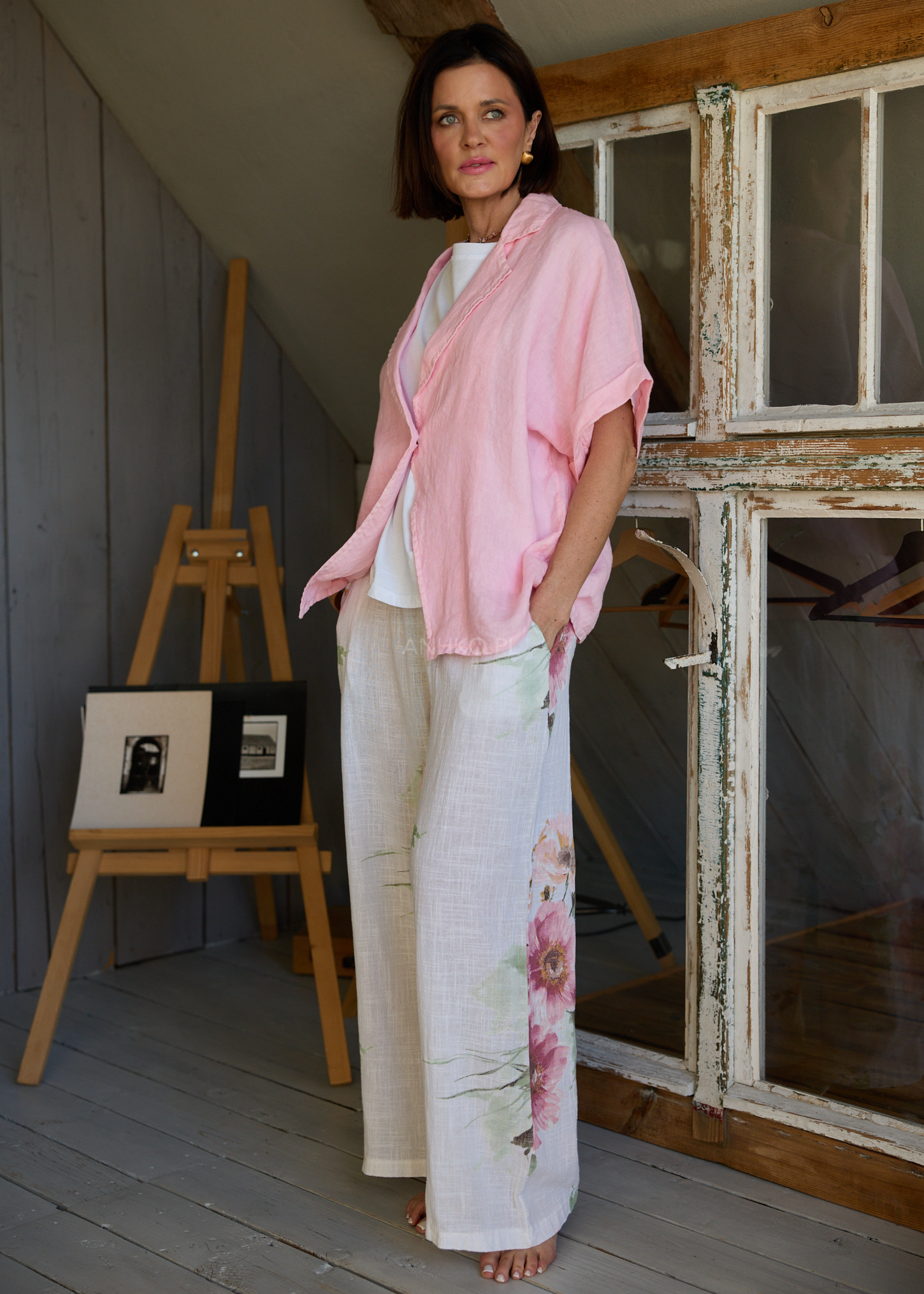 Marynarka Lniana Sollompia Pudrowo Różowa - Lekka jak powietrze lniana marynarka w odcieniu pudrowo różowym . Swobodny krój i minimalistyczna forma sprawiają, że to idealny wybór na lato – zarzucasz i gotowe.