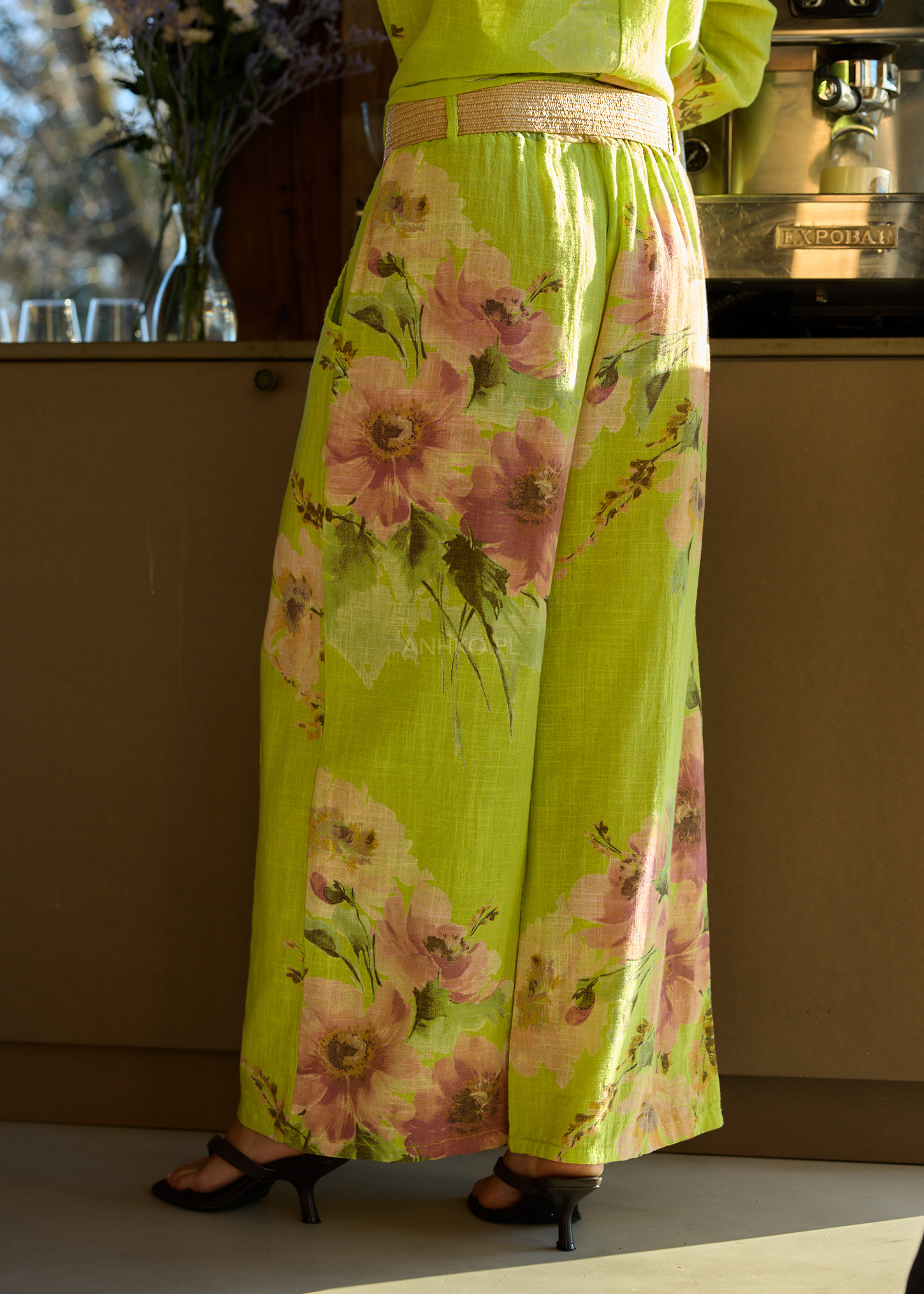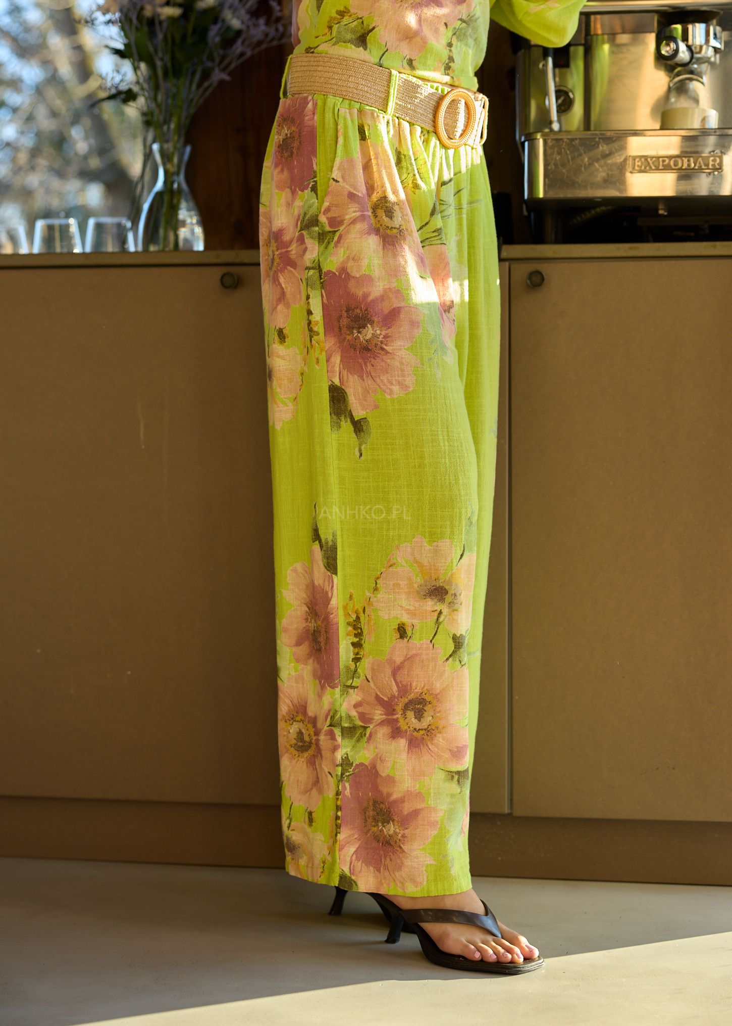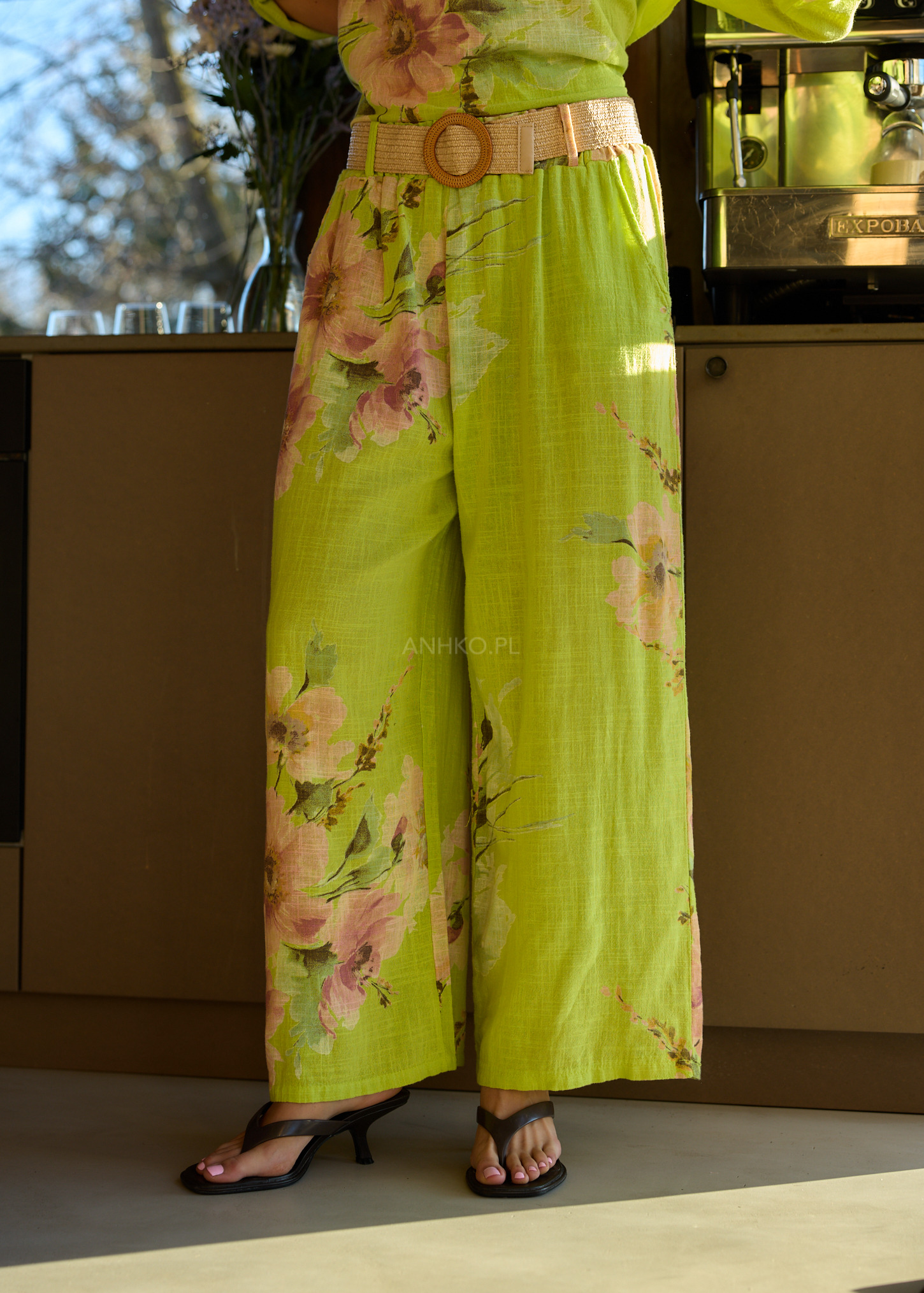 Te spodnie damskie wide leg wyróżniają się lekką formą, która naturalnie układa się na sylwetce i zapewnia pełną swobodę ruchu. Szerokie nogawki miękko opadają, tworząc efekt płynnej linii, a elastyczna talia dopasowuje się do ciała bez uczucia ucisku. Subtelny, kwiatowy print w zielonych tonach nadaje całości artystycznego i kobiecego charakteru.