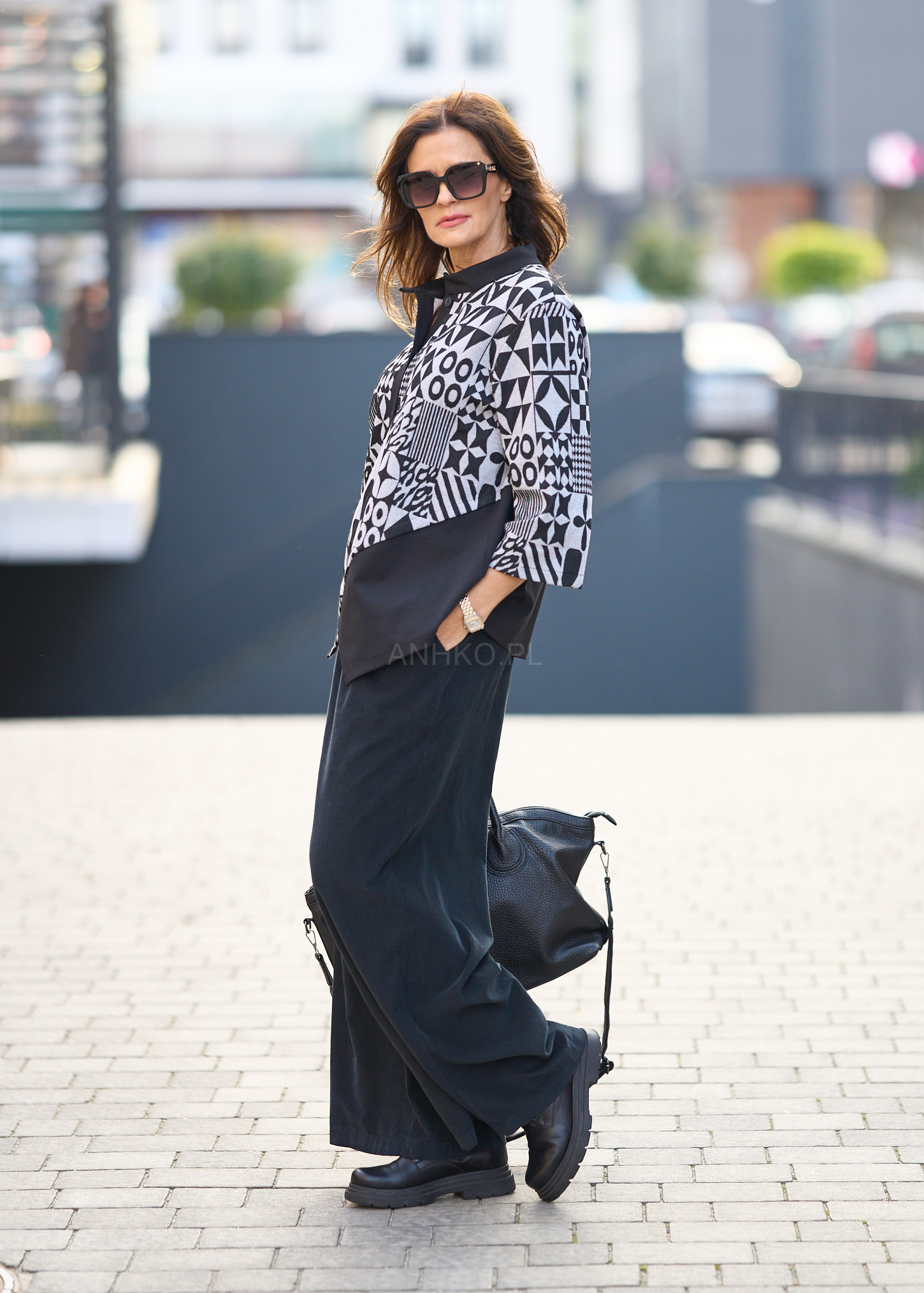 Bluzka Geomet Czarno-Szara - Odważna bluzka w geometryczne wzory, wykonana we Włoszech, łącząca unikalny design z wygodą. Idealna na codzienne wyjścia i kreatywne okazje.