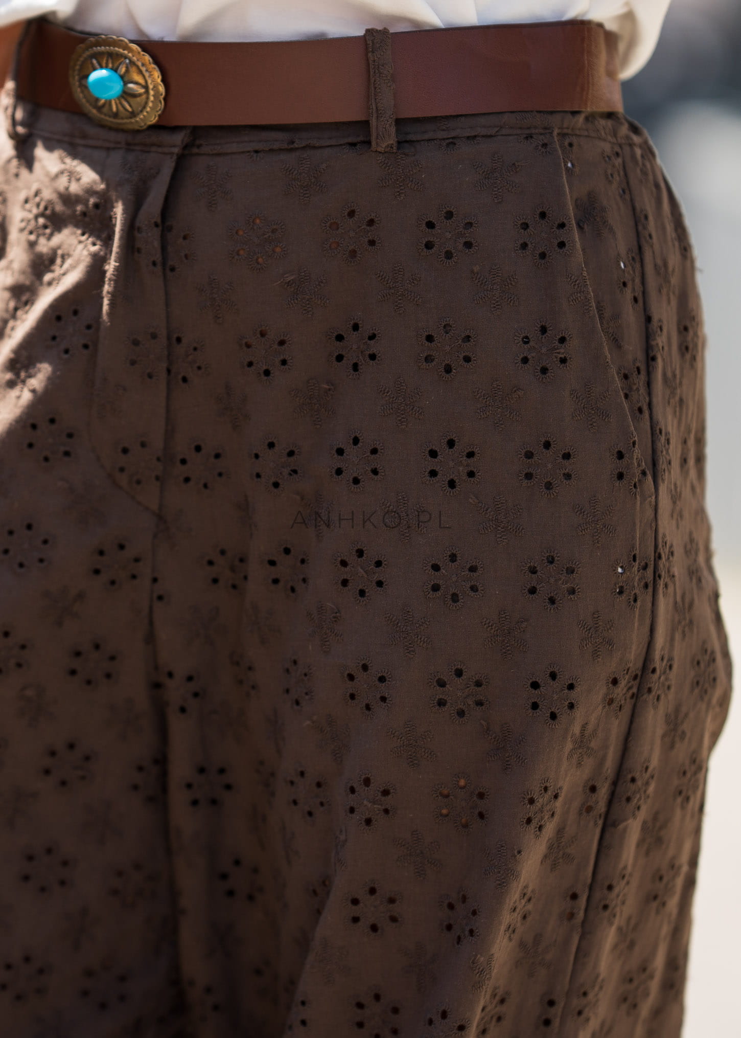 Stylowe, szerokie spodnie w odcieniu ciepłego brązu, które łączą w sobie wygodę i wyjątkowy charakter. Ich ozdobą są delikatne, ażurowe hafty w kwiatowy wzór, doskonale nawiązujące do boho estetyki. Luźny fason z szerokimi nogawkami gwarantuje pełną swobodę ruchów i świetnie sprawdza się w upalne dni. Spodnie idealnie wyglądają w komplecie z dopasowaną bluzką z zestawu, ale również w połączeniu z jednolitym topem, koszulą lub lekką tuniką.