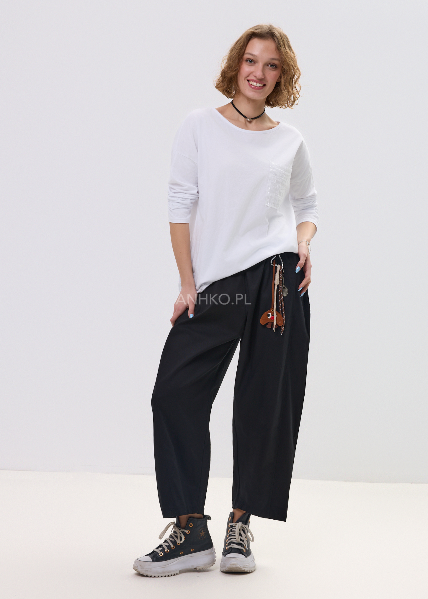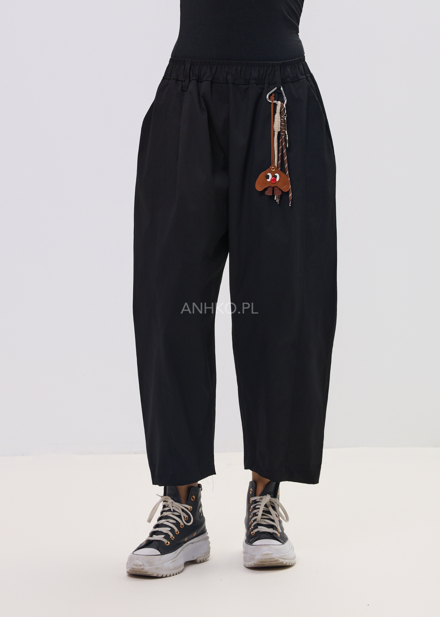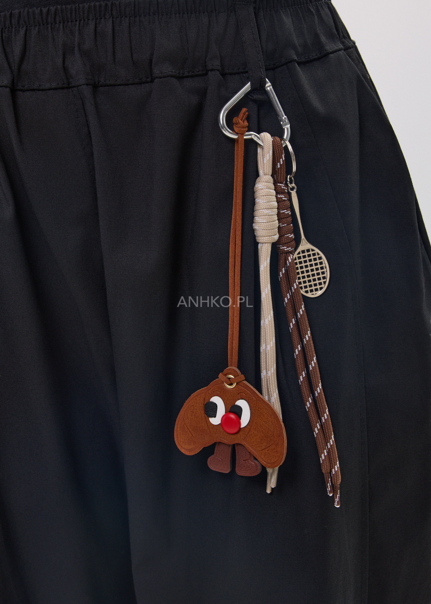 Elastyczny pas z regulowanym troczkiem pozwala idealnie dopasować spodnie do sylwetki, a praktyczne kieszenie zwiększają ich funkcjonalność. Całość dopełnia ozdobny brelok, który nadaje modelowi charakteru i subtelnego, miejskiego akcentu. To uniwersalny element garderoby, który świetnie komponuje się z T-shirtem, koszulą oversize czy lekkim swetrem, tworząc wygodny casualowy look na co dzień.