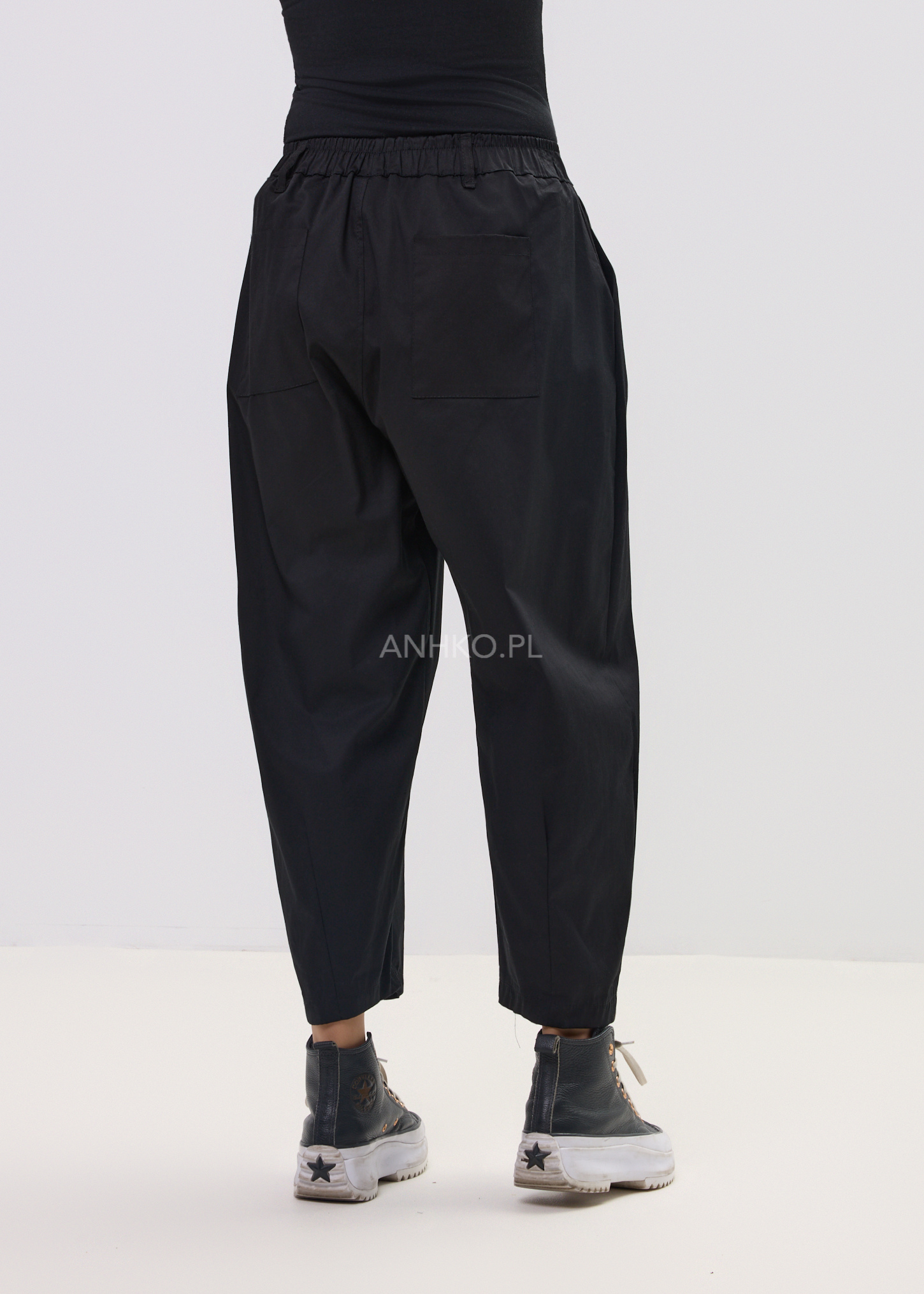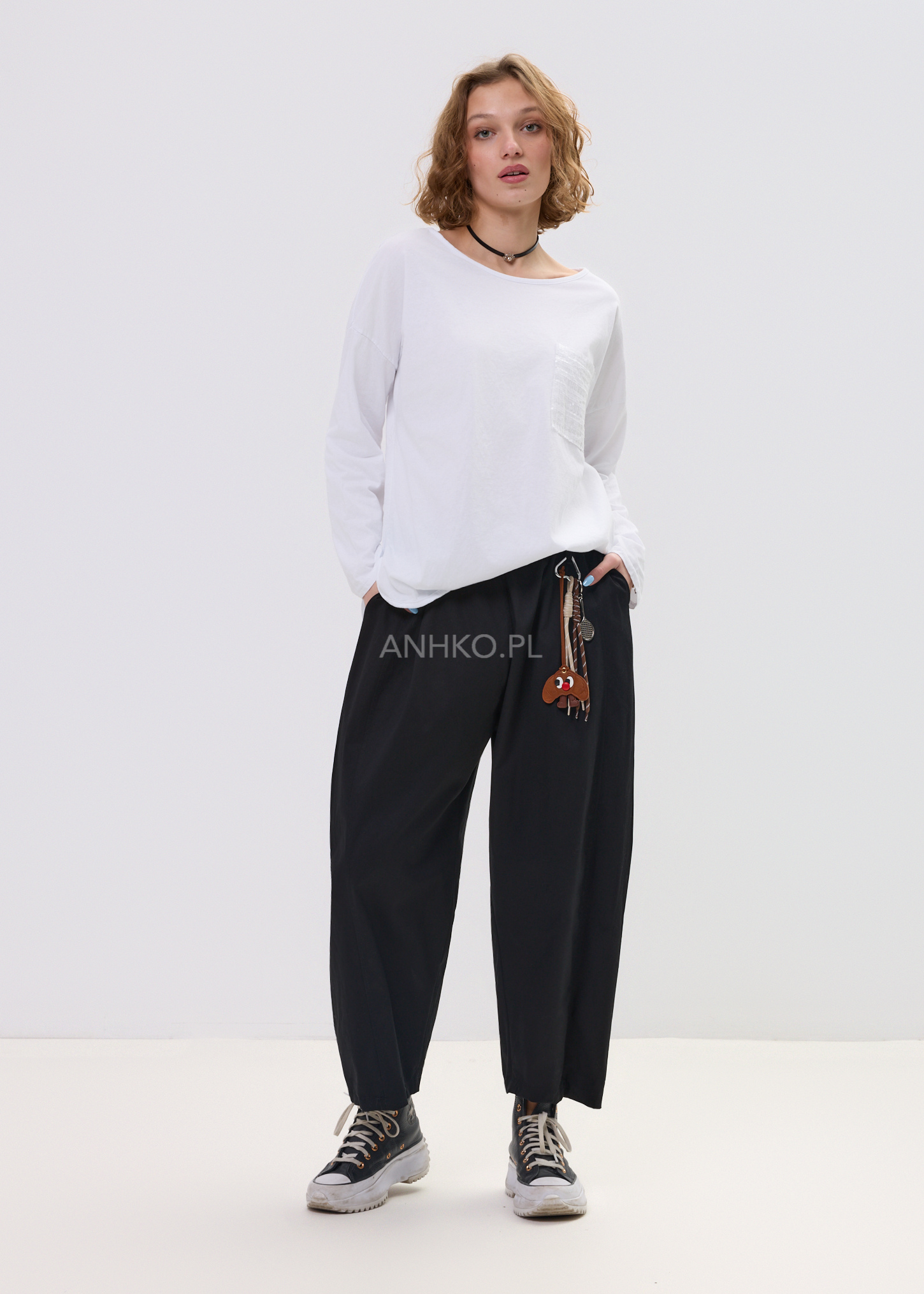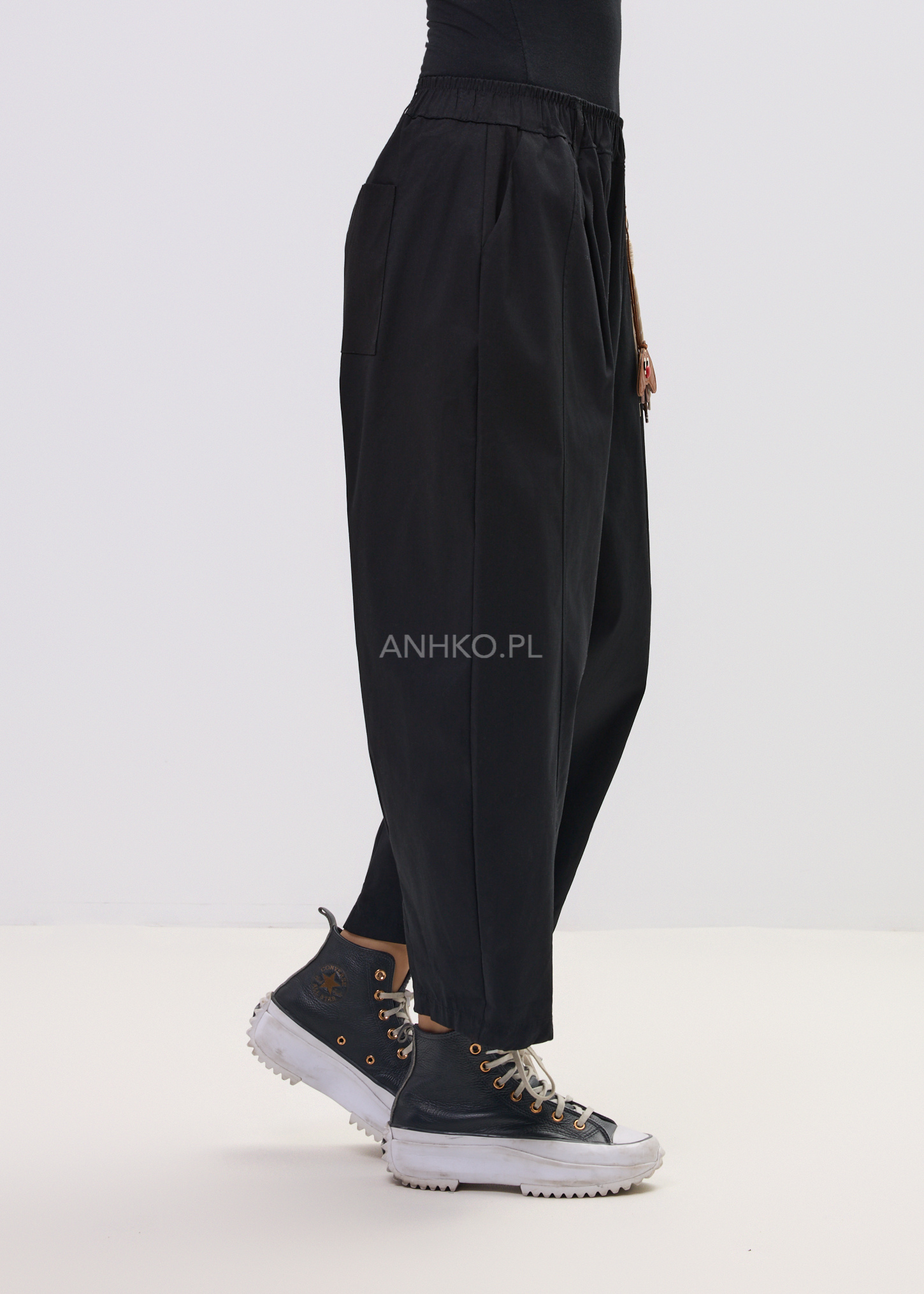 Elastyczny pas z regulowanym troczkiem pozwala idealnie dopasować spodnie do sylwetki, a praktyczne kieszenie zwiększają ich funkcjonalność. Całość dopełnia ozdobny brelok, który nadaje modelowi charakteru i subtelnego, miejskiego akcentu. To uniwersalny element garderoby, który świetnie komponuje się z T-shirtem, koszulą oversize czy lekkim swetrem, tworząc wygodny casualowy look na co dzień.