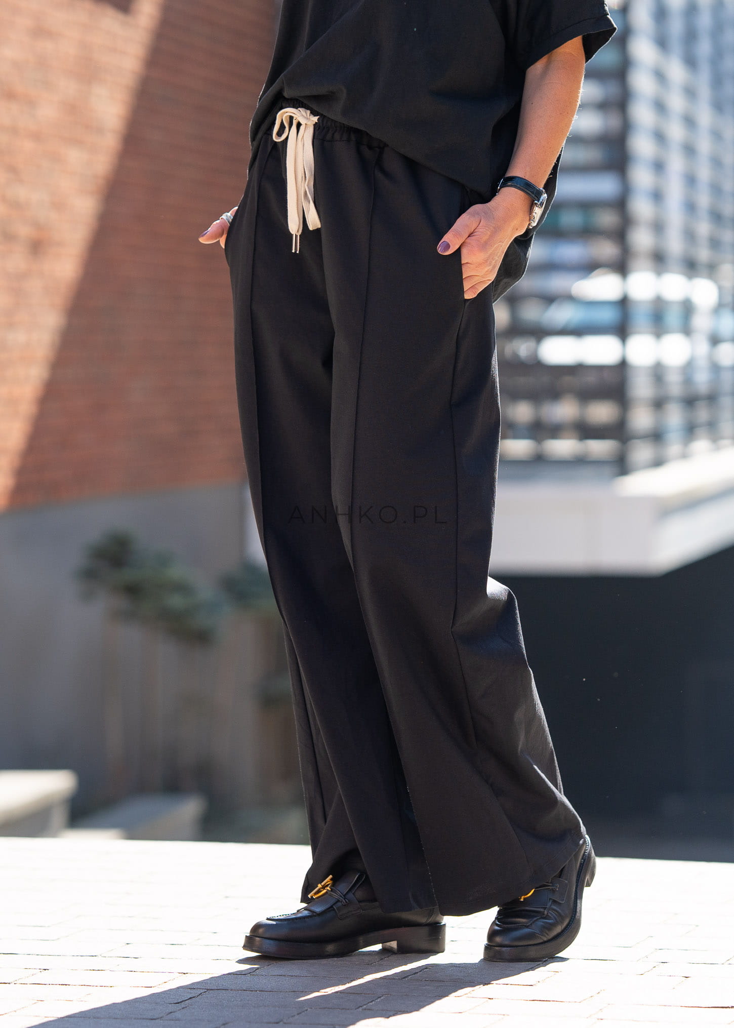 Elastyczna talia z kontrastowym troczkiem umożliwia indywidualne dopasowanie, a miękka, przyjemna w dotyku tkanina zapewnia komfort przez cały dzień. To uniwersalna baza stylizacji – od luźnych zestawów z t-shirtem po bardziej dopracowane połączenia z koszulą lub marynarką.
