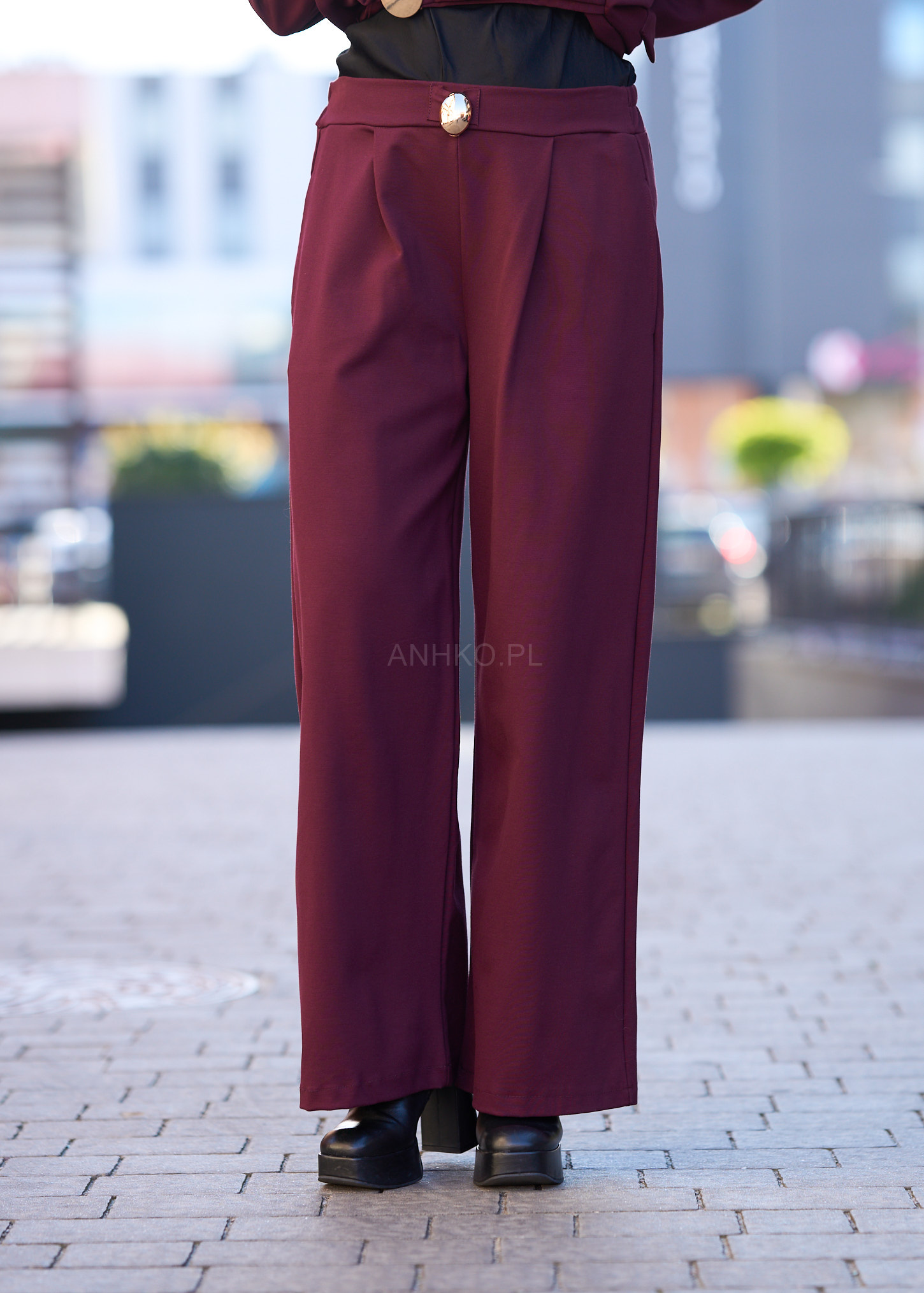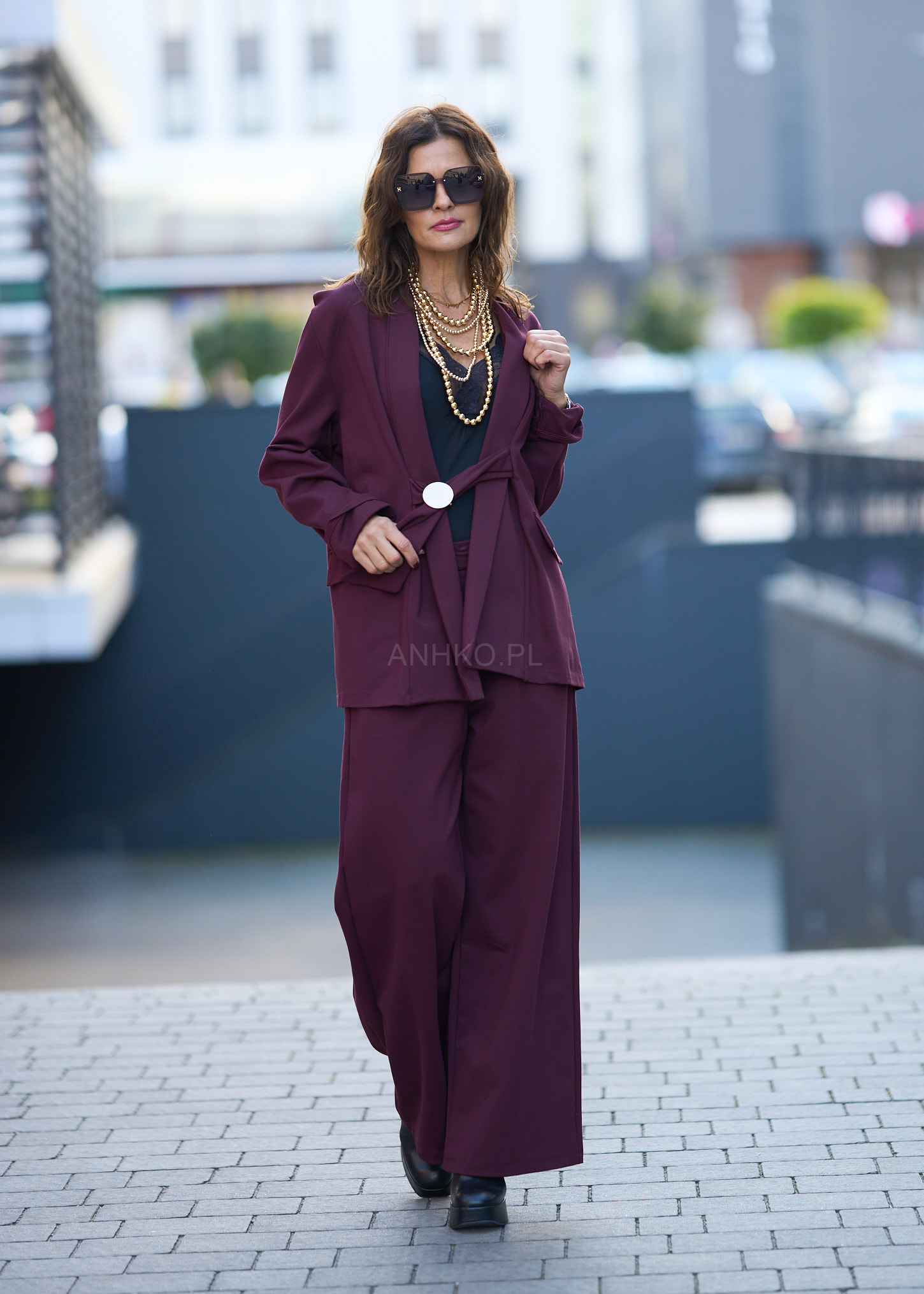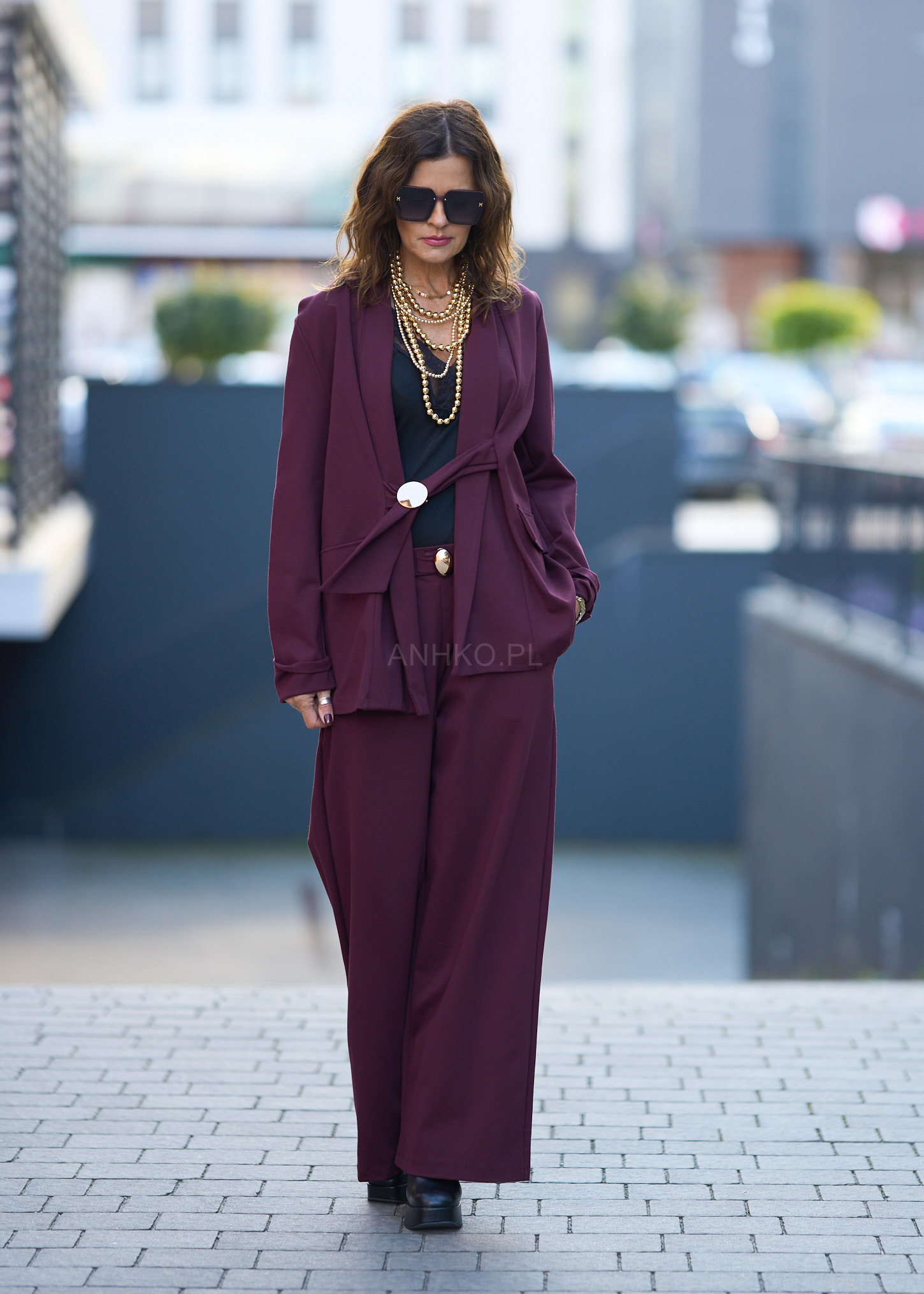 To klasyczne śliwkowe spodnie, które wyróżniają się eleganckim krojem i ponadczasowym stylem. Wykonane z wysokiej jakości włoskiej dzianiny z dodatkiem elastanu, zapewniają idealne dopasowanie i komfort noszenia. Model z wysokim stanem optycznie wydłuża sylwetkę, a złoty guzik w pasie dodaje subtelnego, stylowego akcentu. Spodnie mają proste, lekko rozszerzane nogawki oraz praktyczne kieszenie. Doskonale sprawdzą się zarówno do eleganckich koszul i marynarek, jak i luźniejszych bluzek czy swetrów. Idealne na spotkania biznesowe, do biura, na kolacje czy bardziej formalne wyjścia.