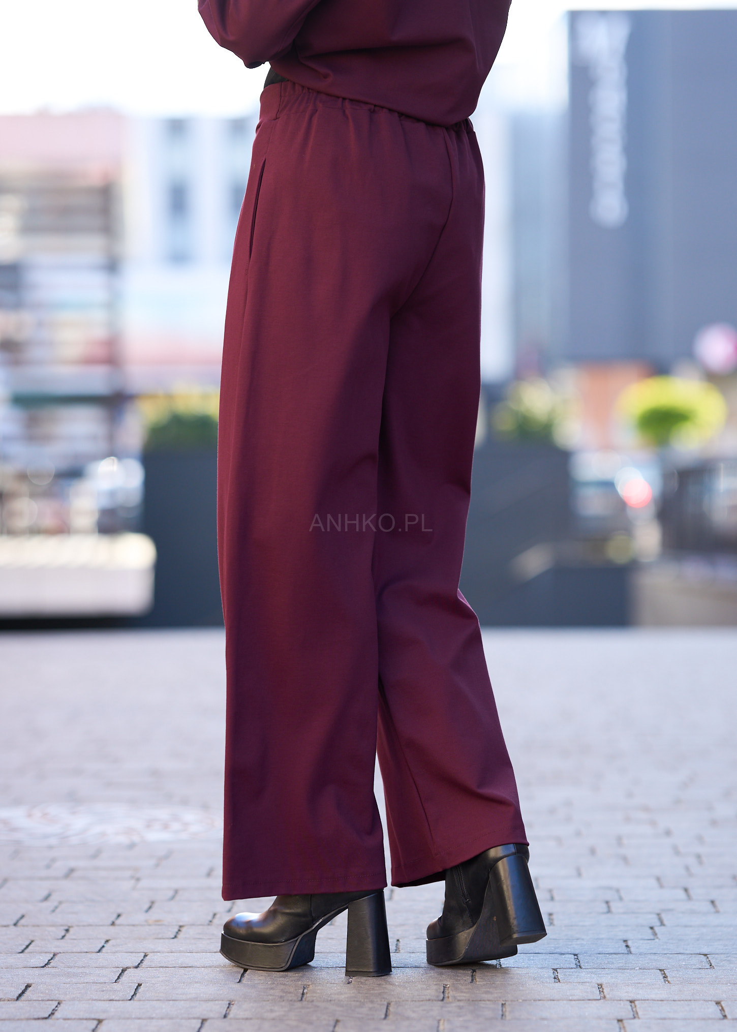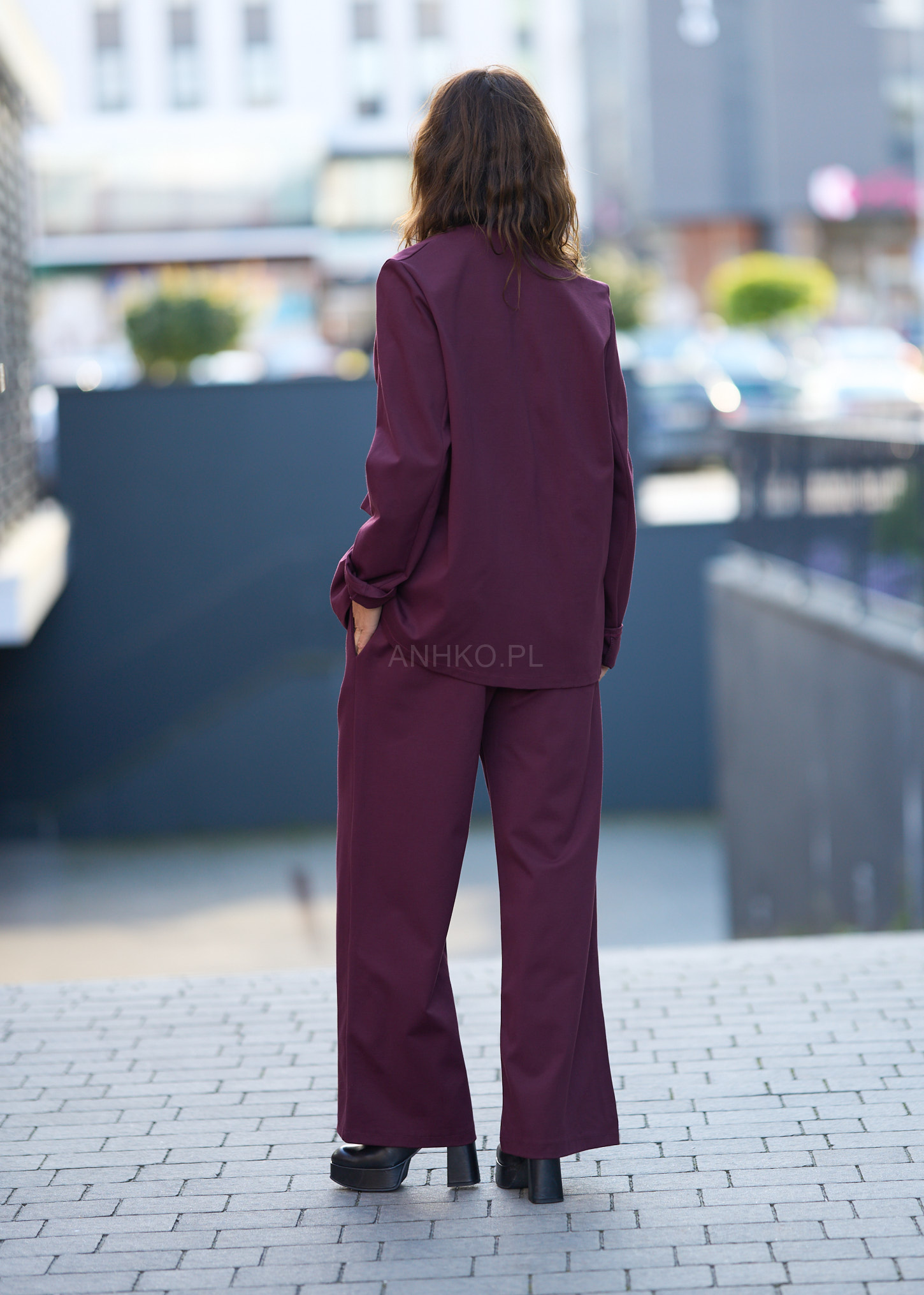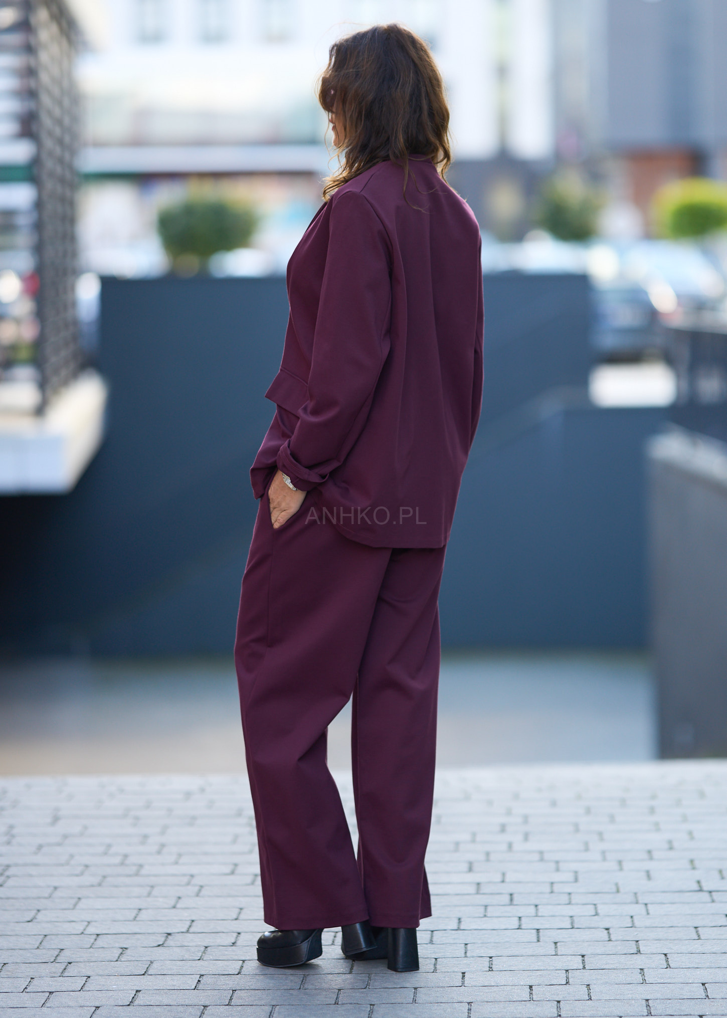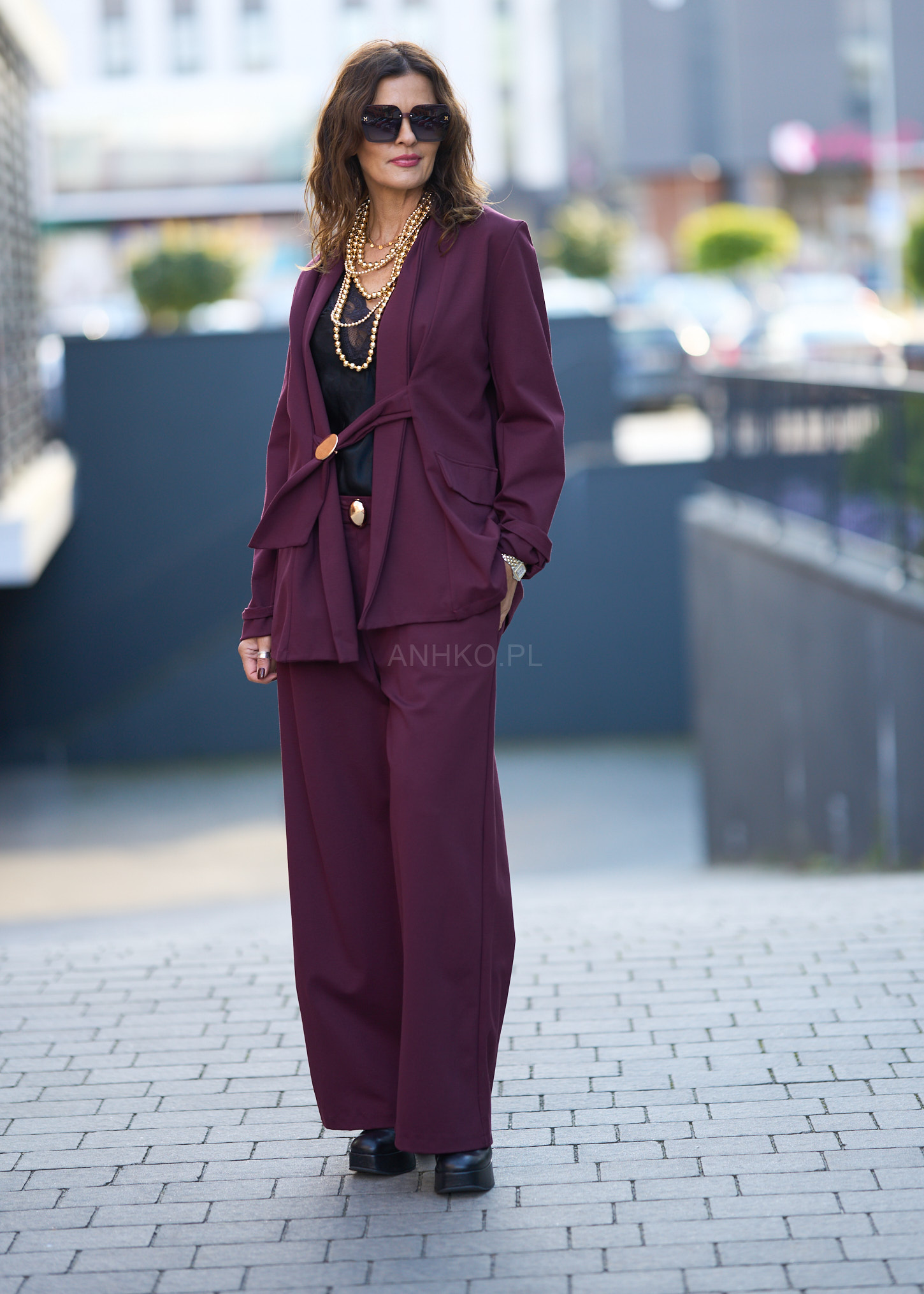 To klasyczne śliwkowe spodnie, które wyróżniają się eleganckim krojem i ponadczasowym stylem. Wykonane z wysokiej jakości włoskiej dzianiny z dodatkiem elastanu, zapewniają idealne dopasowanie i komfort noszenia. Model z wysokim stanem optycznie wydłuża sylwetkę, a złoty guzik w pasie dodaje subtelnego, stylowego akcentu. Spodnie mają proste, lekko rozszerzane nogawki oraz praktyczne kieszenie. Doskonale sprawdzą się zarówno do eleganckich koszul i marynarek, jak i luźniejszych bluzek czy swetrów. Idealne na spotkania biznesowe, do biura, na kolacje czy bardziej formalne wyjścia.