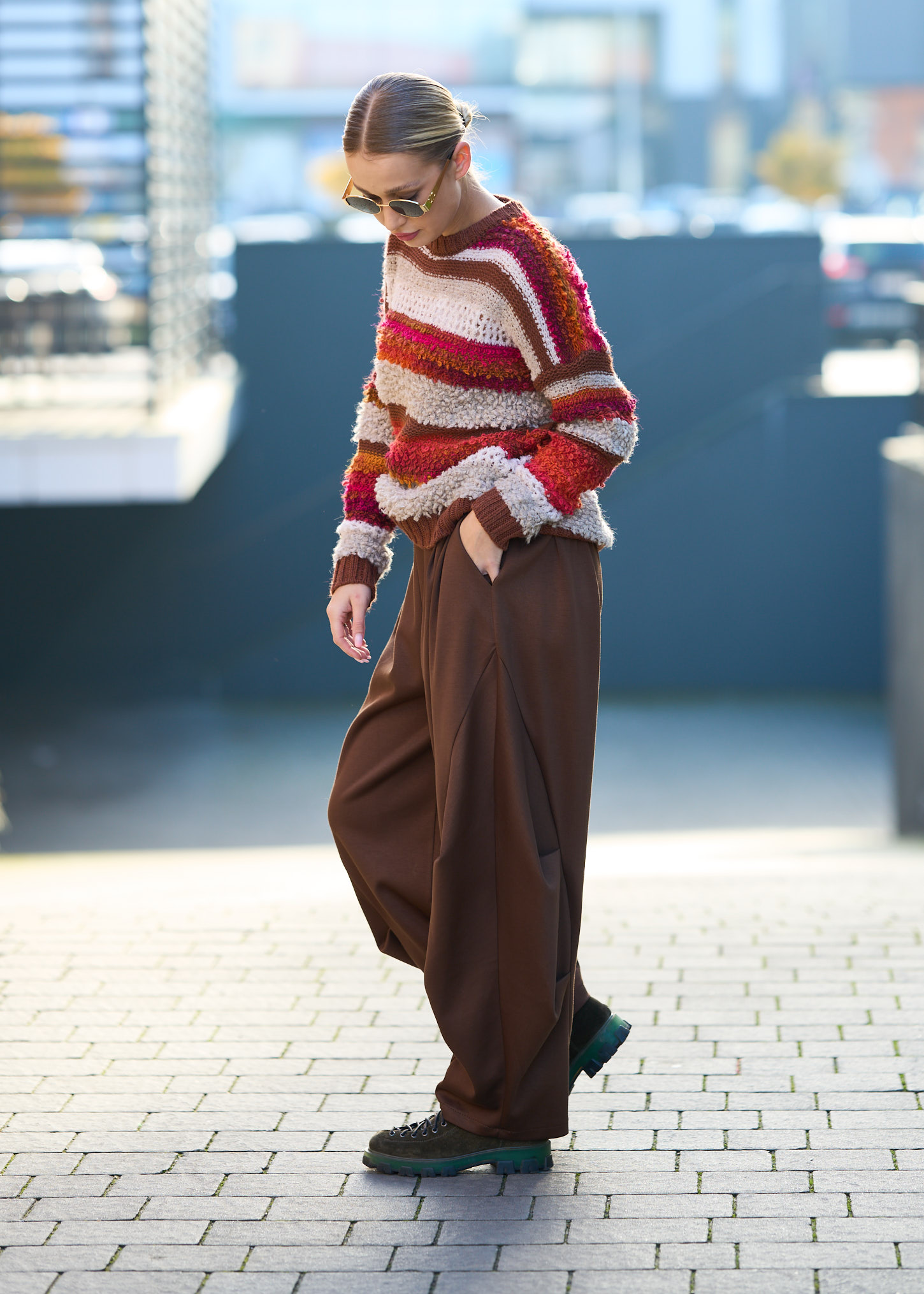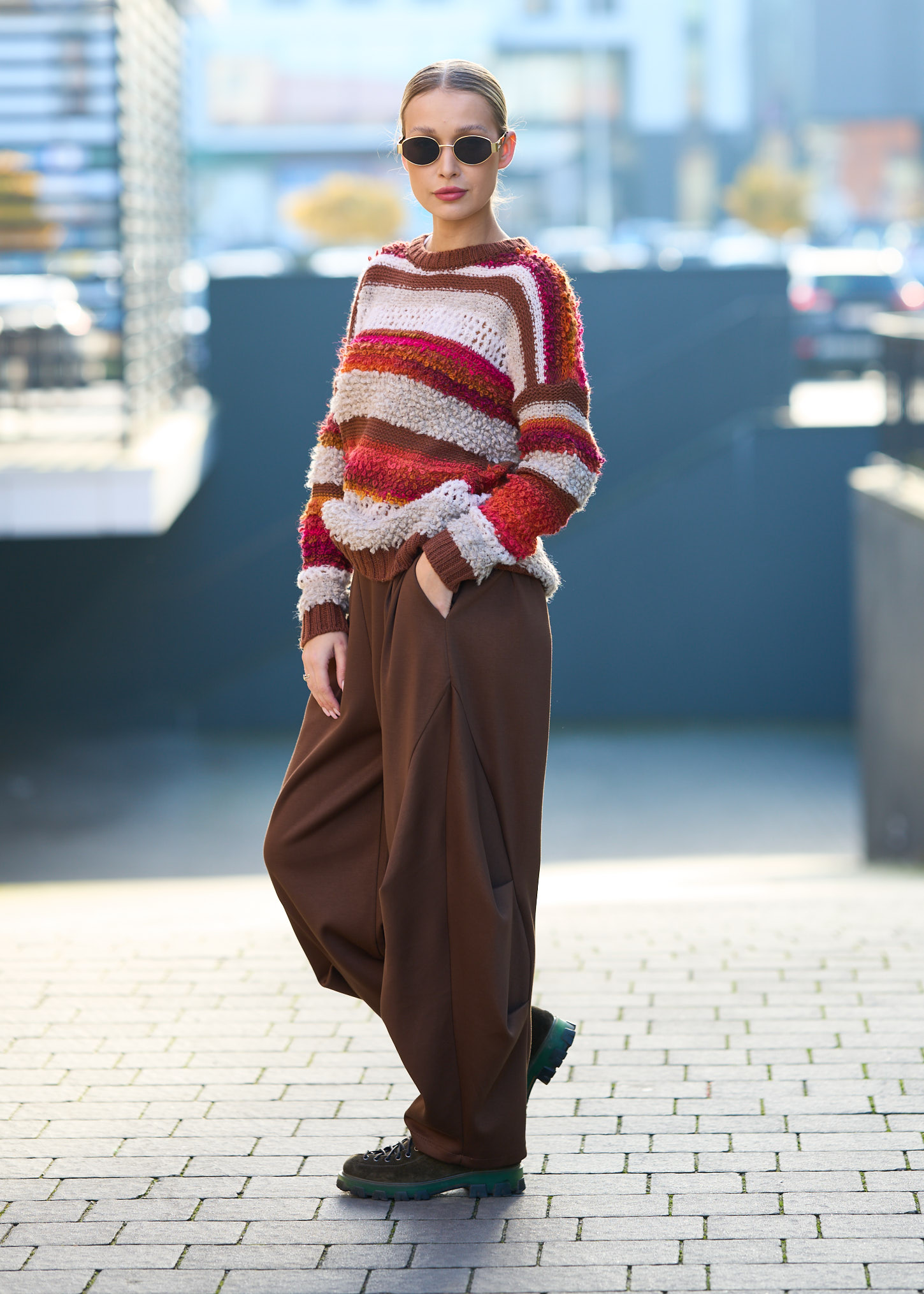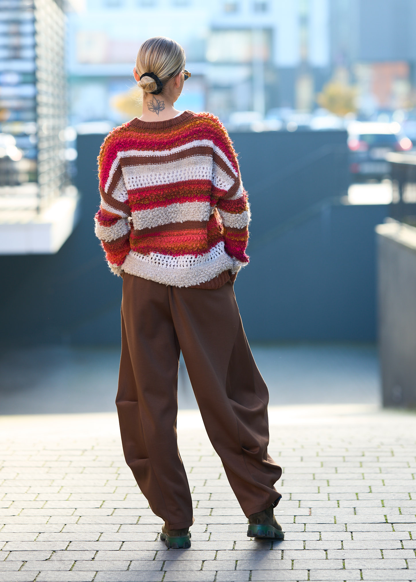 Sweter z Dodatkiem Alpaki Conola Pomarańczowy - Miękki, wielokolorowy sweter z mieszanki akrylu, poliestru, wełny i alpaki. Idealny na chłodne dni, łączy ciepło z oryginalnym stylem dzięki unikalnym, poziomym pasom w naturalnych barwach.