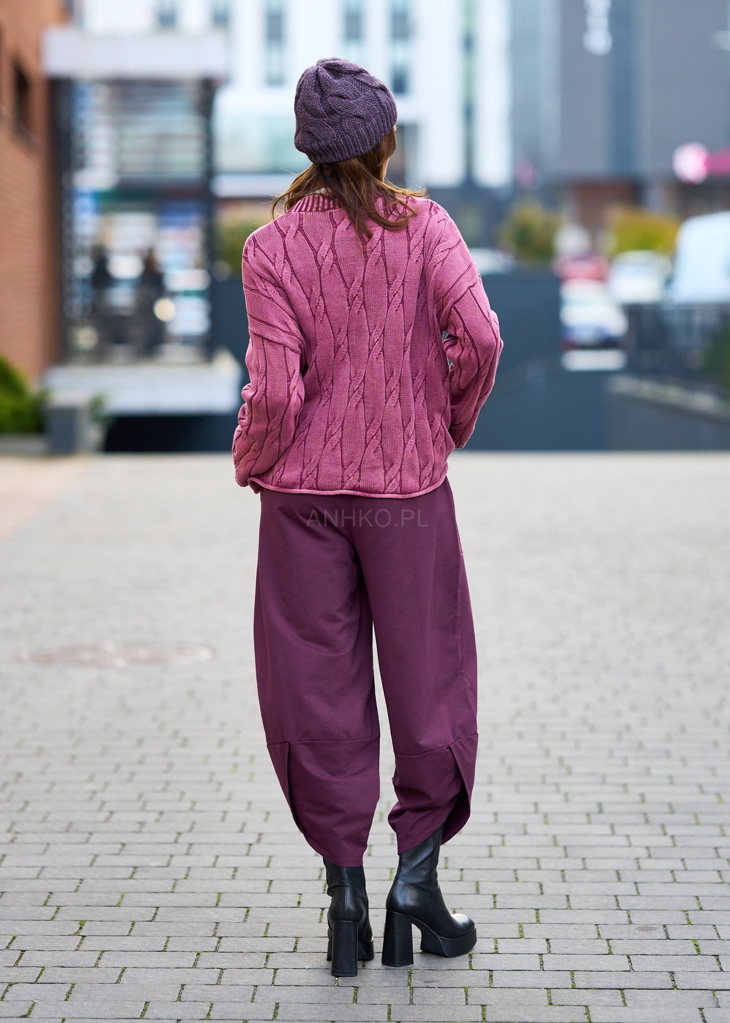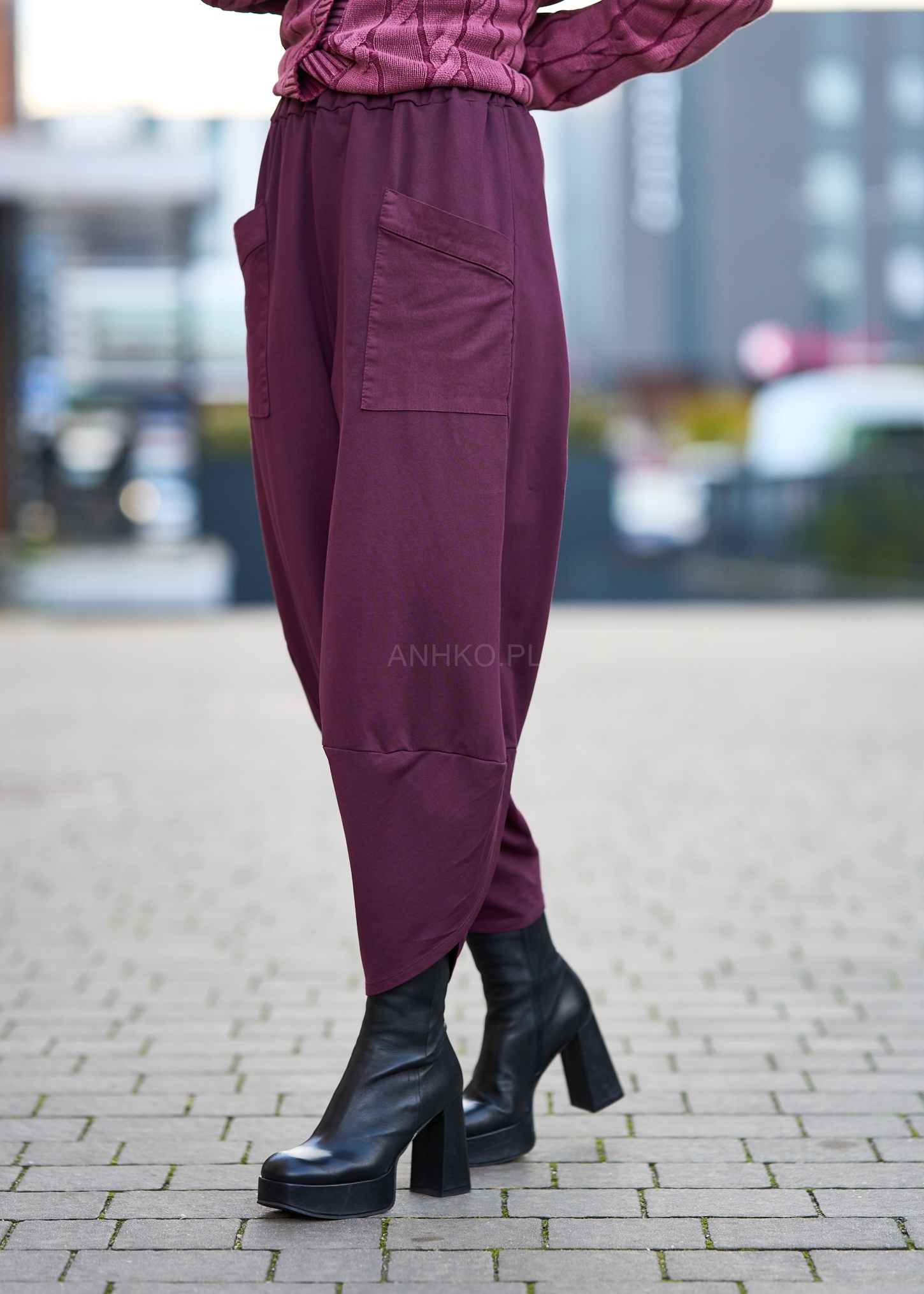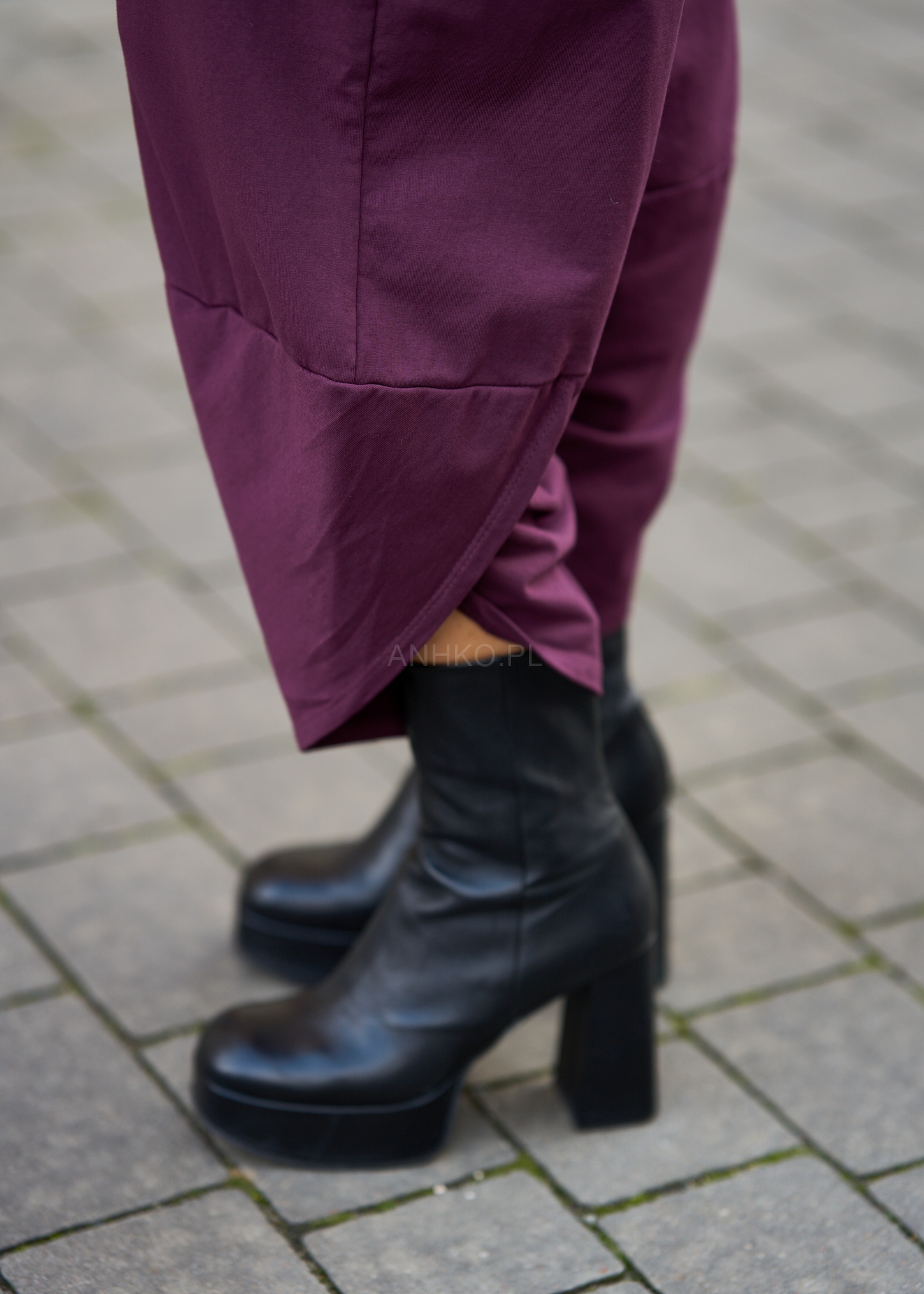Te spodnie damskie w odcieniu śliwkowym wyróżniają się unikalnym krojem typu bombka, który miękko modeluje sylwetkę i nadaje stylizacji modowego charakteru. Luźna forma swobodnie układa się na ciele, zapewniając pełen komfort noszenia oraz efekt lekkiej objętości, który przyciąga uwagę.