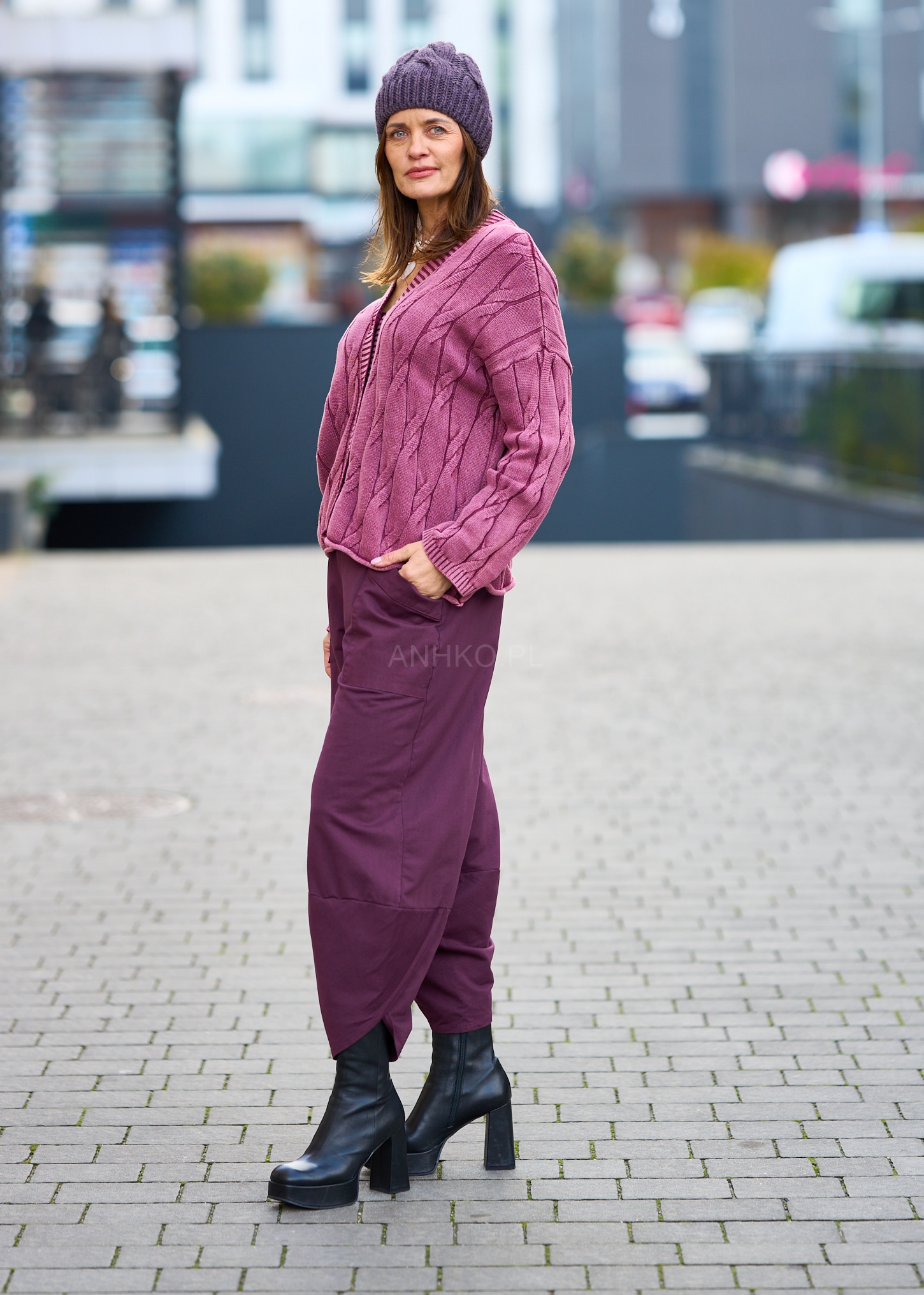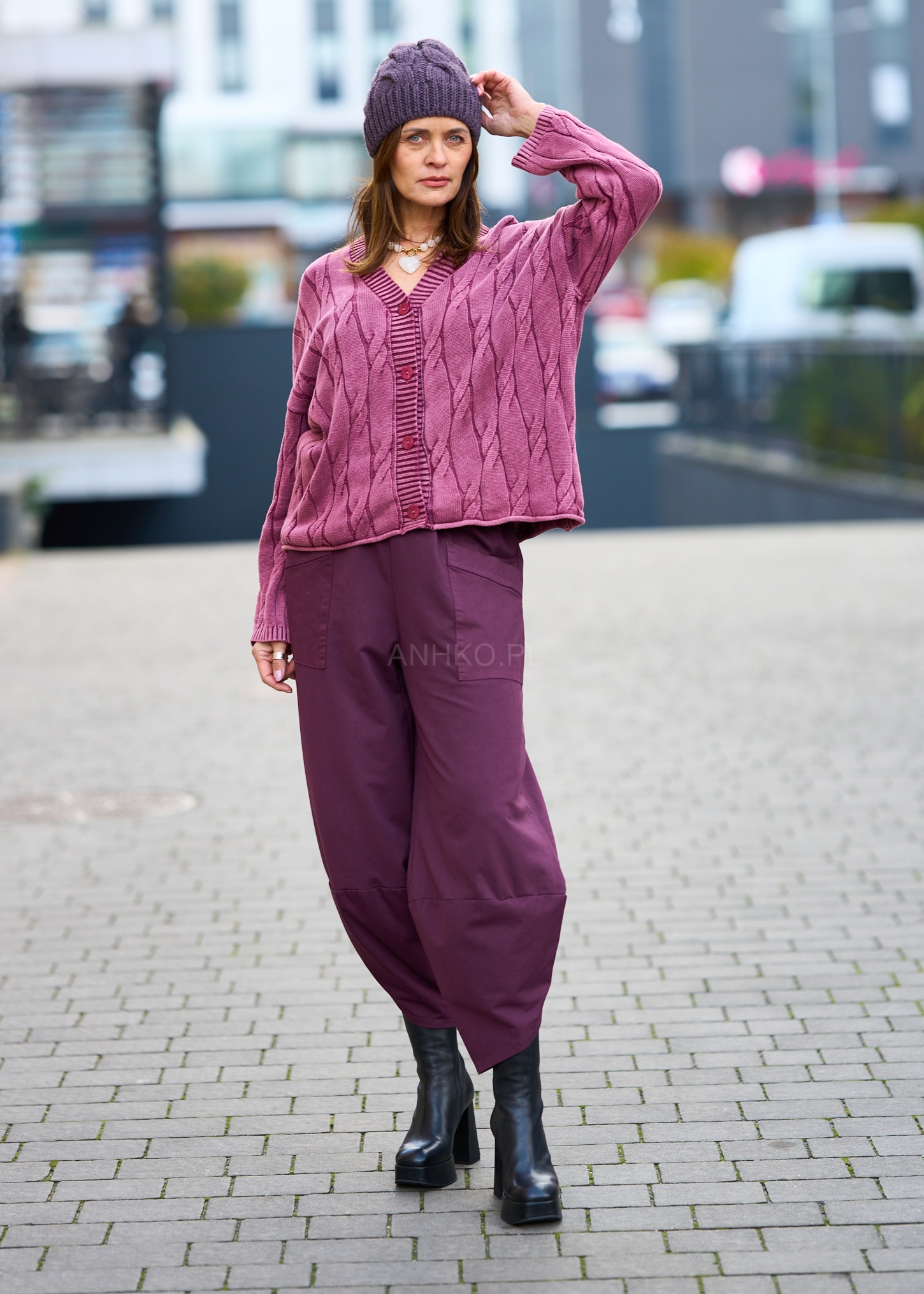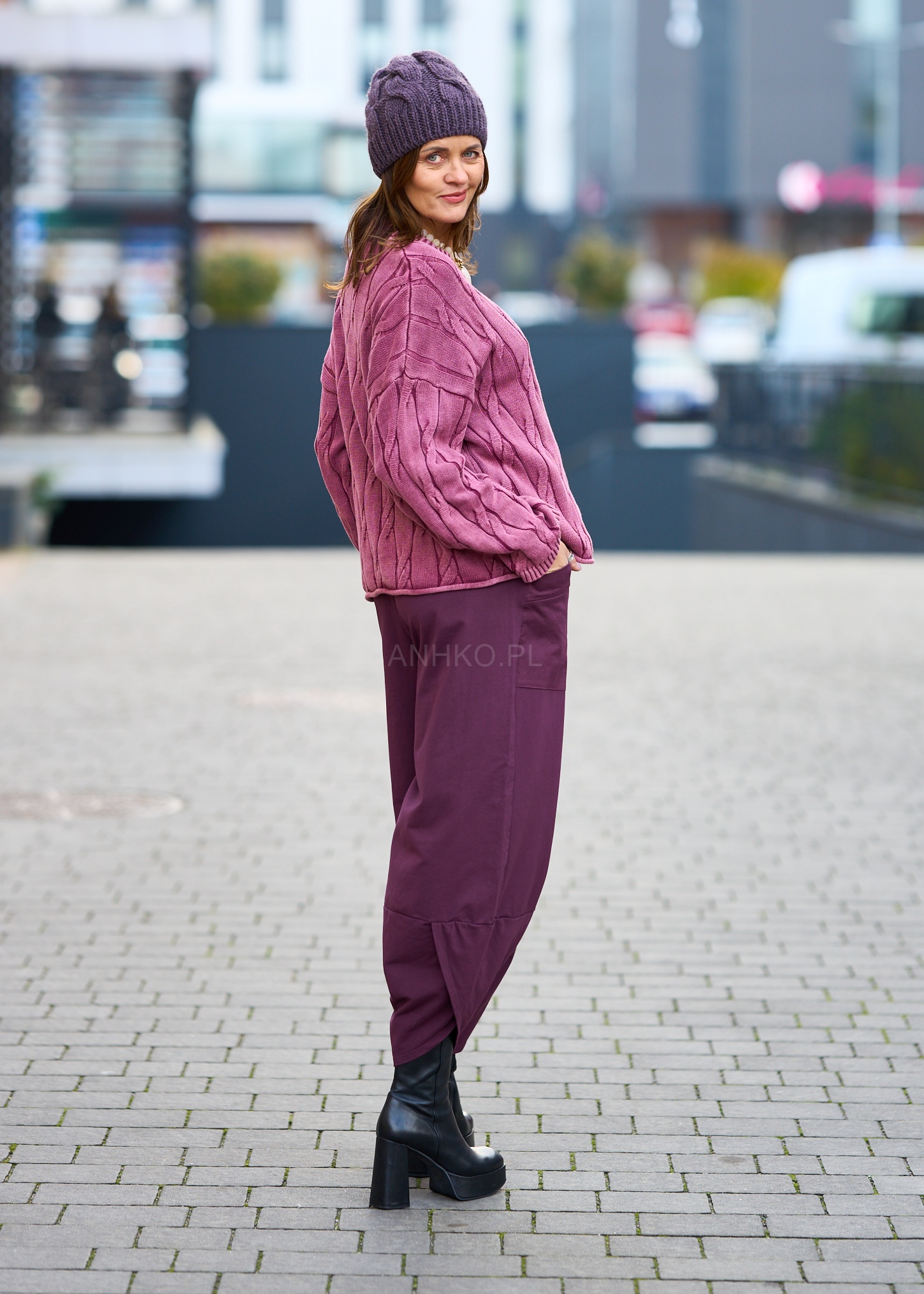 Te spodnie damskie w odcieniu śliwkowym wyróżniają się unikalnym krojem typu bombka, który miękko modeluje sylwetkę i nadaje stylizacji modowego charakteru. Luźna forma swobodnie układa się na ciele, zapewniając pełen komfort noszenia oraz efekt lekkiej objętości, który przyciąga uwagę.