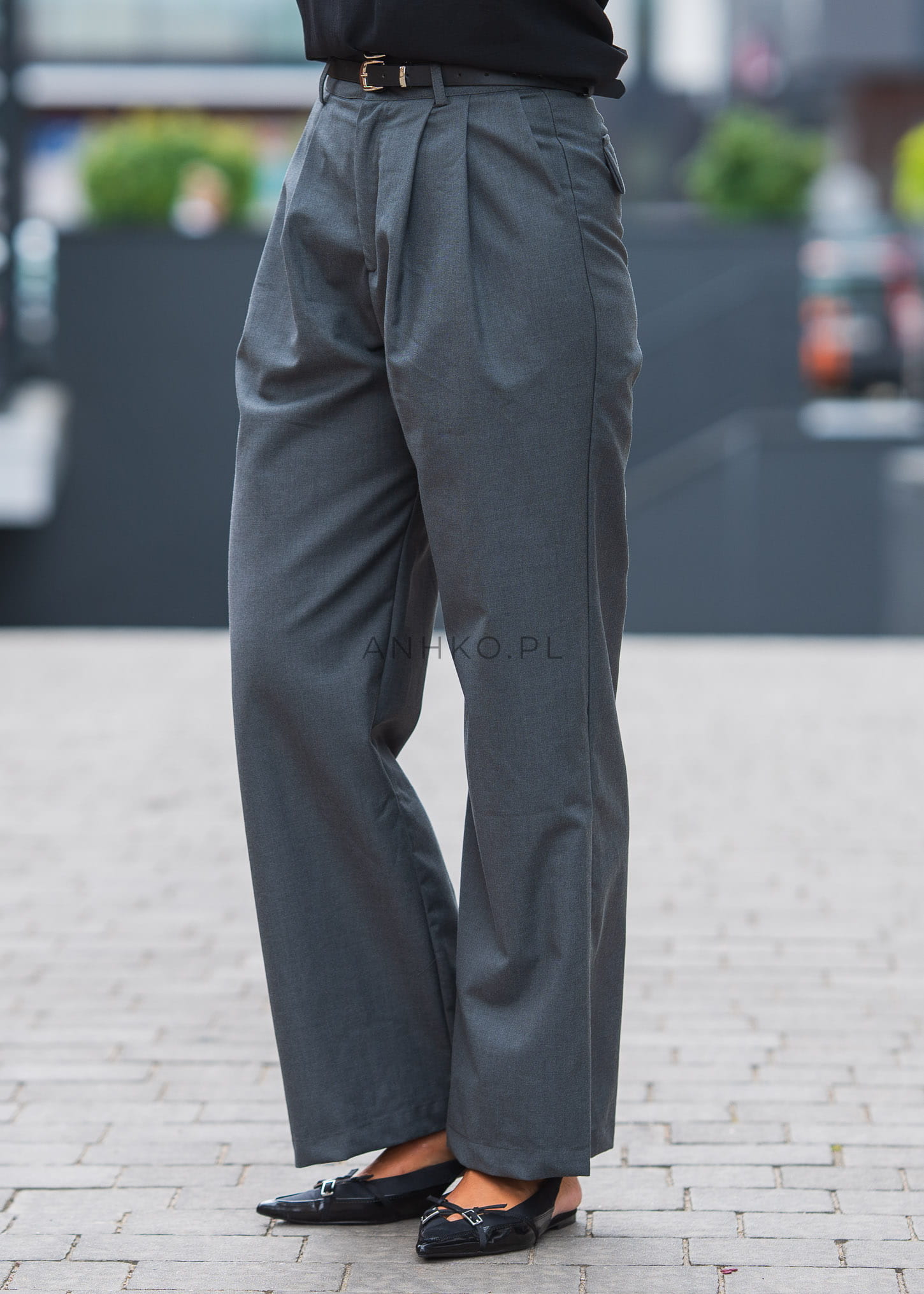 Antracytowe garniturowe spodnie o wysokim stanie, zapinane na dwa guziki oraz zamek błyskawiczny. Posiadają szlufki w pasie oraz w zestawie dwa paski do wyboru. Nogawka jest szeroka, lecz prosta, co nadaje im elegancki i nowoczesny wygląd.