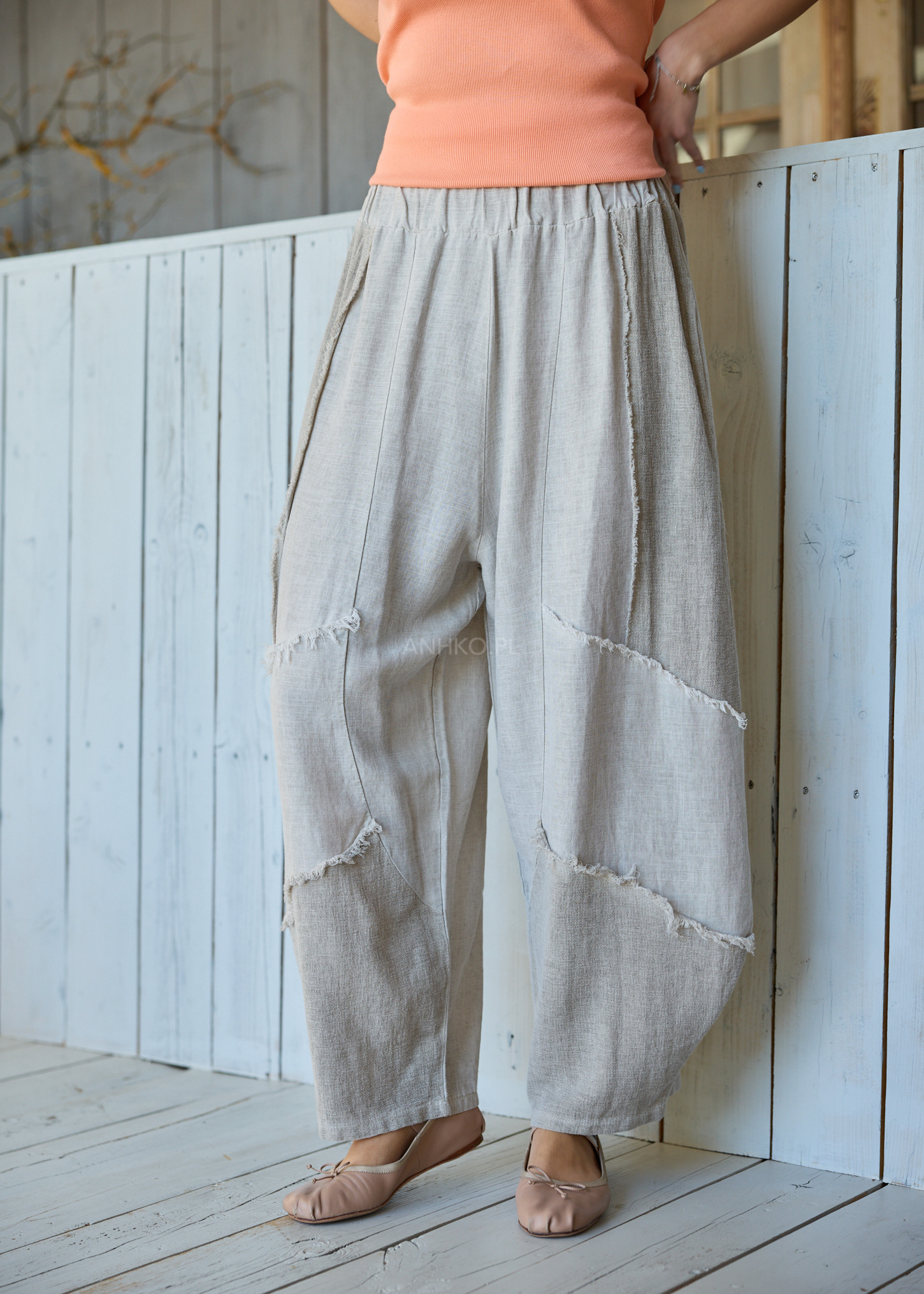 Wyjątkowe surowe przeszycia oraz patchworkowy efekt sprawiają, że model wyróżnia się na tle klasycznych fasonów. To idealna baza do stylizacji – od minimalistycznych zestawów z topem po bardziej wyraziste looki z lnianą koszulą lub oversize’ową bluzą.