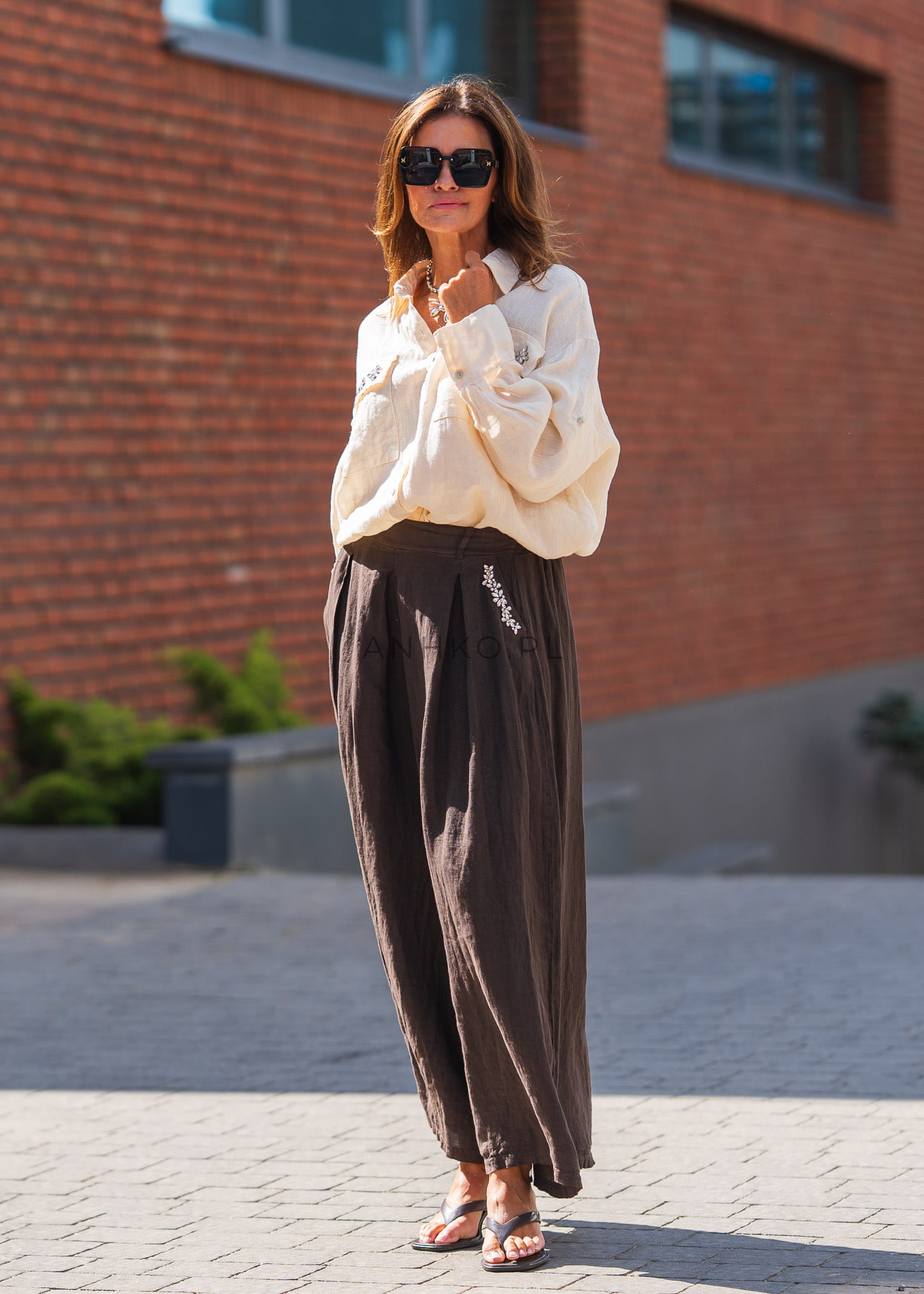 Koszula Lniana Crystal Glam Brązowa - Elegancka koszula z 100% lnu z ozdobnymi kryształkami na kieszeniach. Swobodny krój, klasyczny kołnierzyk i długi rękaw sprawiają, że to doskonały wybór zarówno na co dzień, jak i na specjalne okazje.