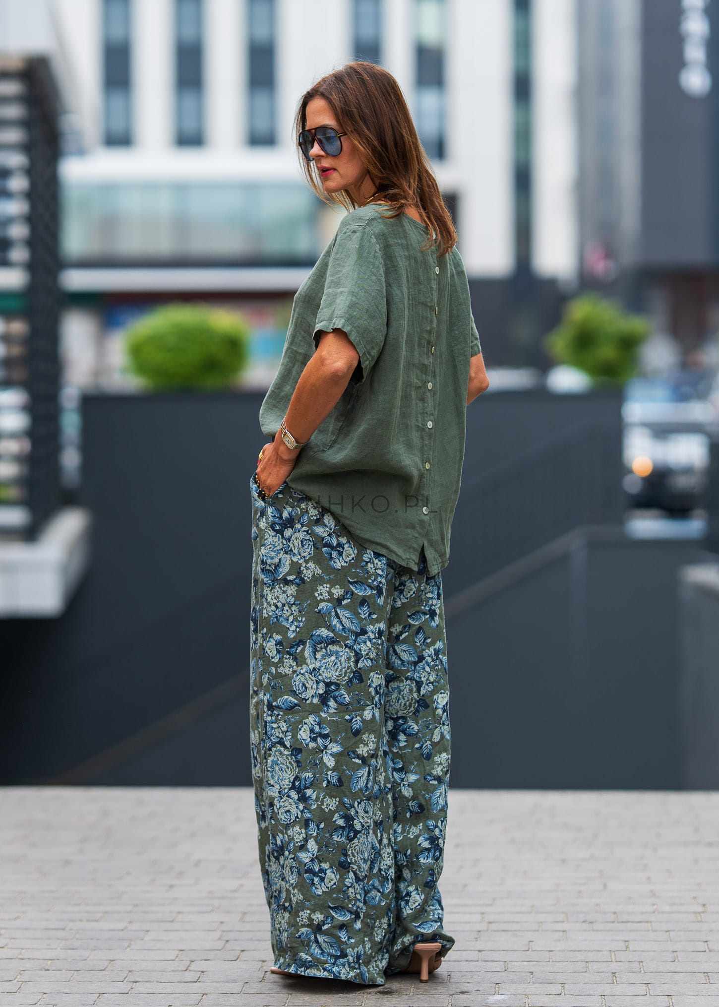 Odkryj letnią lekkość i naturalną elegancję. Wykonane w 100% z wysokogatunkowego lnu, spodnie oferują maksymalny komfort w ciepłe dni, a jednocześnie zachwycają subtelnym, roślinnym wzorem w odcieniach błękitu i zieleni. Elastyczny pas zapewnia wygodne dopasowanie, a luźny krój dodaje swobody. Świetnie pasują do białej bluzki, topu na ramiączkach, a także sandałów lub espadryli. Idealne na spacer po mieście, wyjazd nad morze, czy codzienne stylizacje w duchu boho i eko. Te spodnie to must-have każdej letniej garderoby.