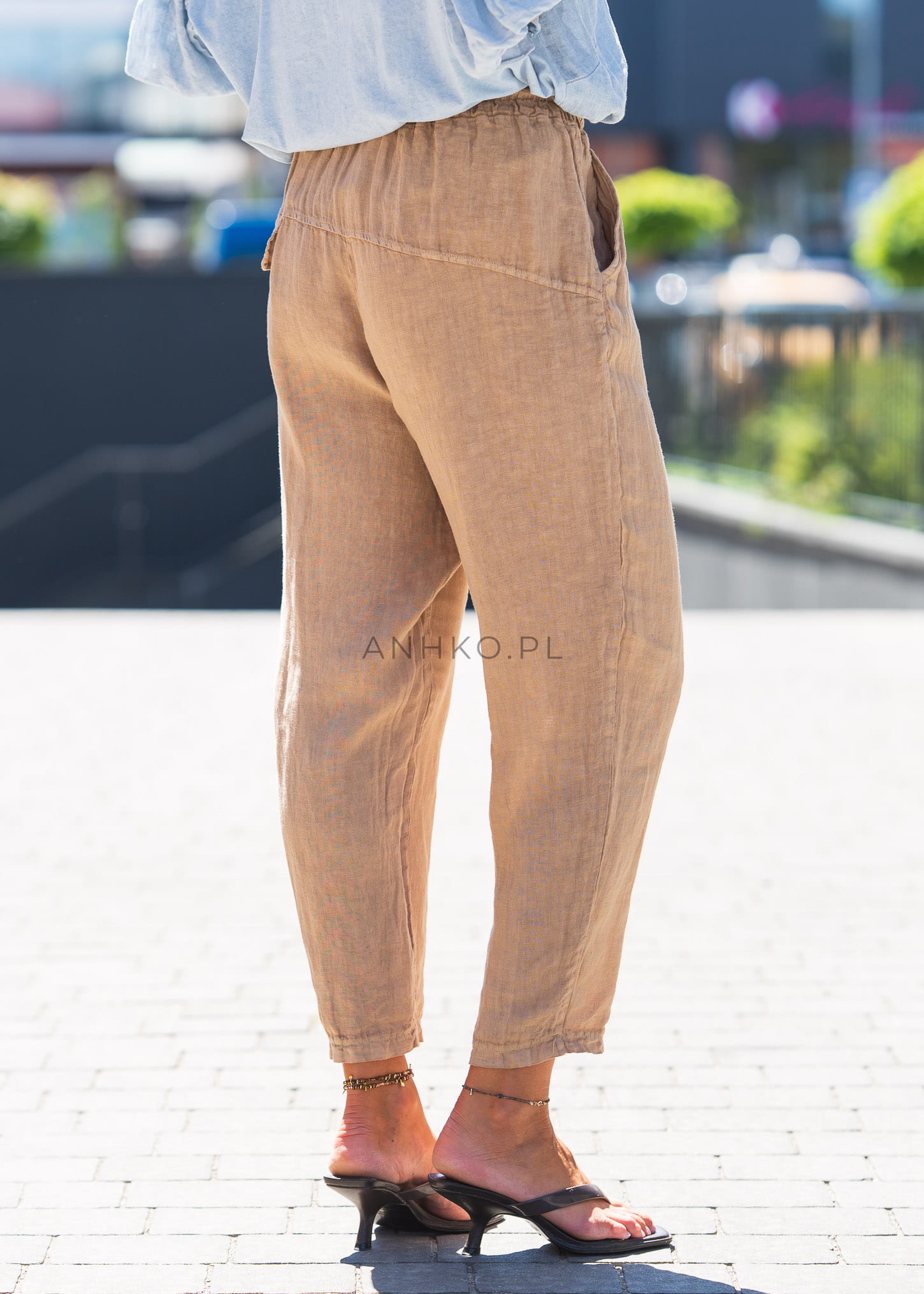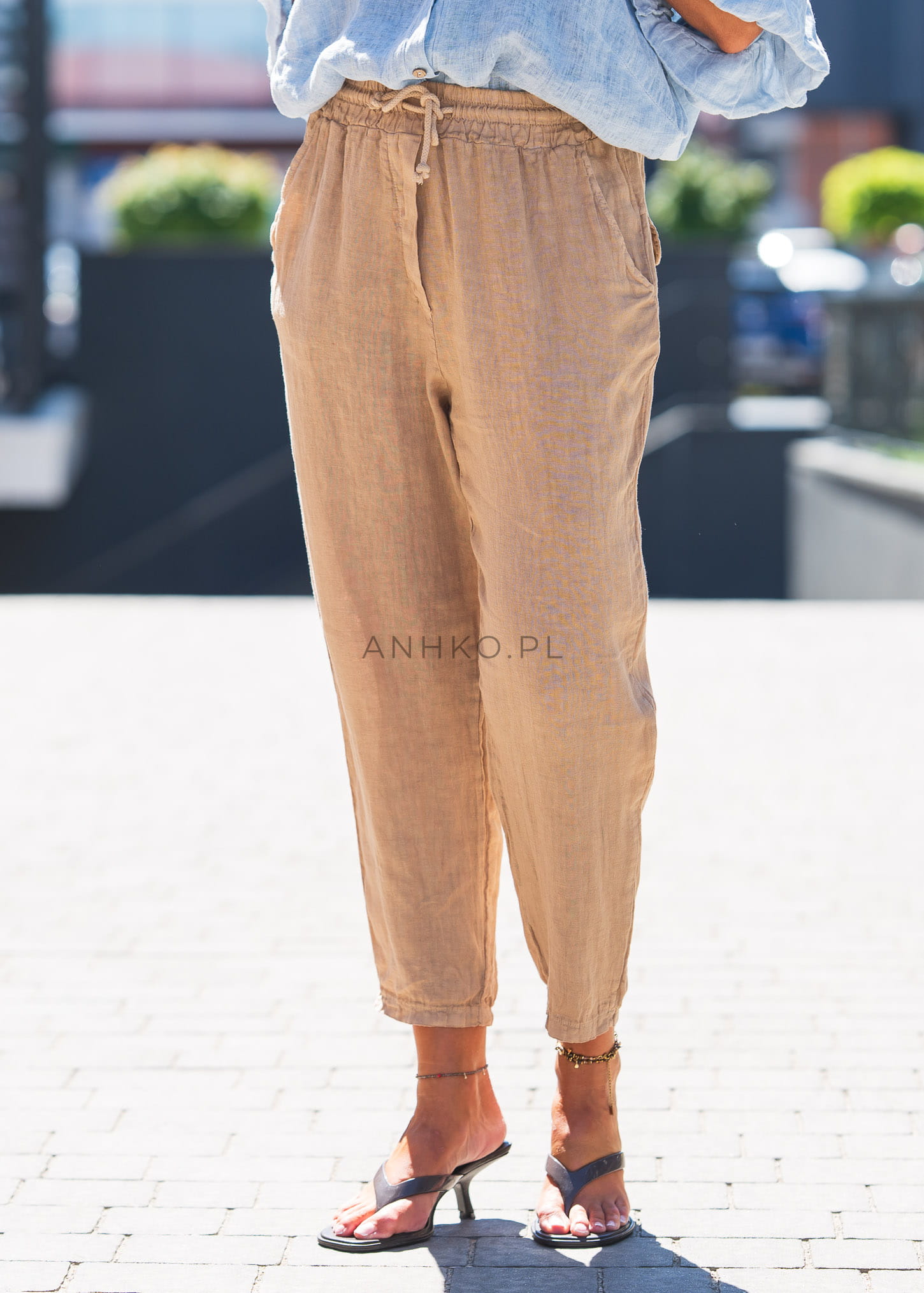 To lekkie i przewiewne spodnie wykonane w 100% z naturalnego lnu. Ich świeży, camel kolor dodaje subtelnej elegancji, a elastyczny pas ze sznurkiem gwarantuje wygodne dopasowanie. Wyposażone w praktyczne kieszenie oraz tylne patki, świetnie sprawdzą się na spacer, urlop, a także do biura w połączeniu z białą koszulą. Idealne do noszenia z sandałami, trampkami lub espadrylami. Lniana struktura tkaniny sprawia, że skóra oddycha nawet w najcieplejsze dni, a stylowy krój pozwala na wiele modnych kombinacji. Must-have w każdej letniej garderobie!