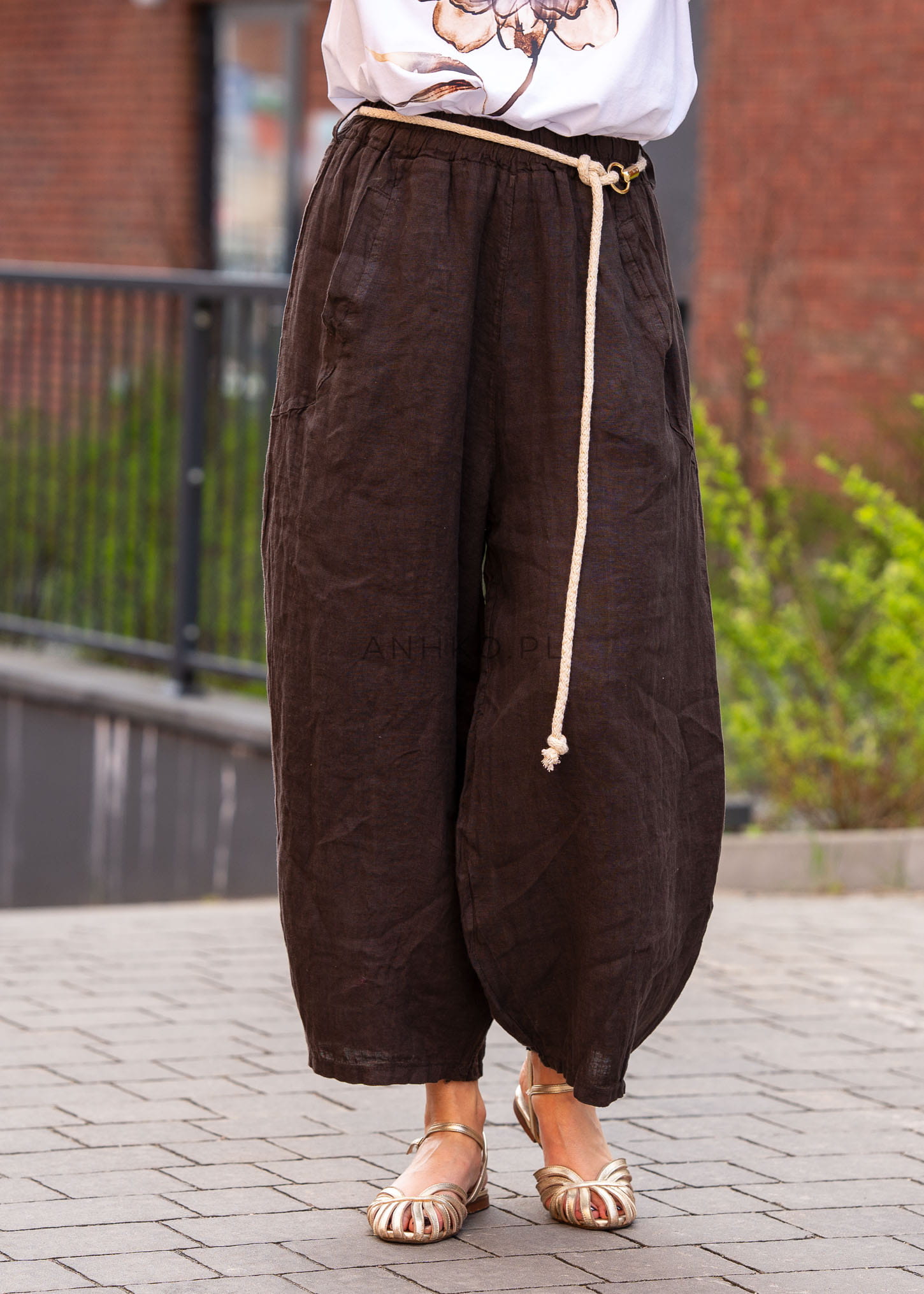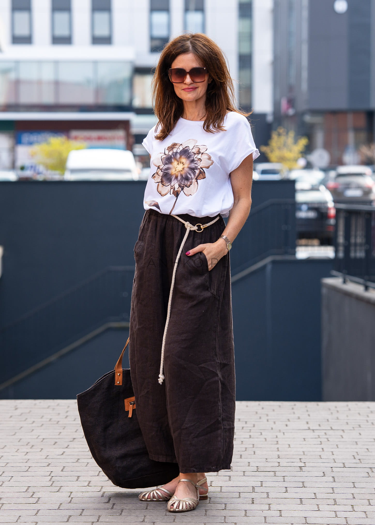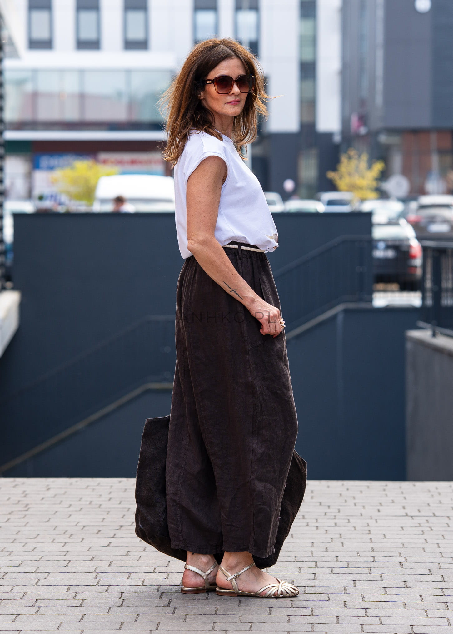 Ciemnobrązowy kolor dodaje całości elegancji i ponadczasowego charakteru, a ozdobny sznurek w pasie z metalowym detalem podkreśla unikalny styl. Szerokie nogawki tworzą nowoczesną sylwetkę, która świetnie współgra zarówno z dopasowaną górą, jak i luźniejszymi formami.