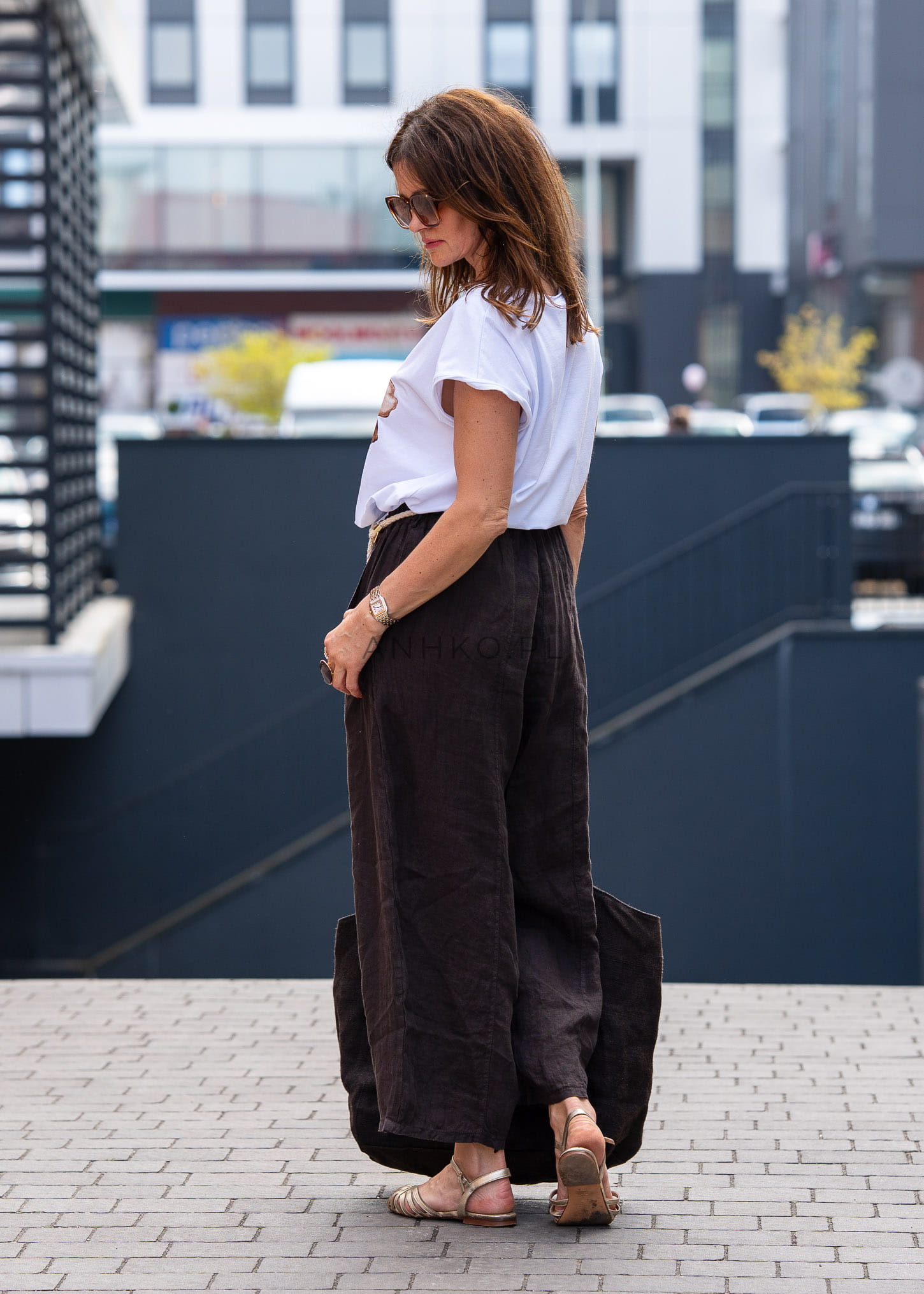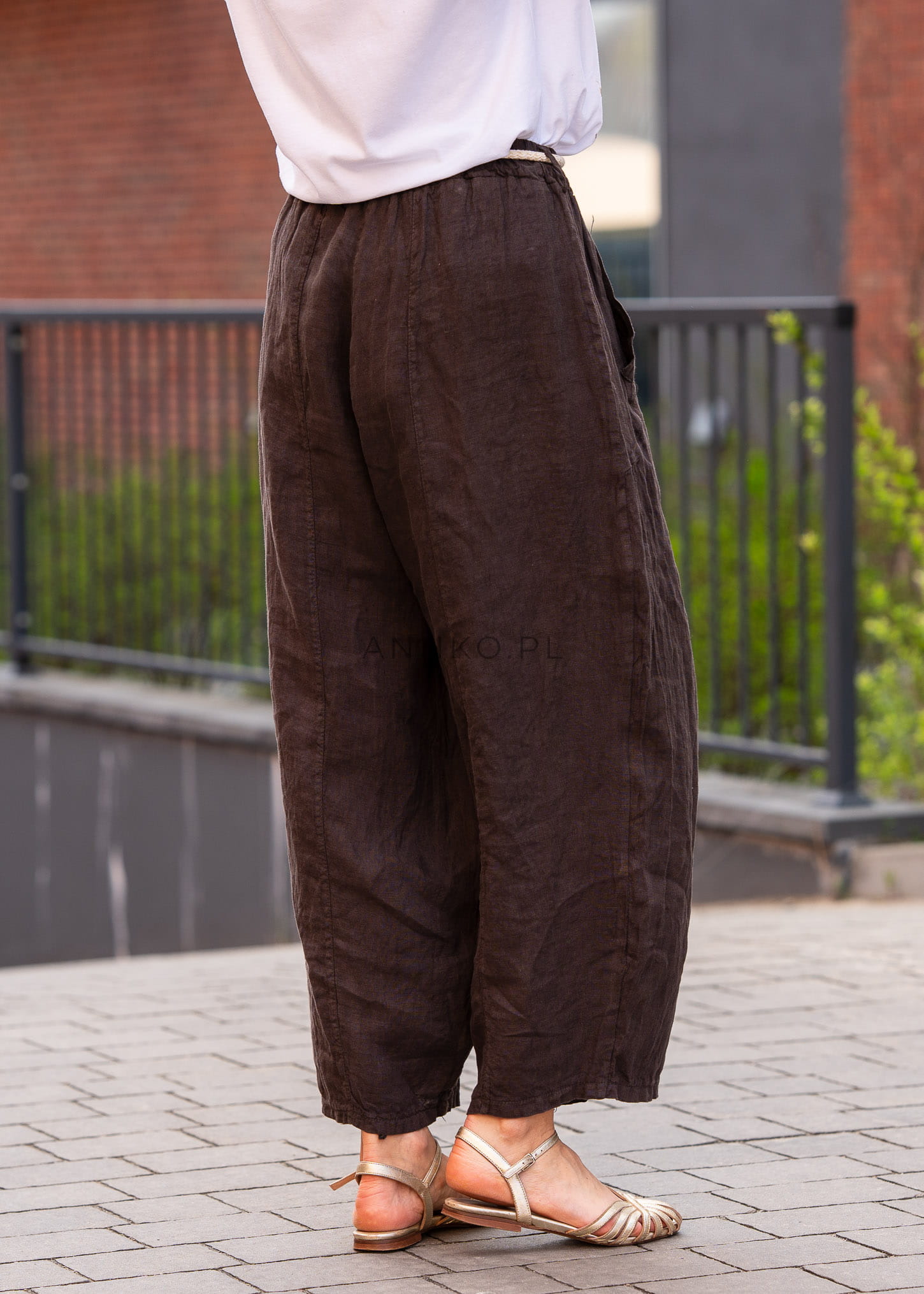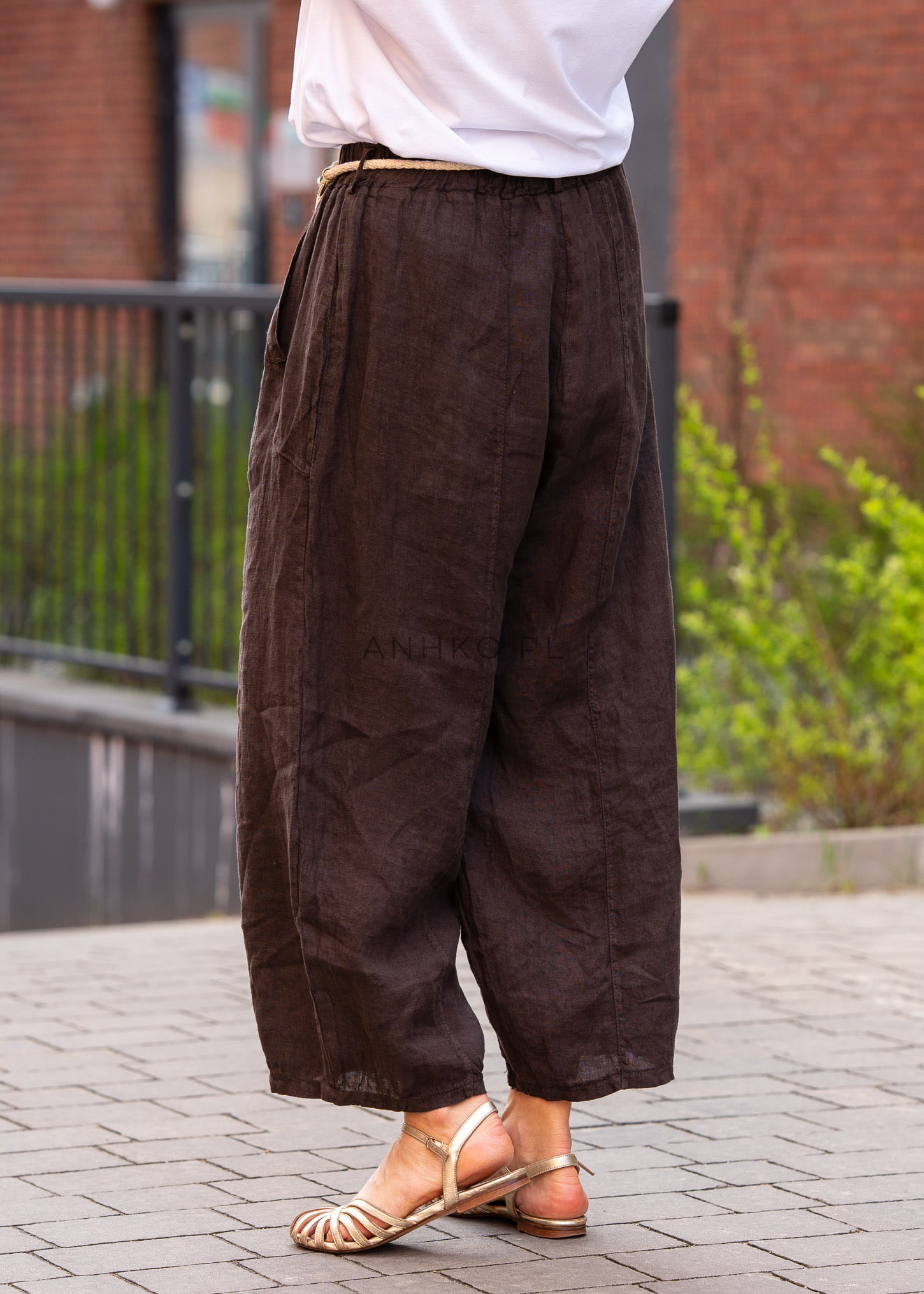 Te lniane spodnie damskie o luźnym, lekko balonowym kroju pięknie układają się na sylwetce, zapewniając swobodę i komfort noszenia. Elastyczny pas dopasowuje się do talii, a naturalna, przewiewna tkanina sprawia, że model doskonale sprawdza się w codziennych stylizacjach.