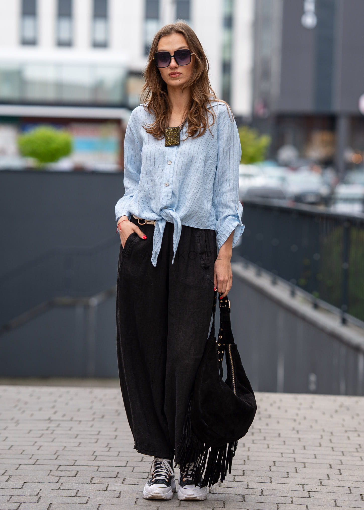 Koszula Lniana Tie Ivy Błękitna - Lekka bluzka z lnu w jasnoniebieskim odcieniu z delikatnymi paskami, zapinana na guziki z ozdobnym dołem wiązanym z przodu.