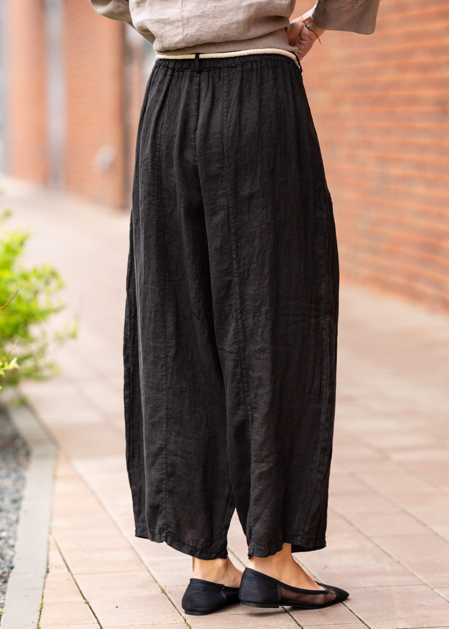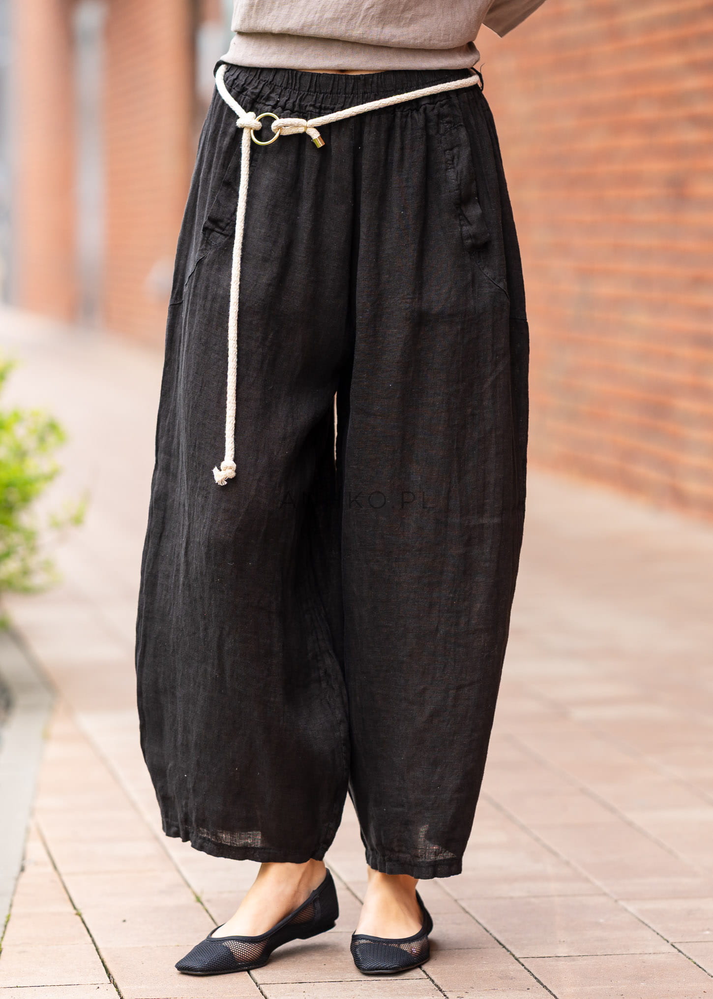 Te lniane spodnie damskie wyróżniają się luźnym, lekko balonowym krojem, który miękko układa się na sylwetce i zapewnia maksymalny komfort. Elastyczny pas dopasowuje się do talii, a naturalna tkanina pozwala skórze oddychać, tworząc idealną bazę dla codziennych stylizacji.